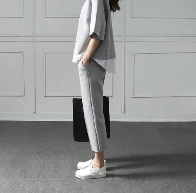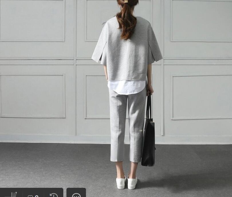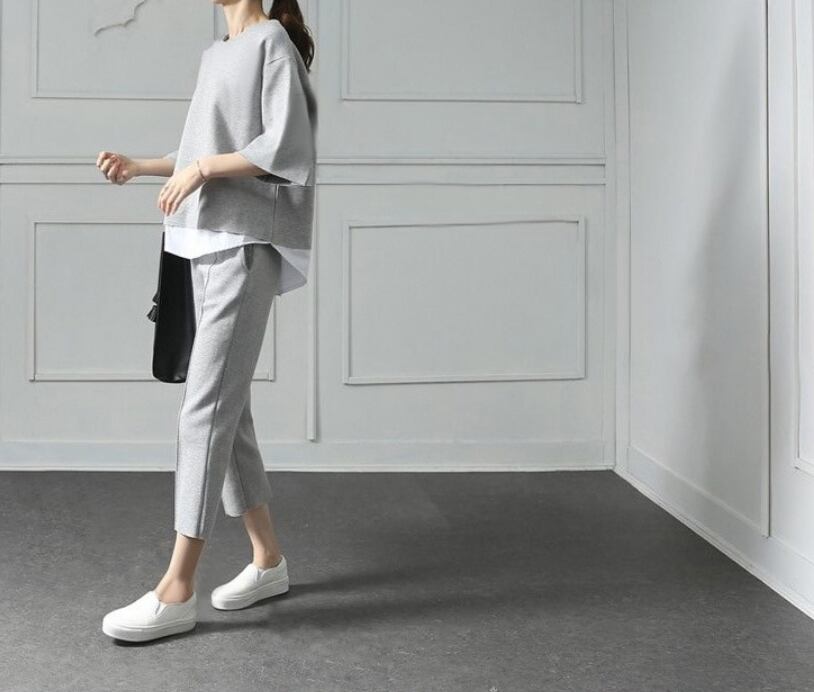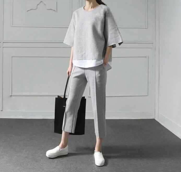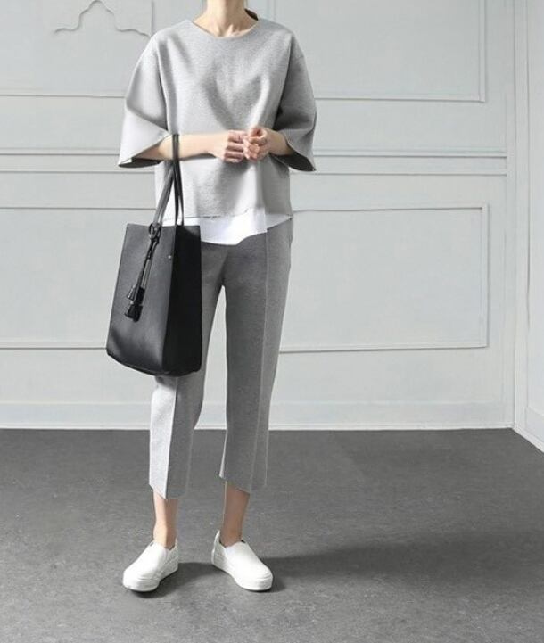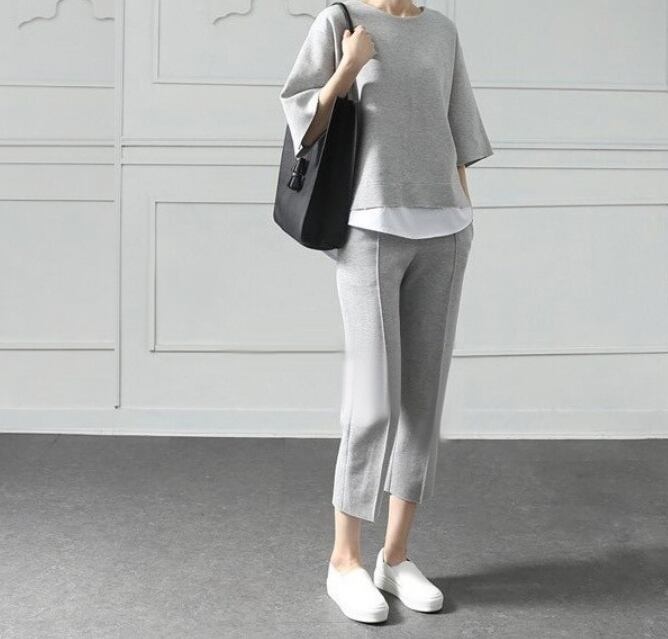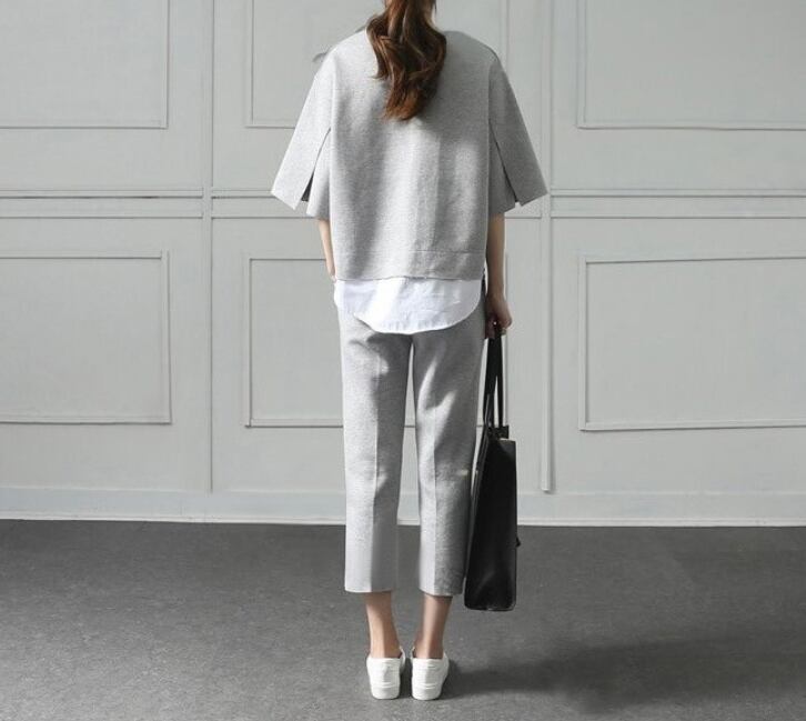 パンツは9分丈のクロップド丈で、抜け感のあるシルエットが特徴です。
