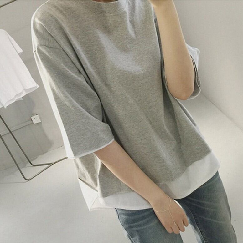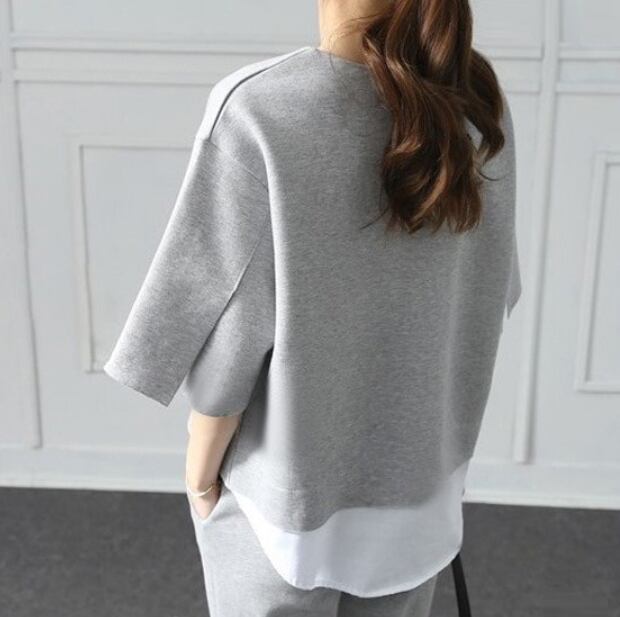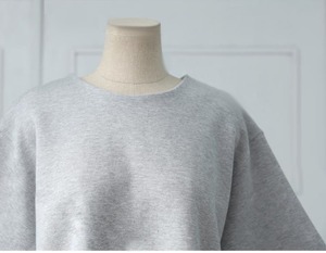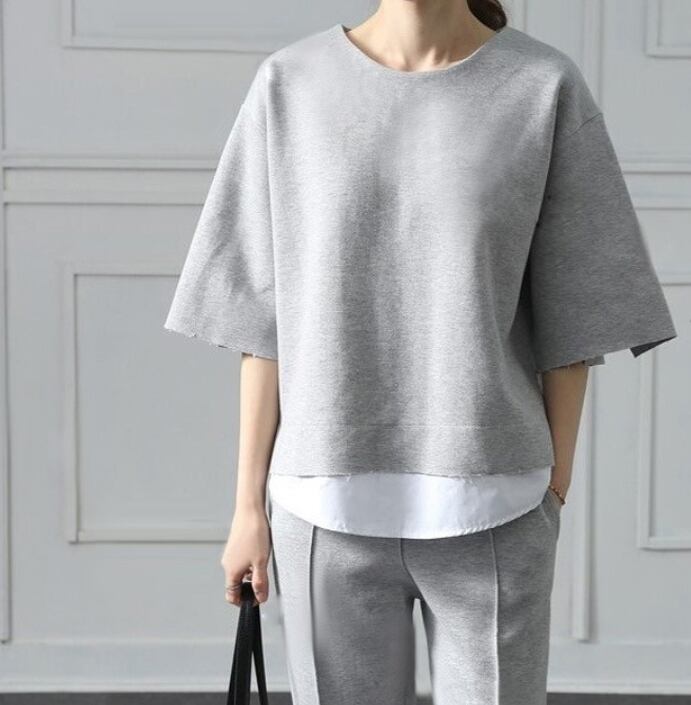 プルオーバーゆったり5分袖で、ラウンドネックの襟なしデザインが上品さとこなれ感を引き立てます。