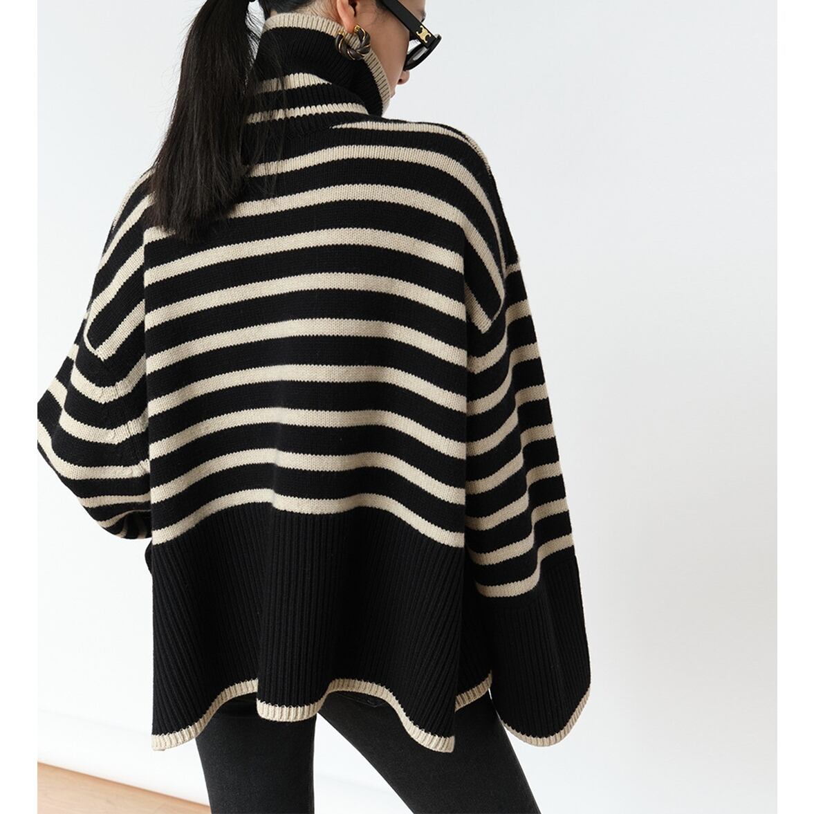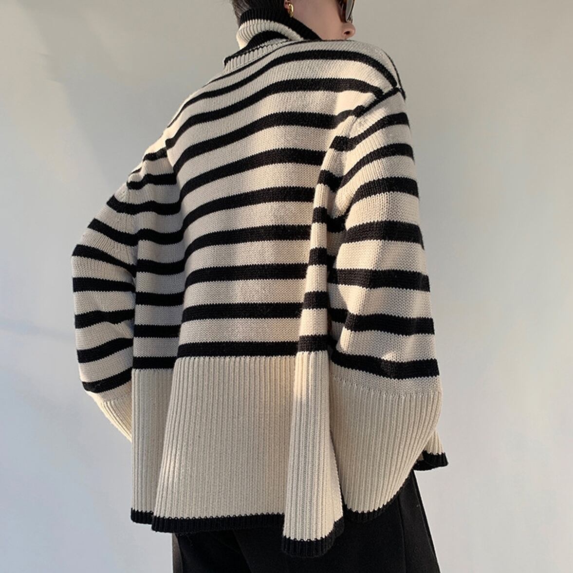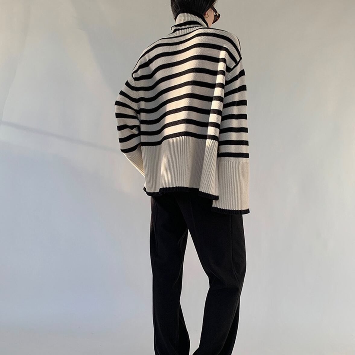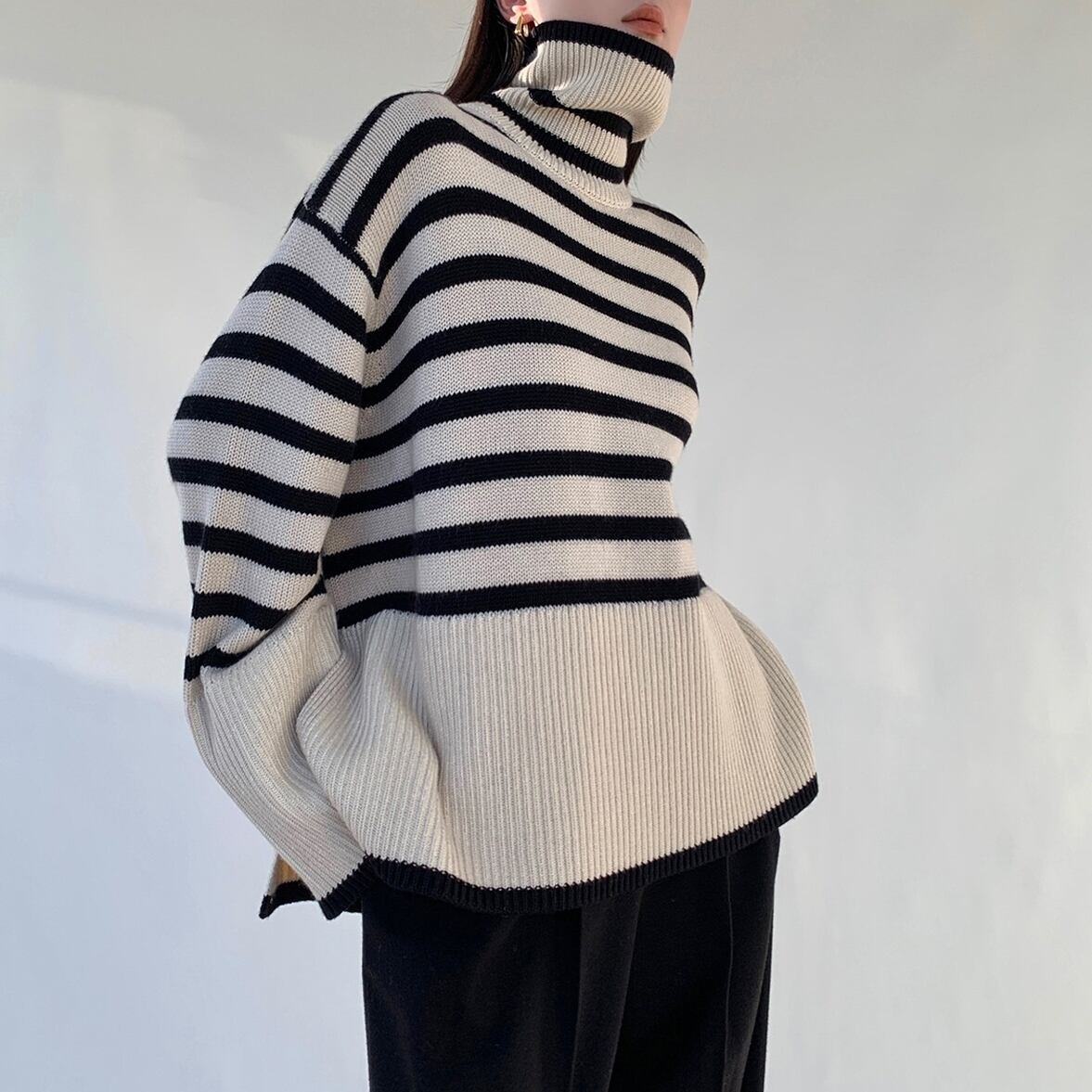 ゆるっとしたフレアシルエットにきゅっと引き締まるハイネック、ワイドさを後押しするボーダー柄、ハイネックニットトップス。