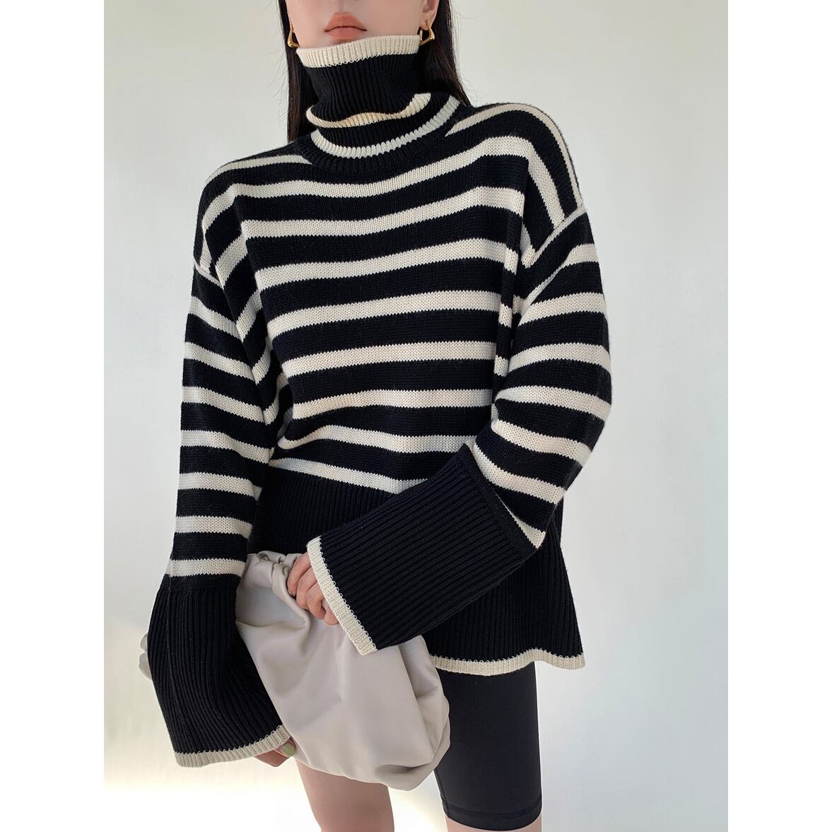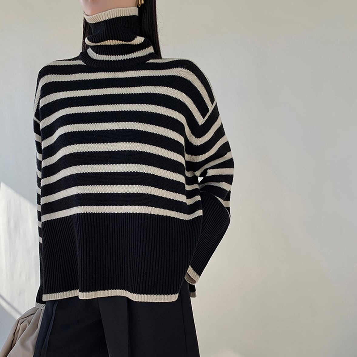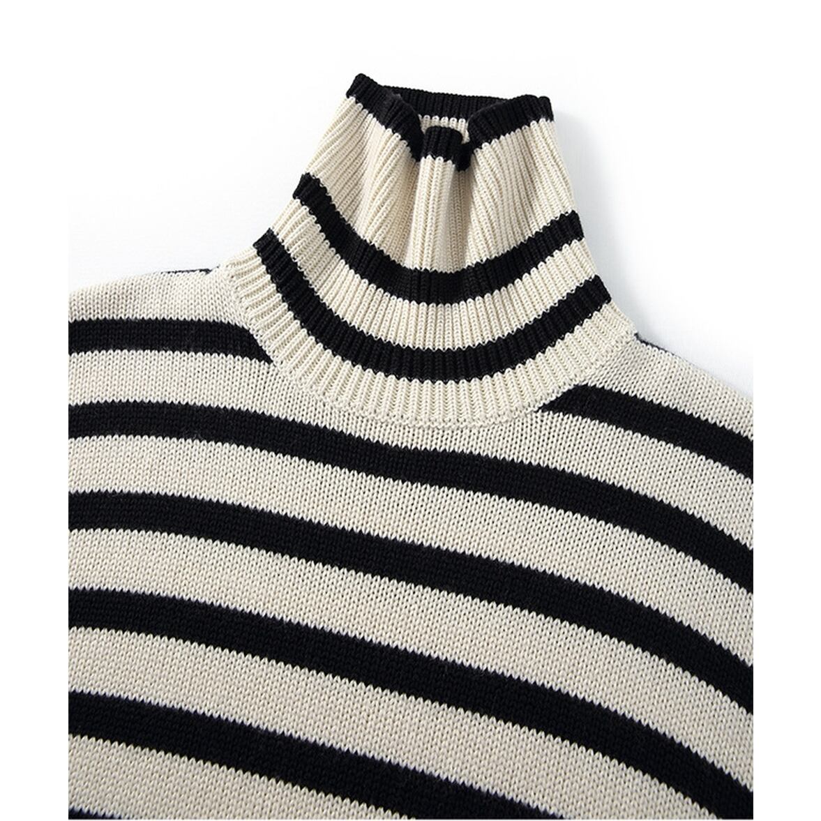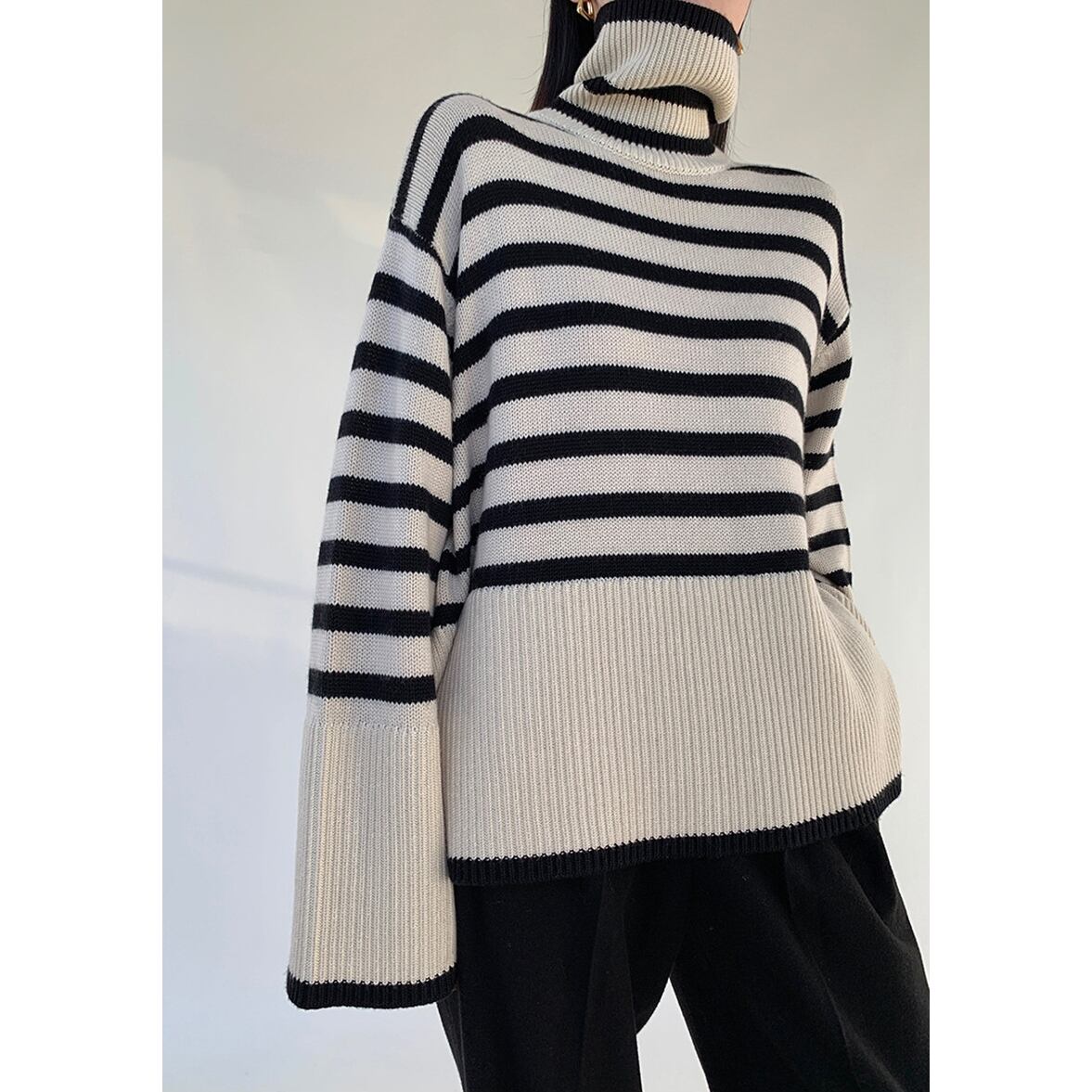 ゆるっとしたフレアシルエットにきゅっと引き締まるハイネック、ワイドさを後押しするボーダー柄、ハイネックニットトップス。