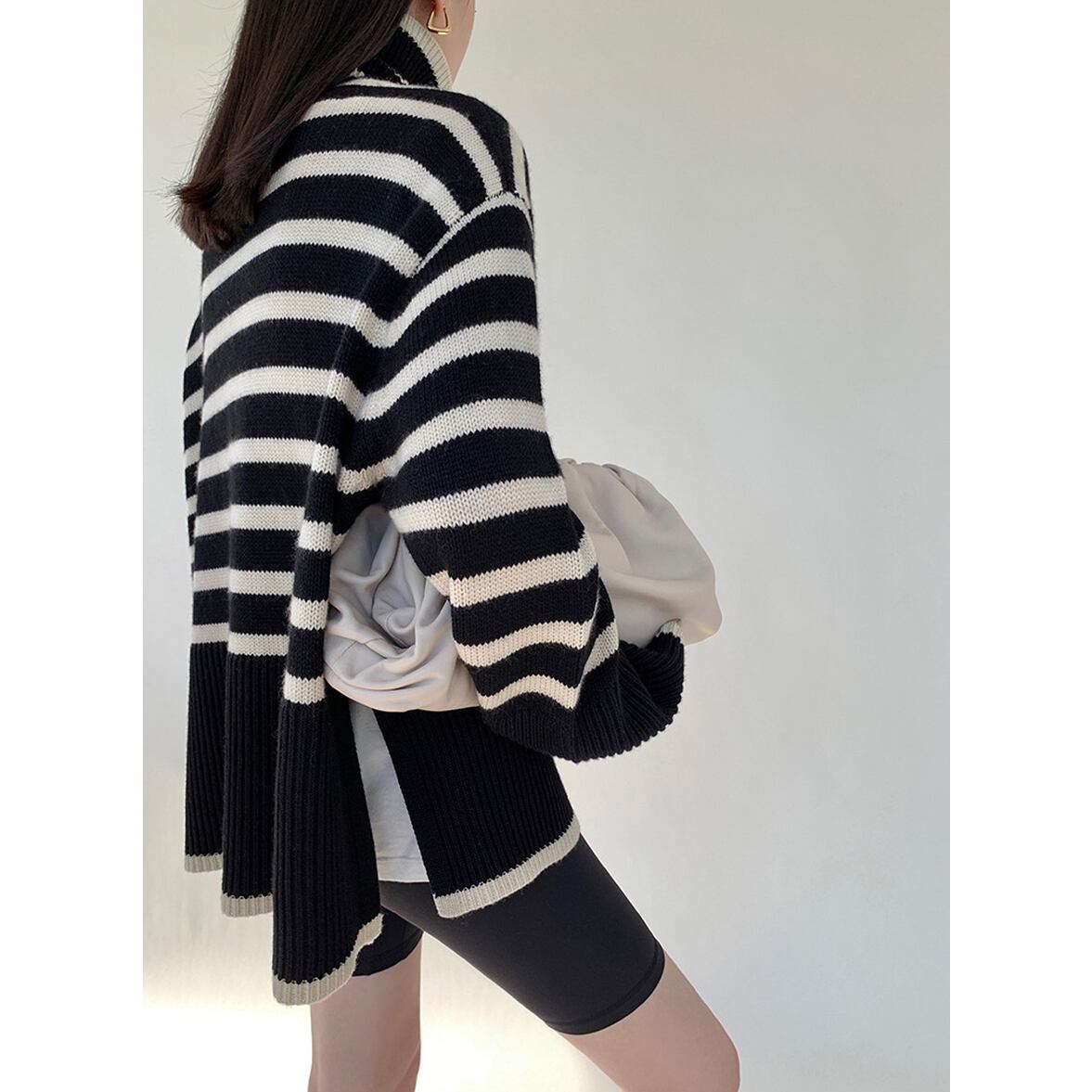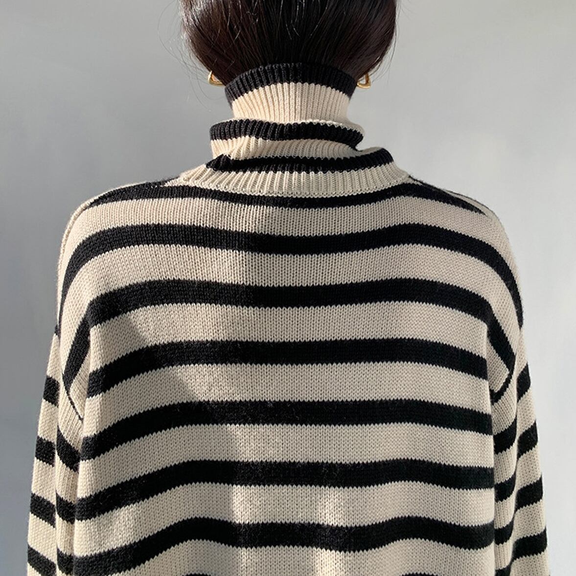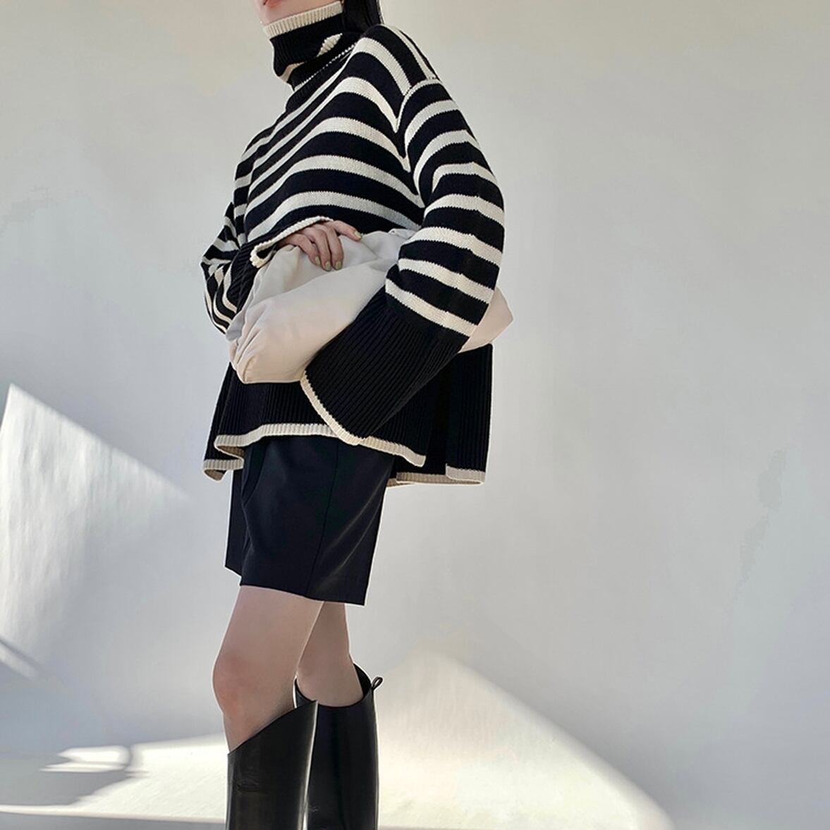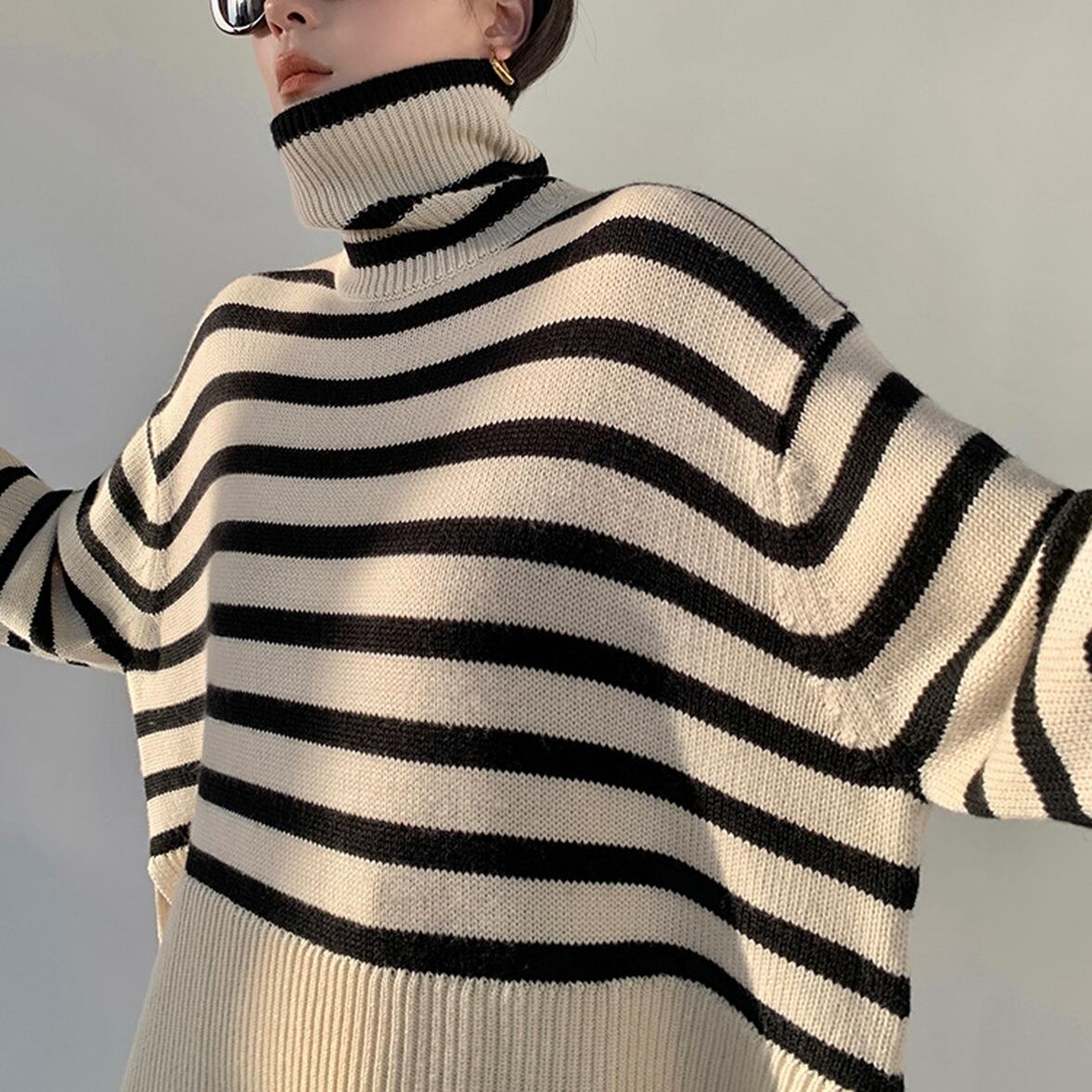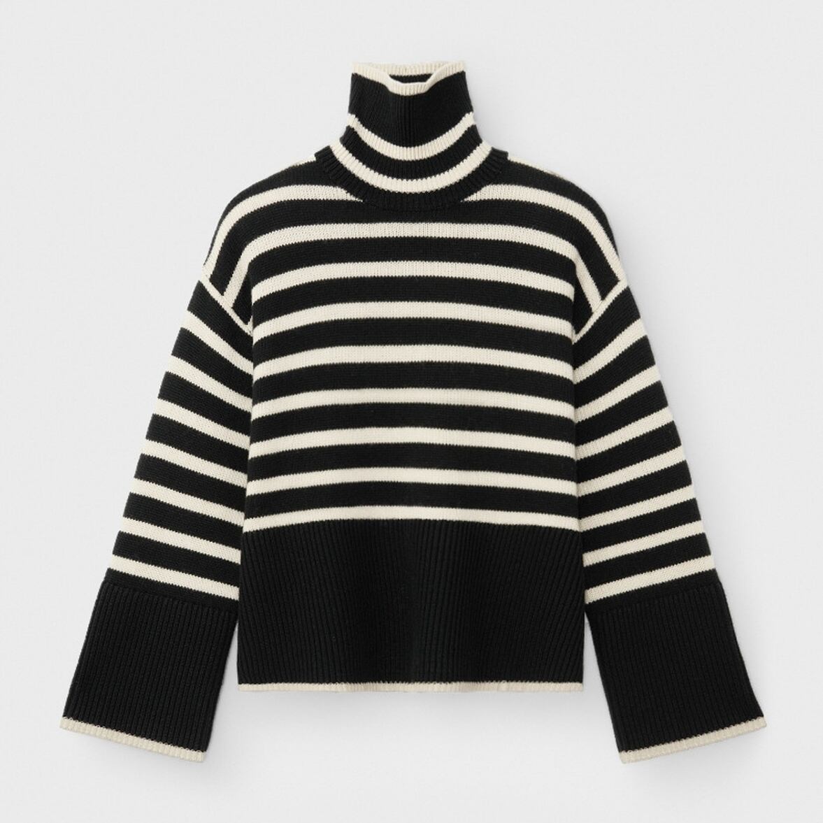 ゆるっとしたフレアシルエットにきゅっと引き締まるハイネック、ワイドさを後押しするボーダー柄、ハイネックニットトップス。