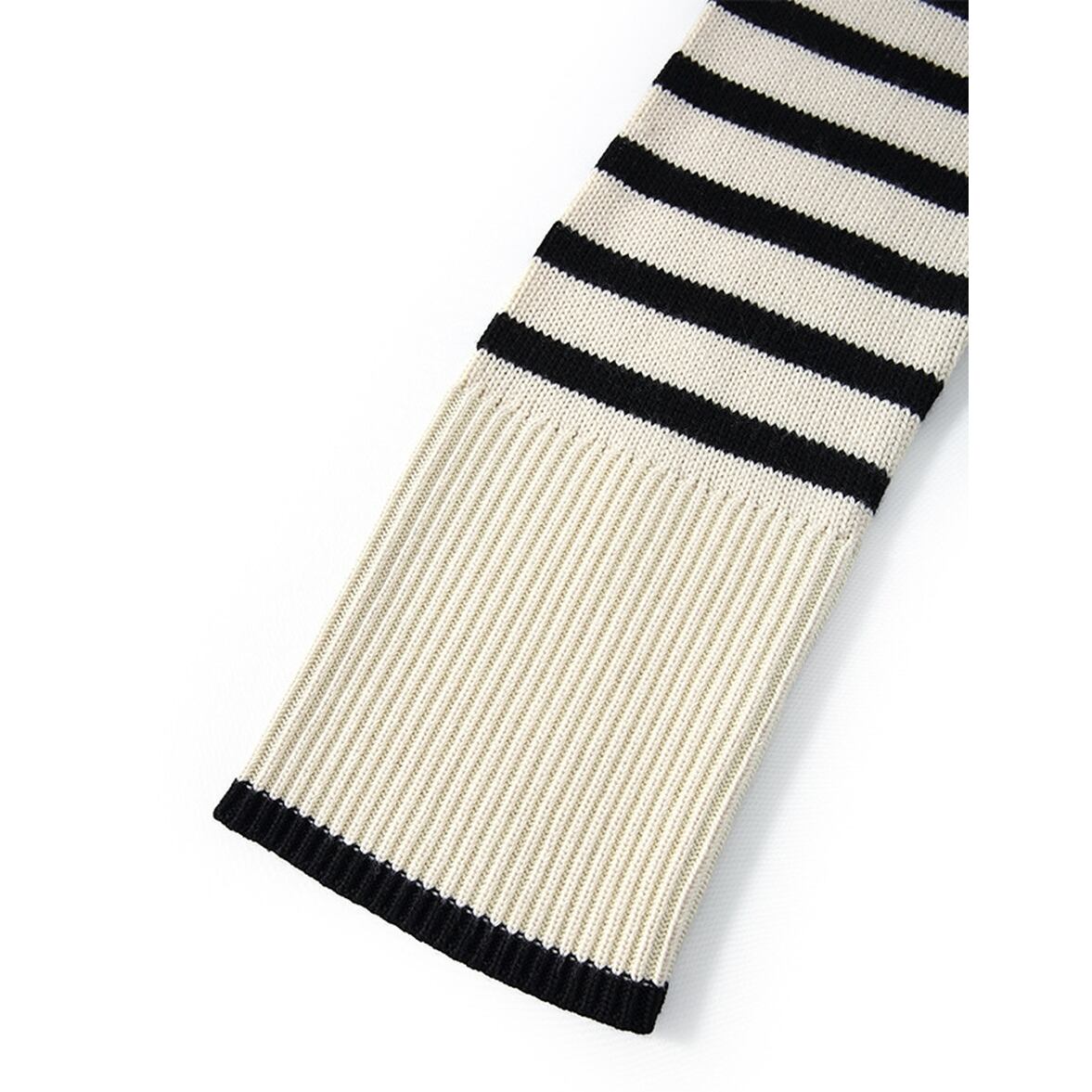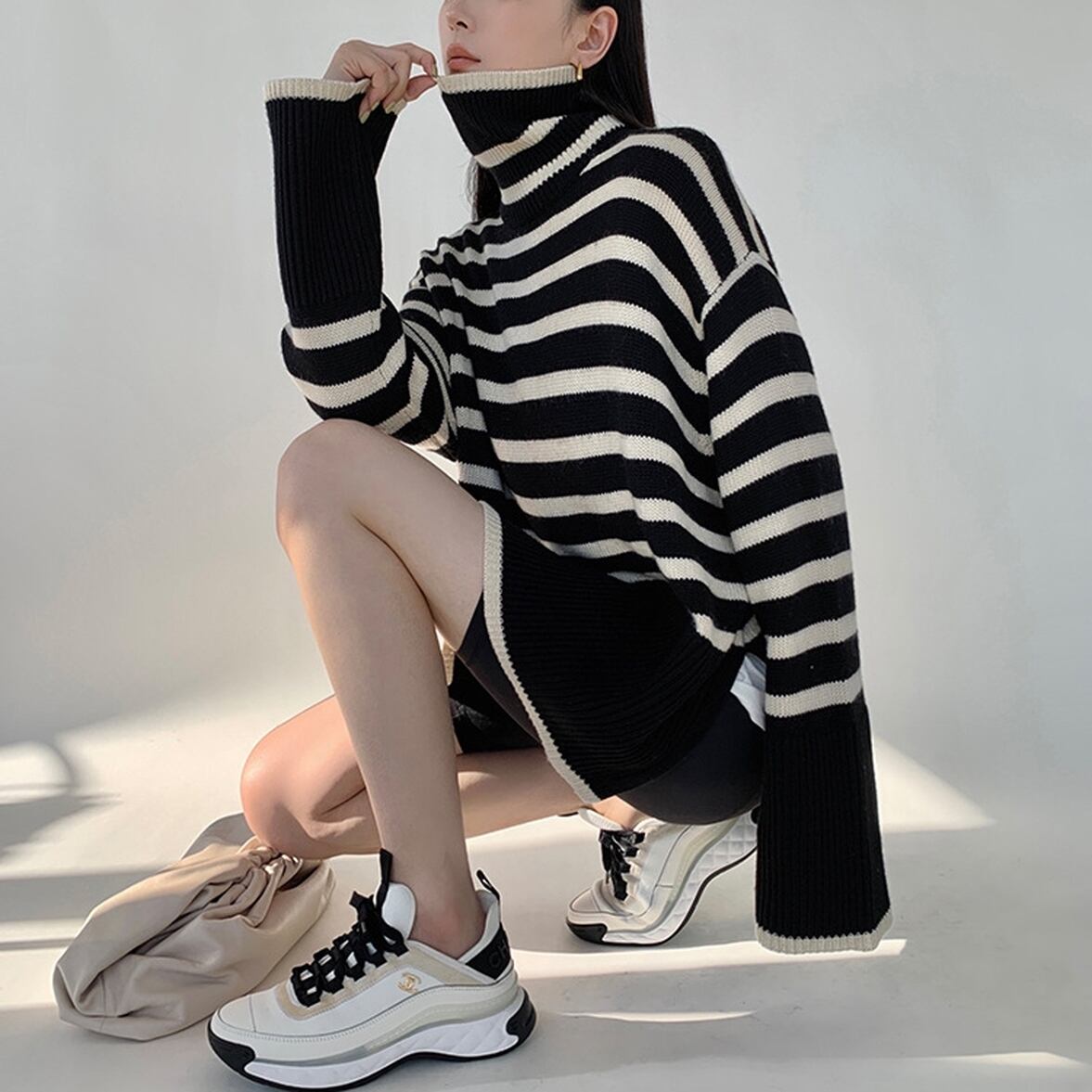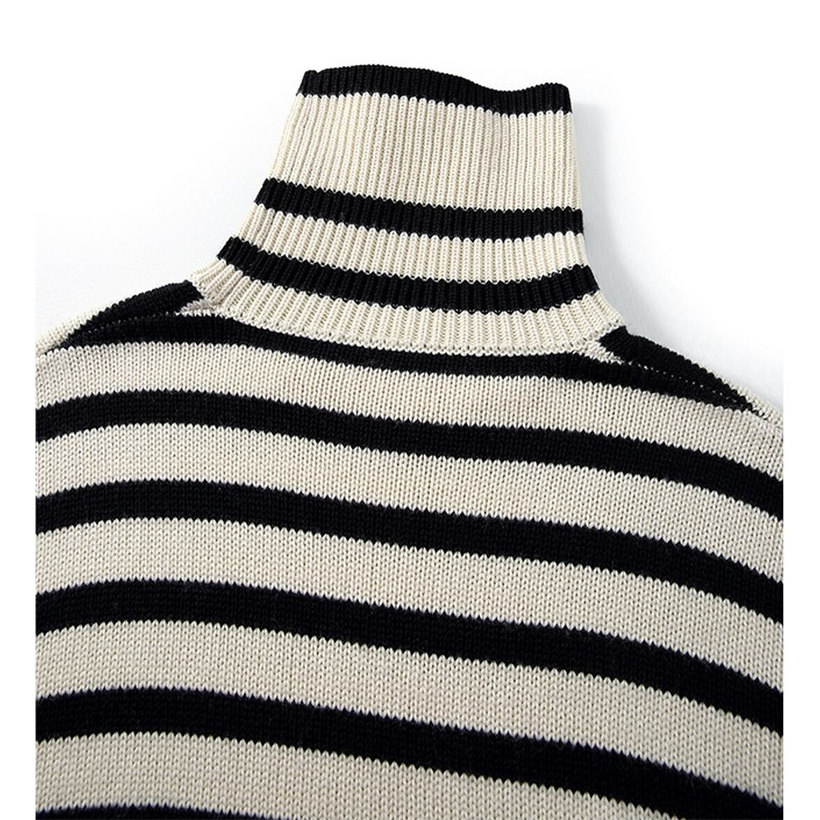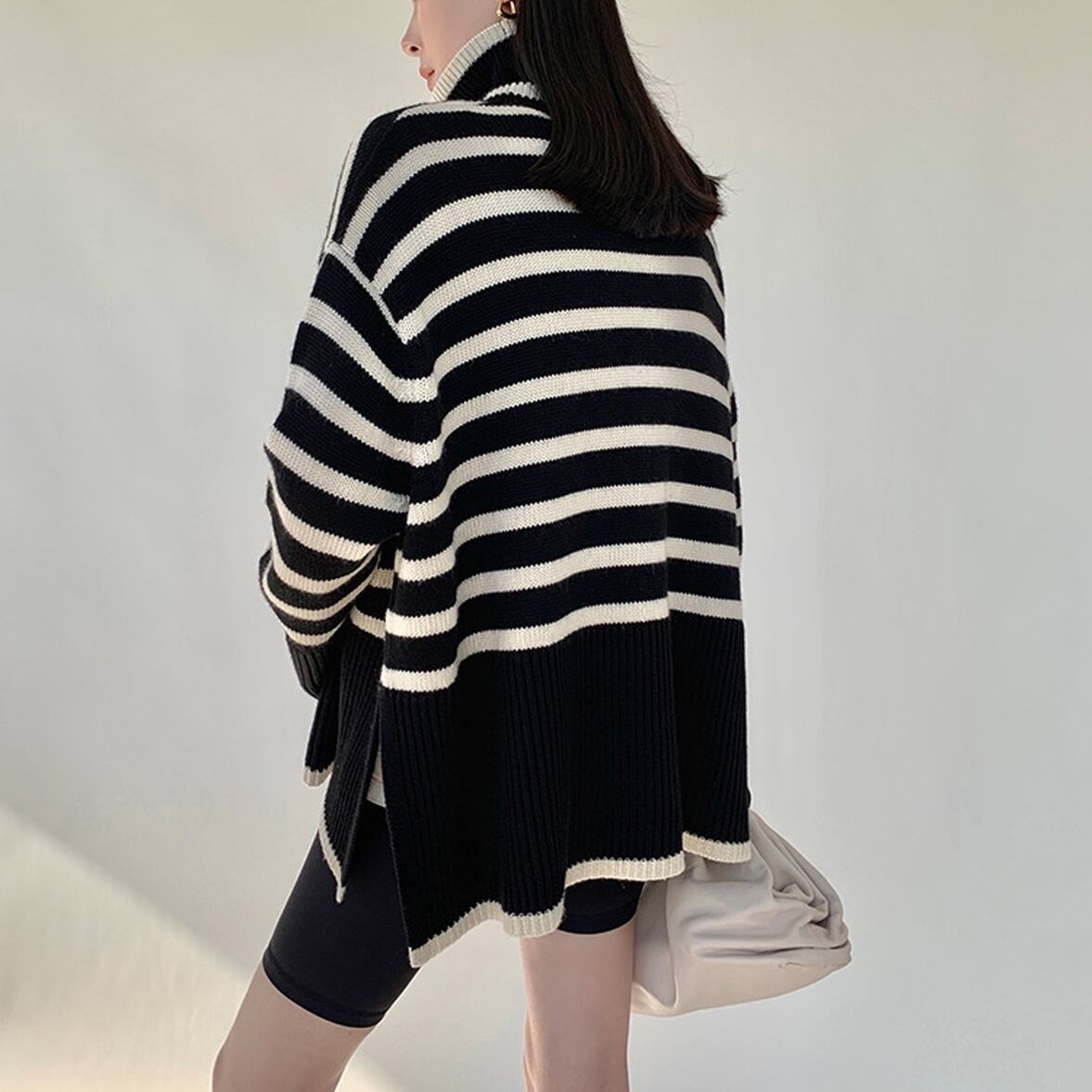 ゆるっとしたフレアシルエットにきゅっと引き締まるハイネック、ワイドさを後押しするボーダー柄、ハイネックニットトップス。