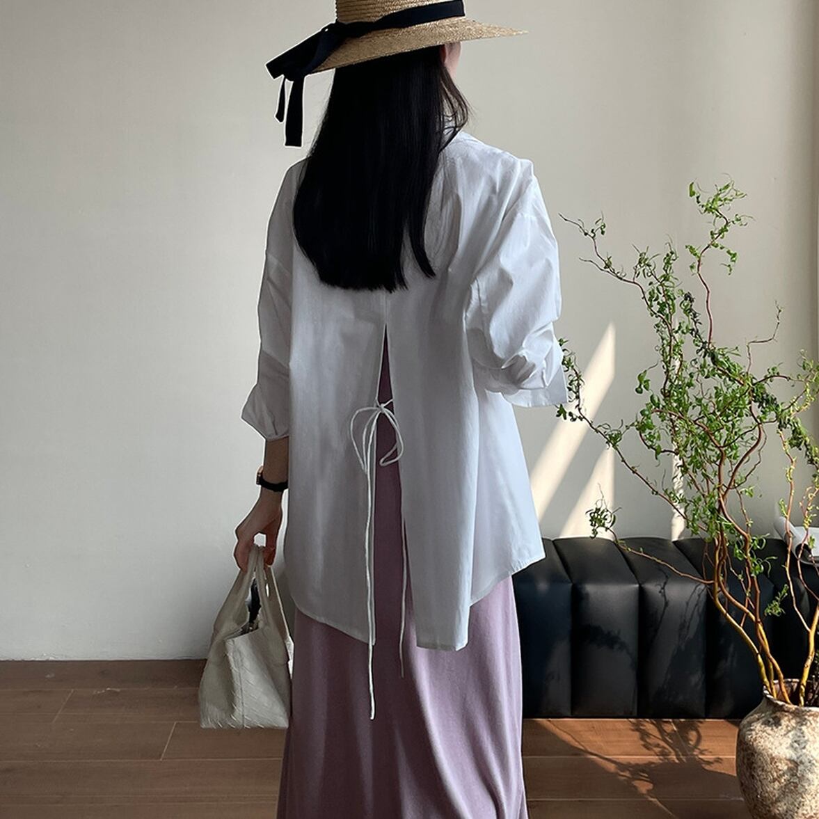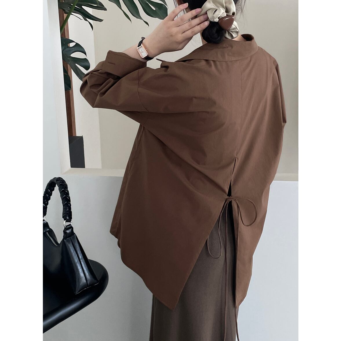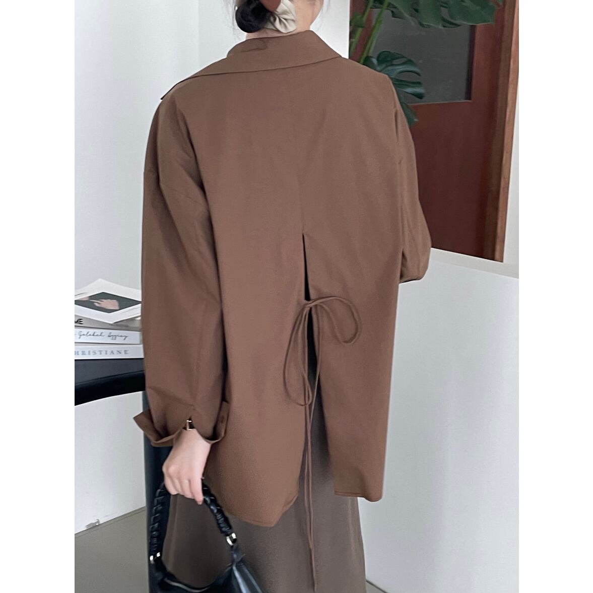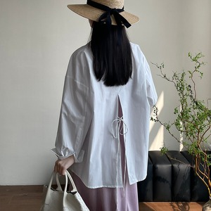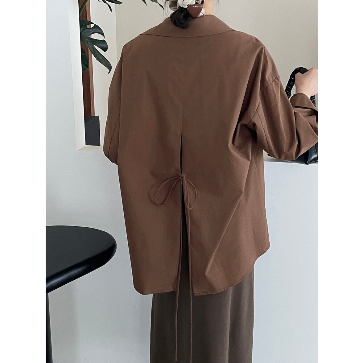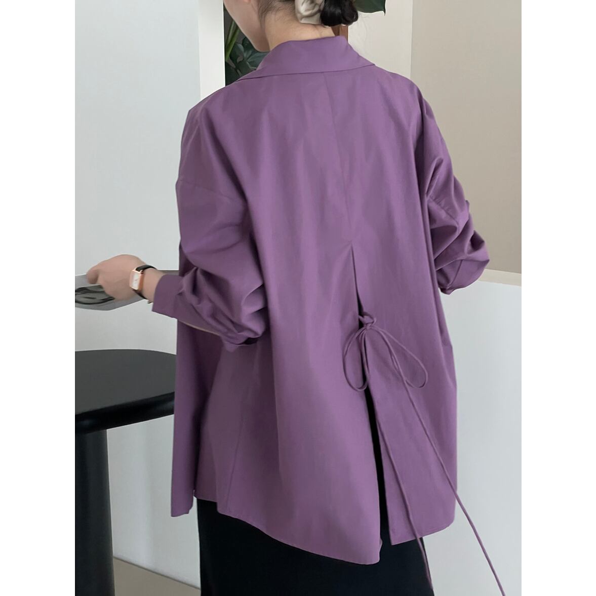 後ろ姿の深いスリットが特徴、レイヤードコーデが映える、ベーシックなシャツスタイルを進化させた、バックコンシャス襟付きシャツ。