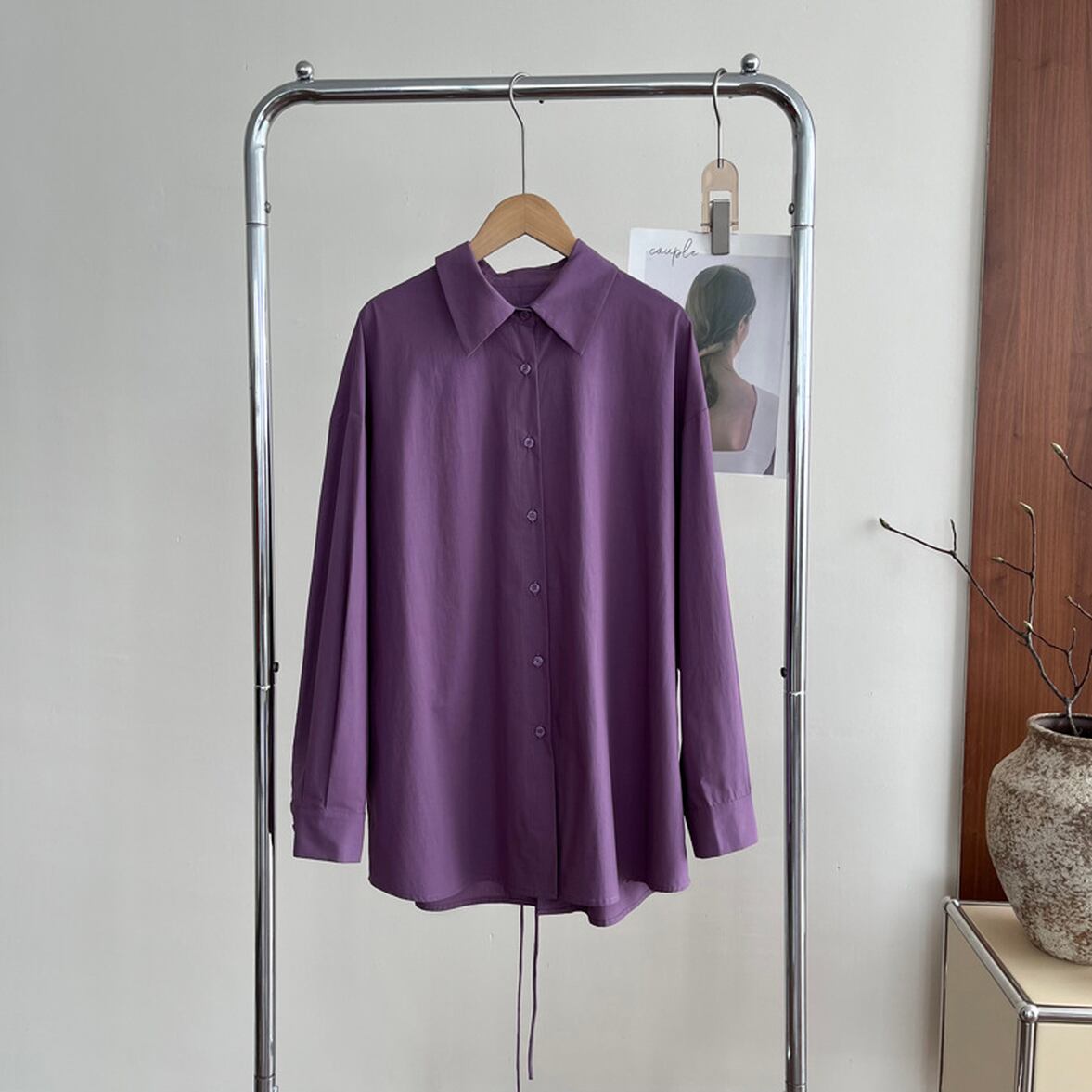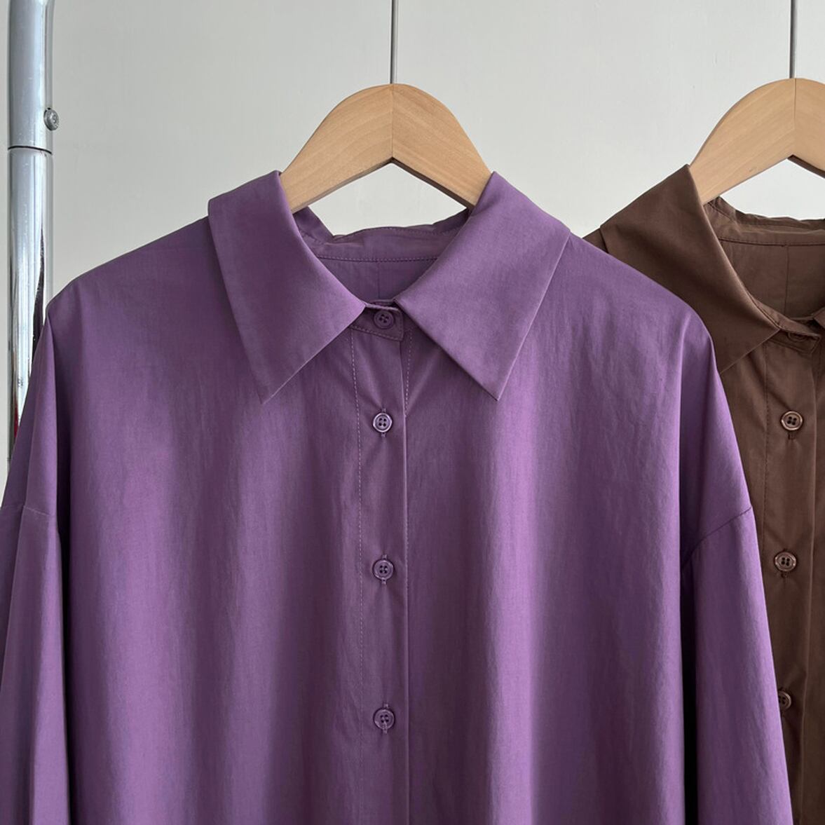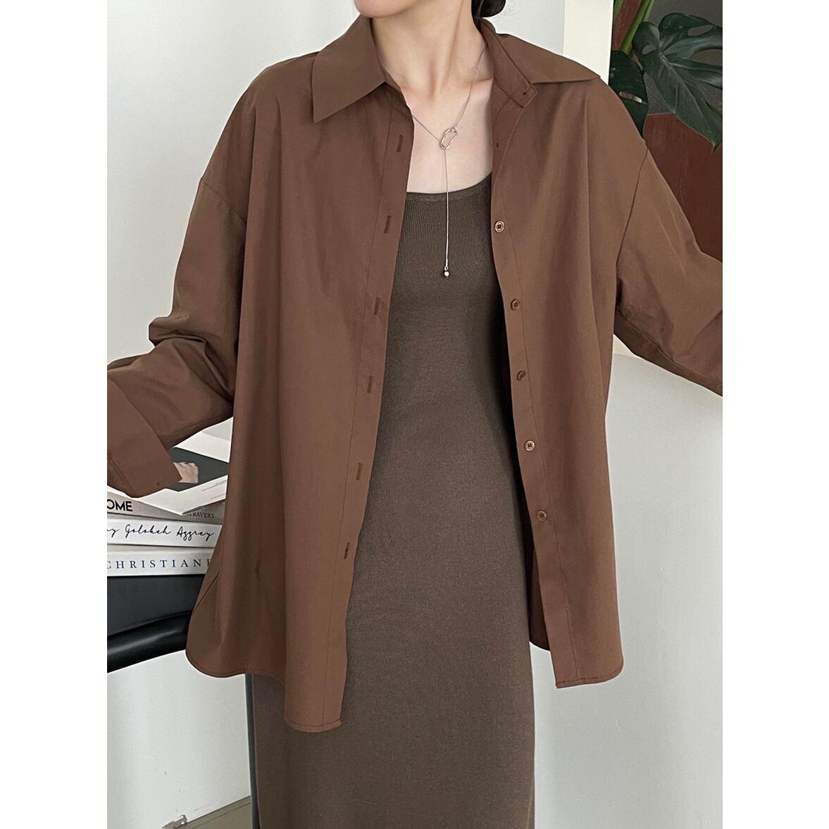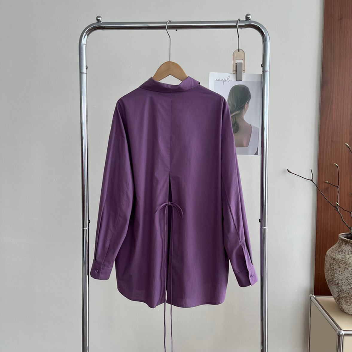 後ろ姿の深いスリットが特徴、レイヤードコーデが映える、ベーシックなシャツスタイルを進化させた、バックコンシャス襟付きシャツ。