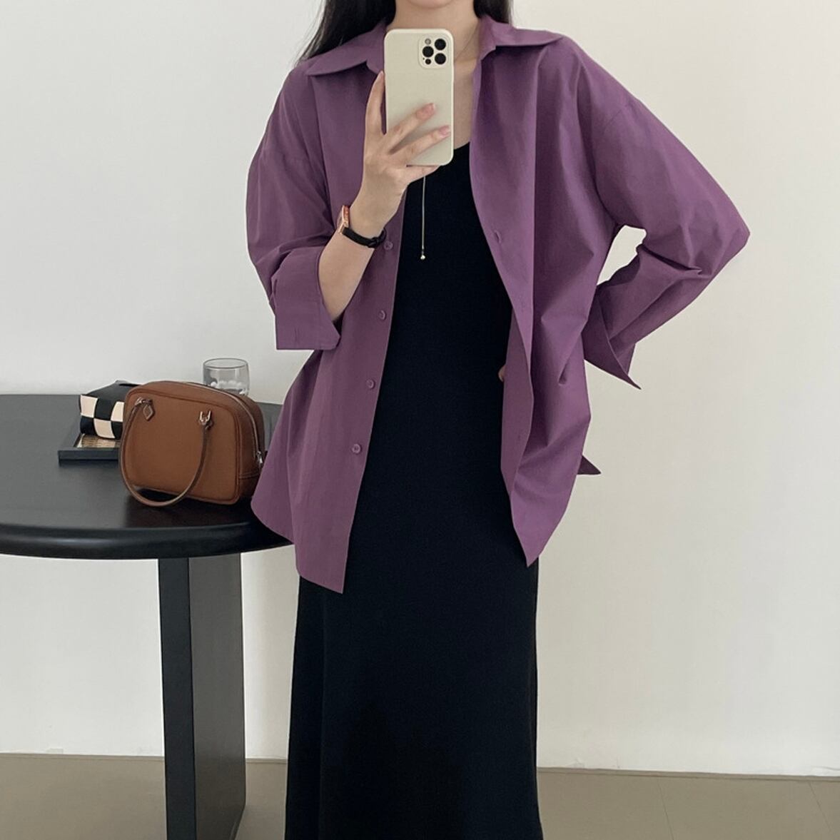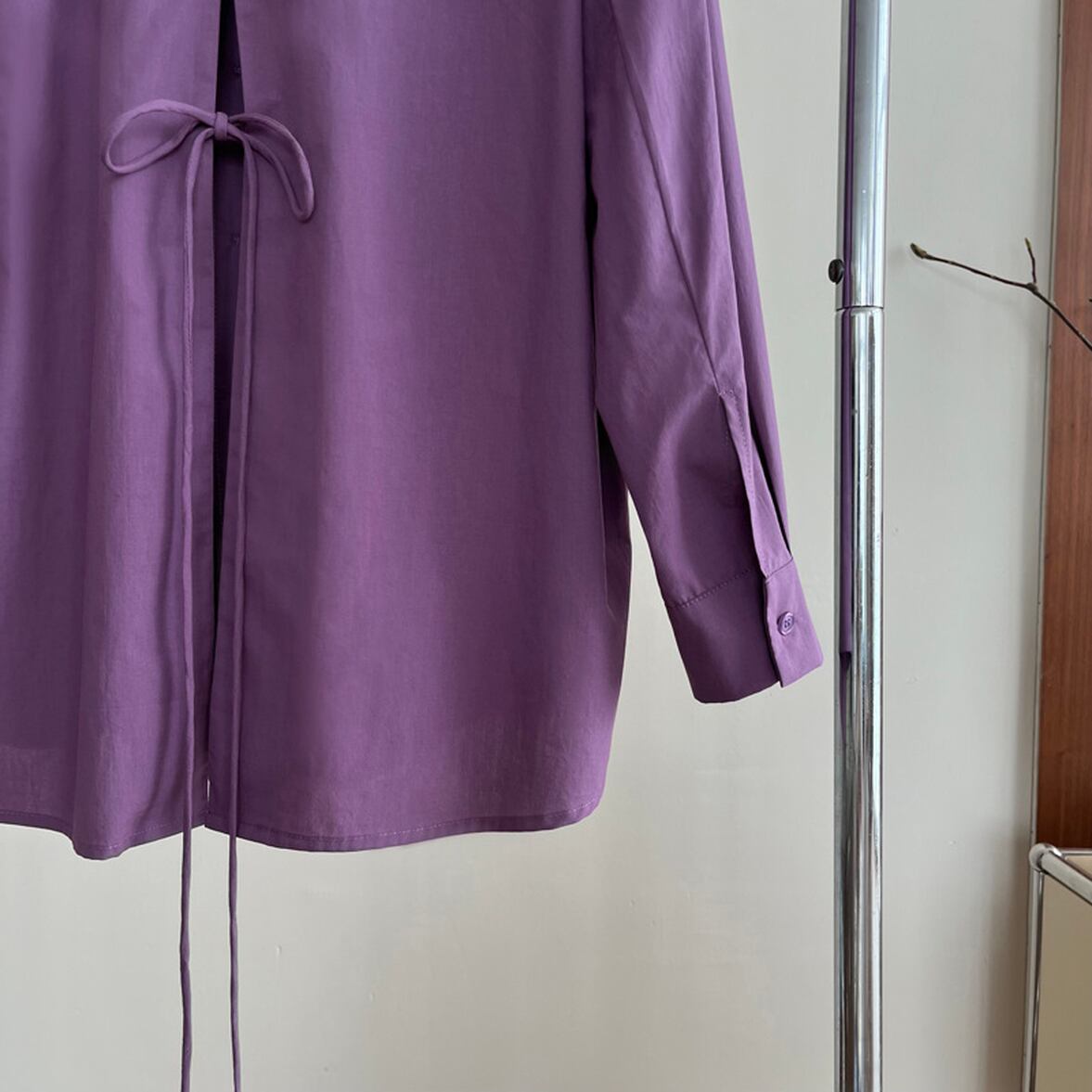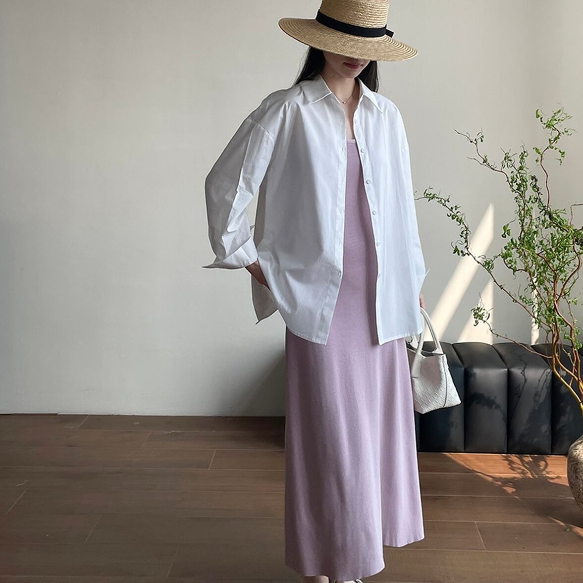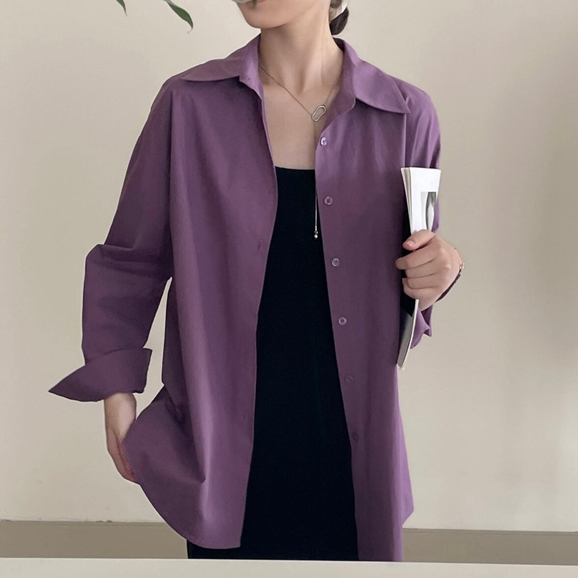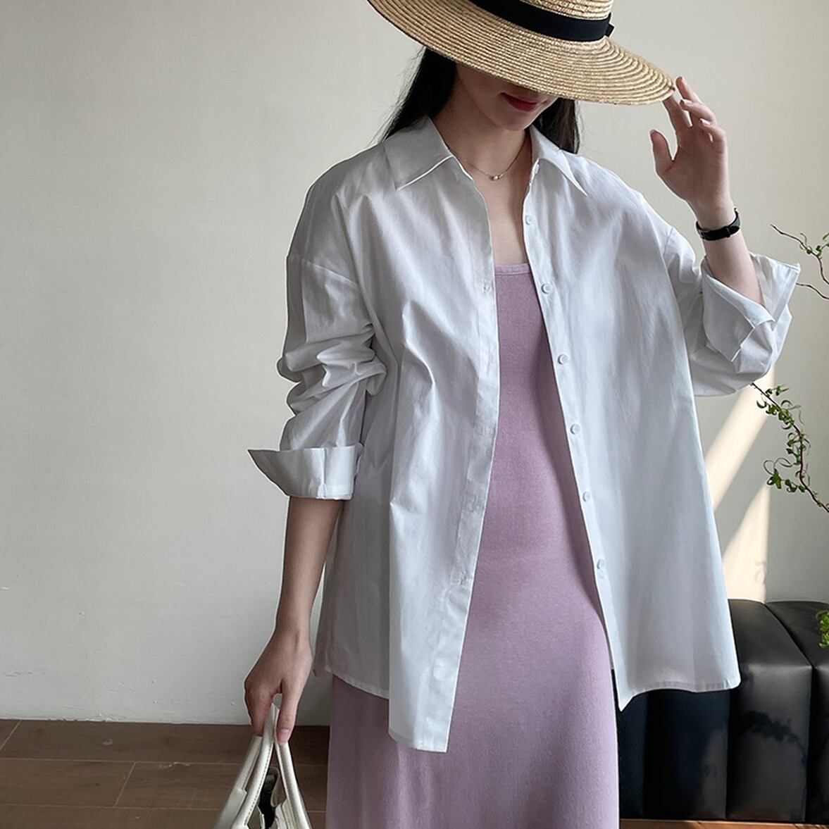 後ろ姿の深いスリットが特徴、レイヤードコーデが映える、ベーシックなシャツスタイルを進化させた、バックコンシャス襟付きシャツ。