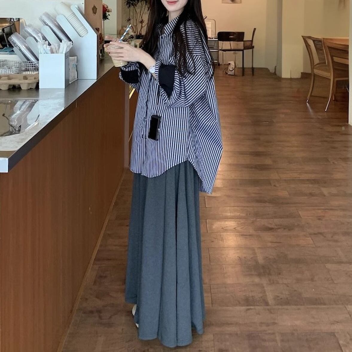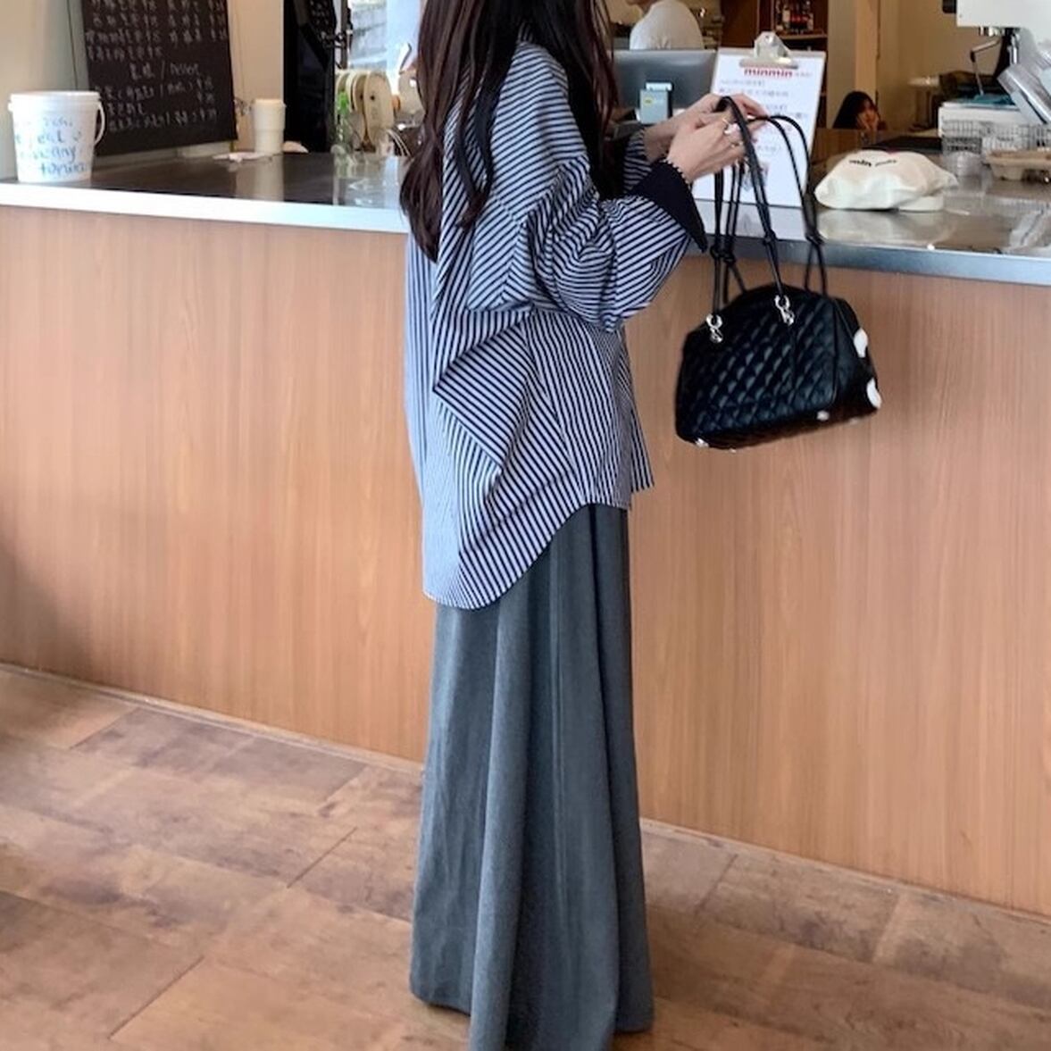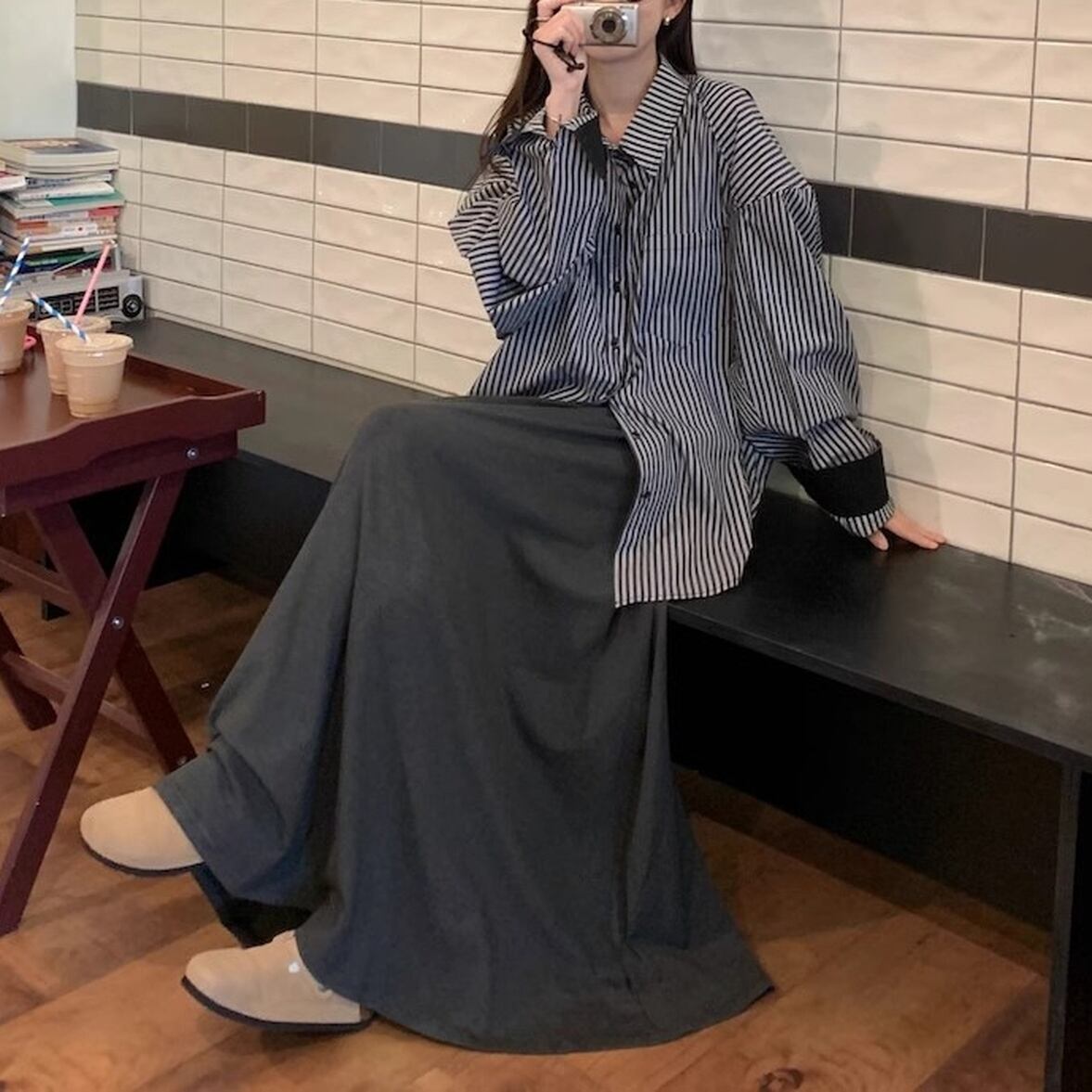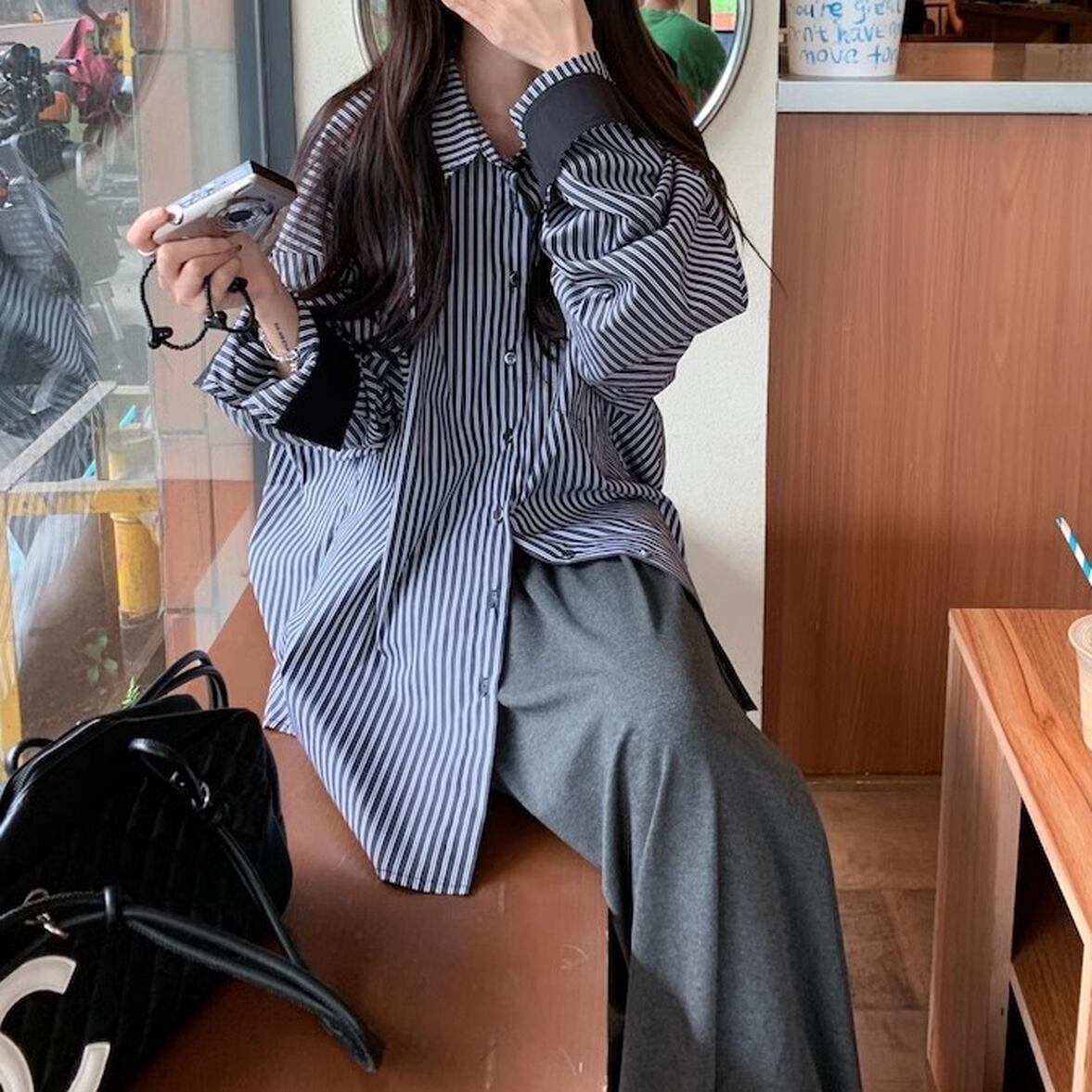 どんなボトムスとも相性良く凛々しく決まる、ダボっとした大きめシルエットが体型カバーを叶える、きちんと感の要素があるストライプシャツ。