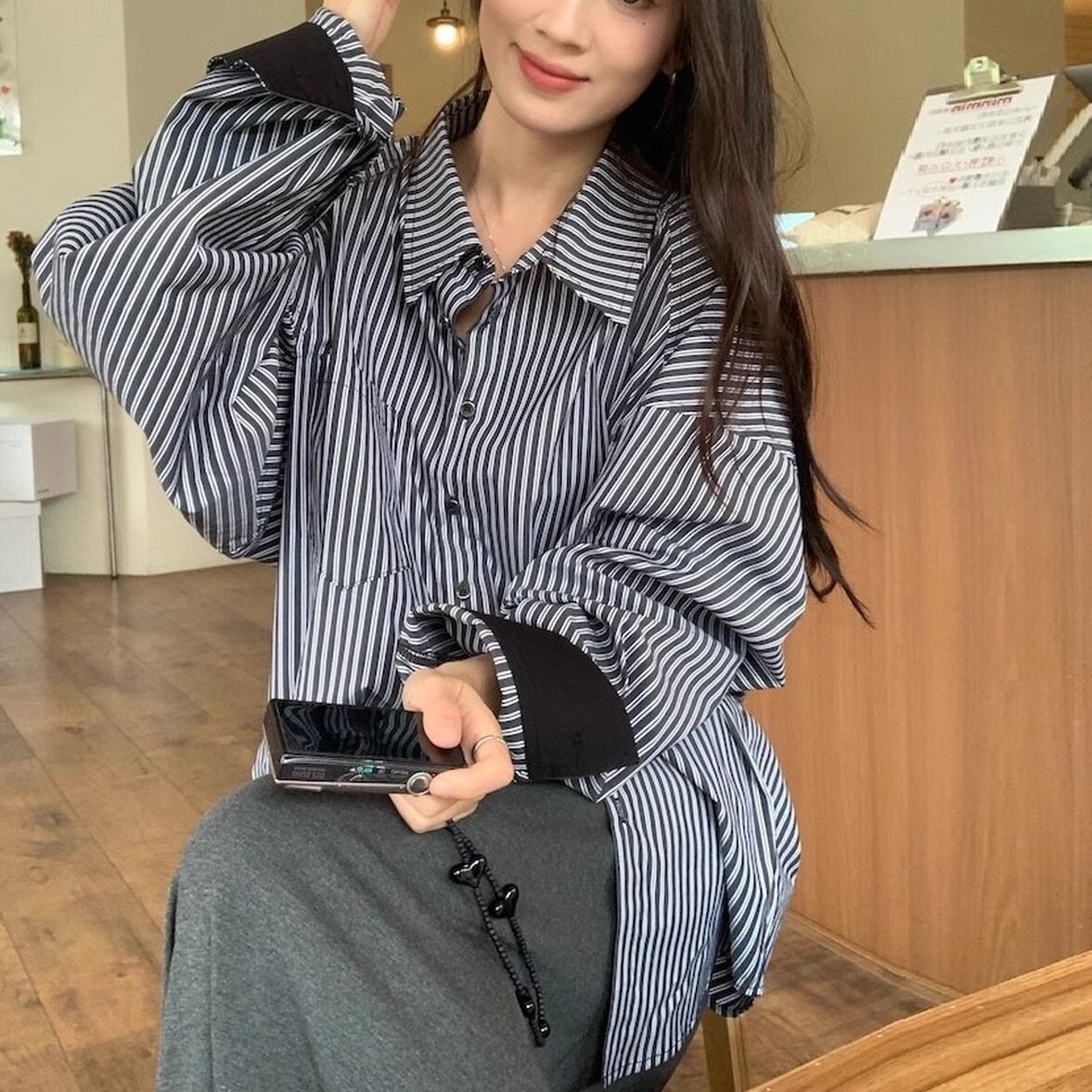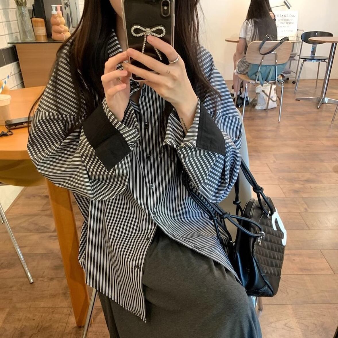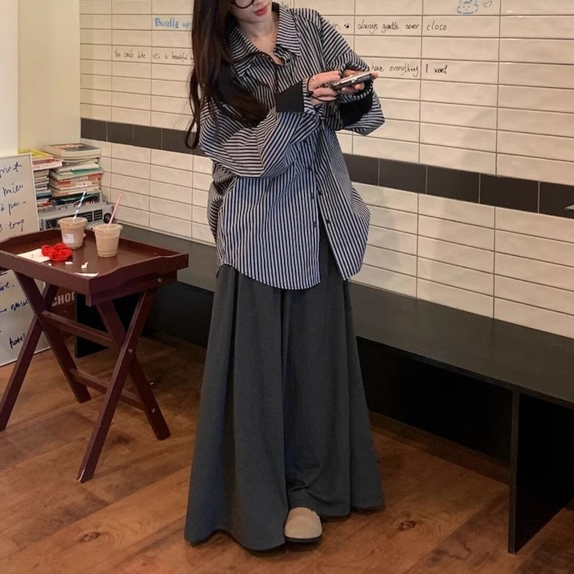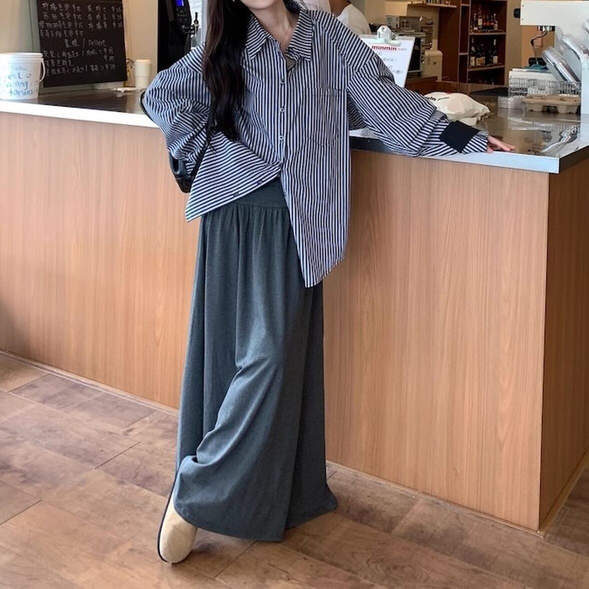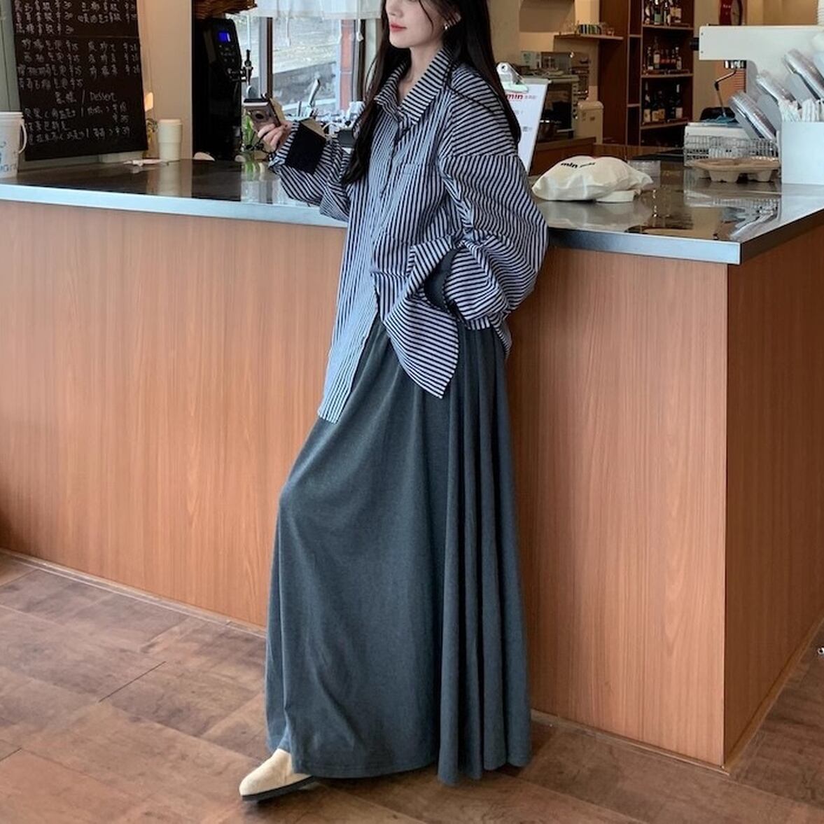どんなボトムスとも相性良く凛々しく決まる、ダボっとした大きめシルエットが体型カバーを叶える、きちんと感の要素があるストライプシャツ。
