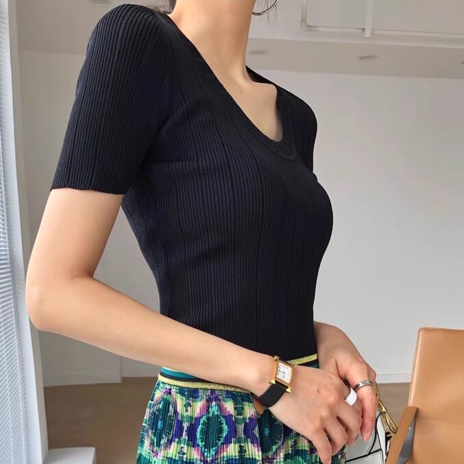 薄手の素材で軽やかに着こなせるこのタイトフィットのUネックTシャツは、シンプルながらフェミニンさを引き立てるスタイルです。