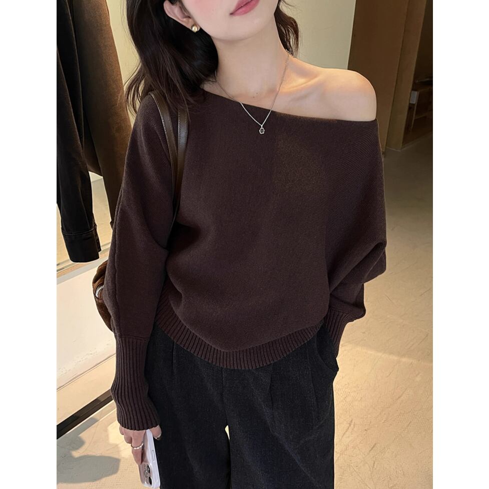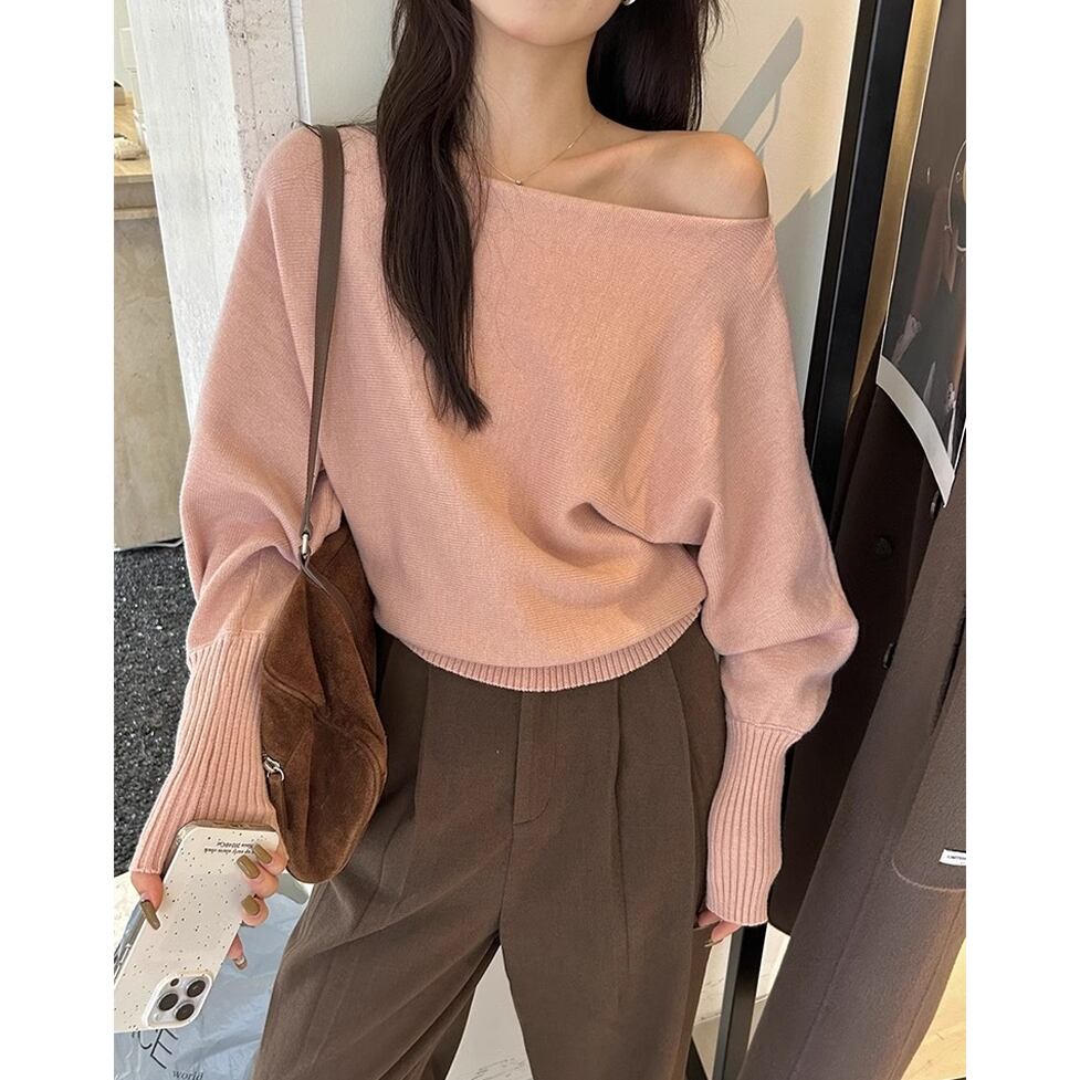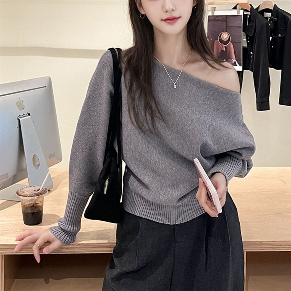 ルーズなワンショルデザイン、袖口のロングリブカフス、程よく肌見せしてヘルシーにこなれるワンショルダーニット。