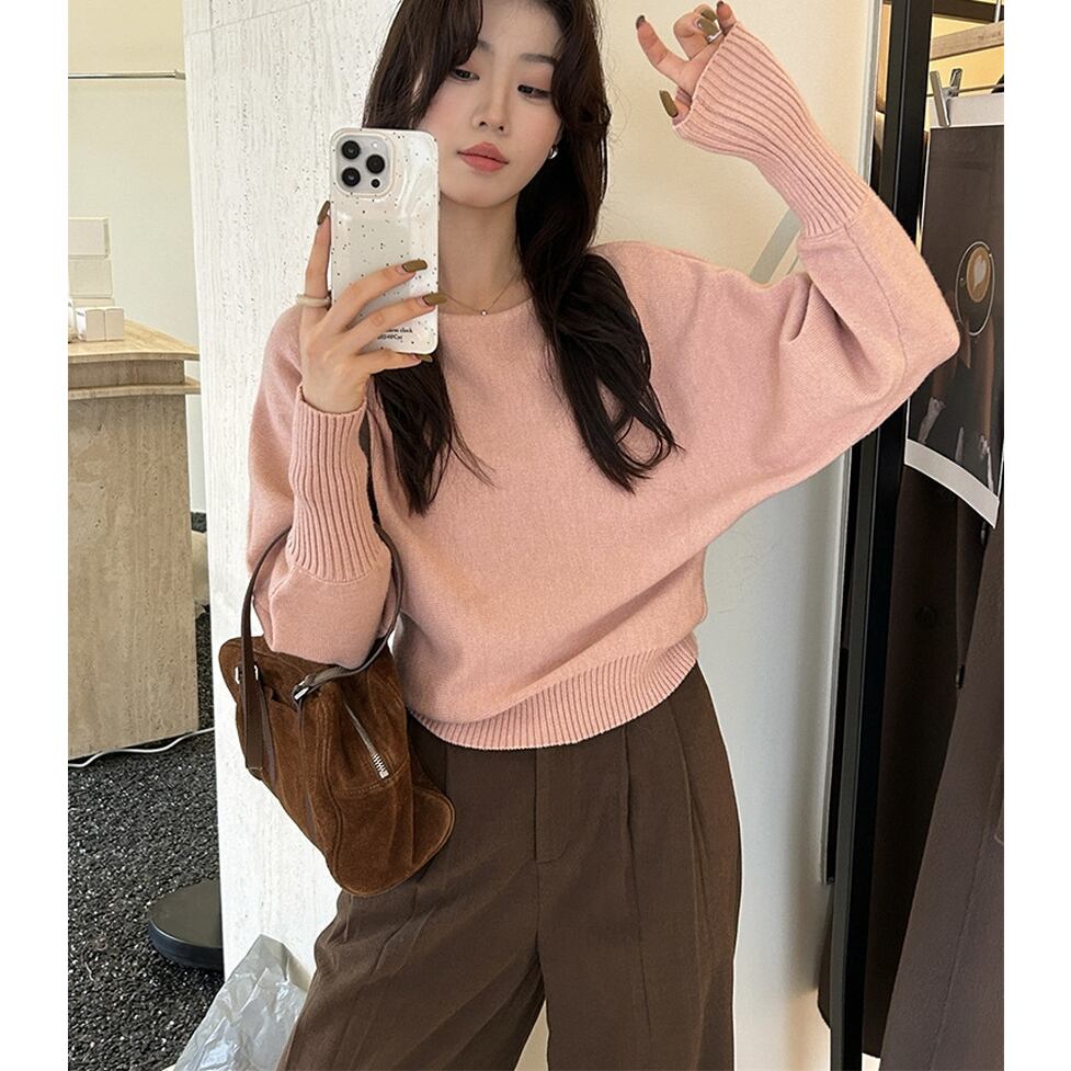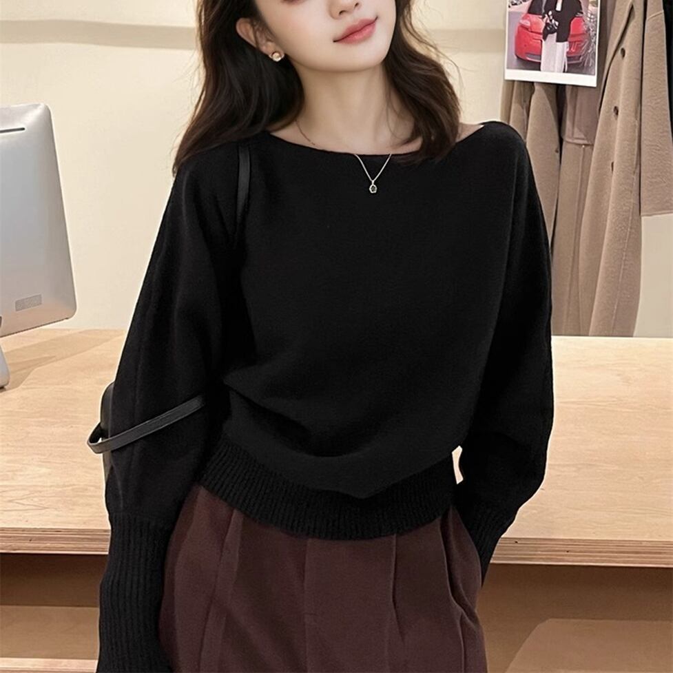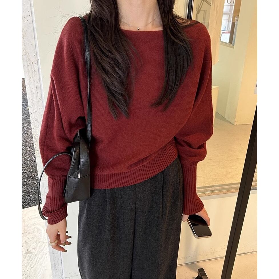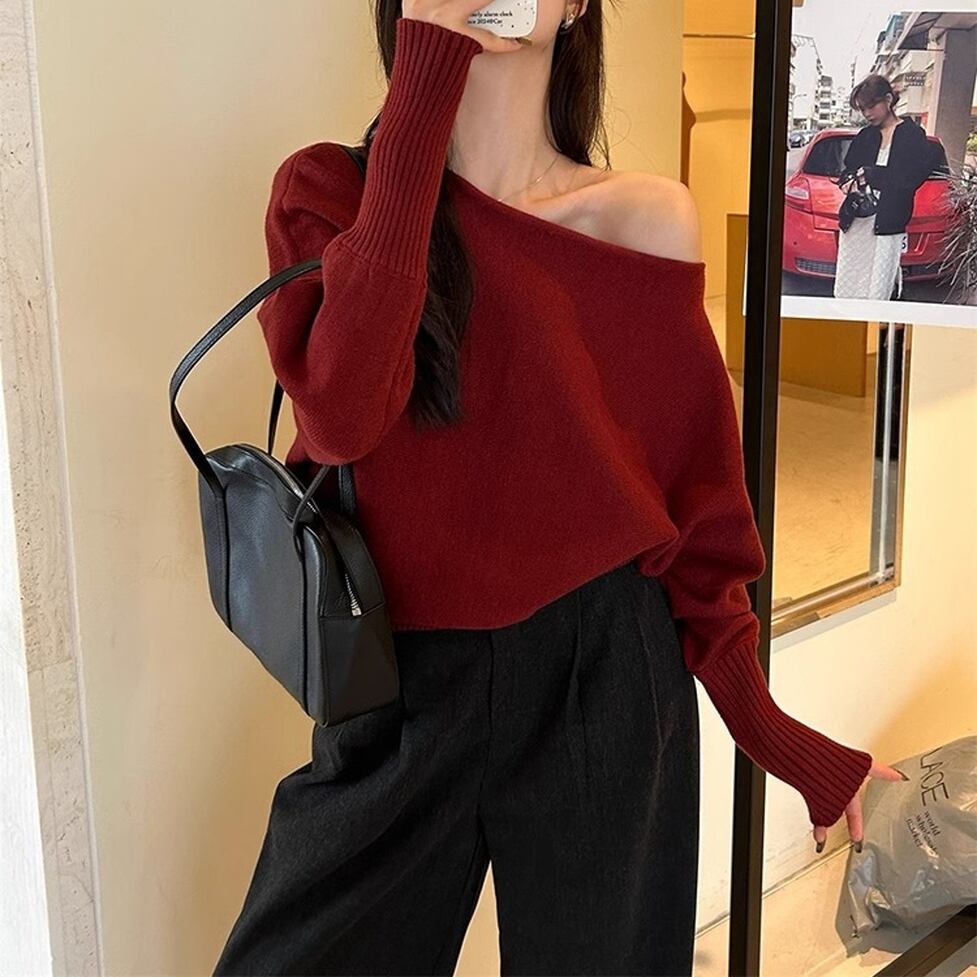 ルーズなワンショルデザイン、袖口のロングリブカフス、程よく肌見せしてヘルシーにこなれるワンショルダーニット。