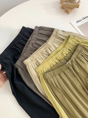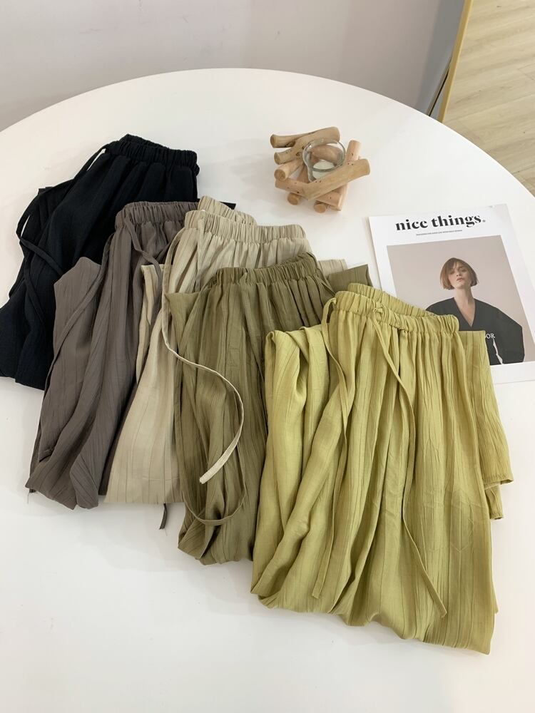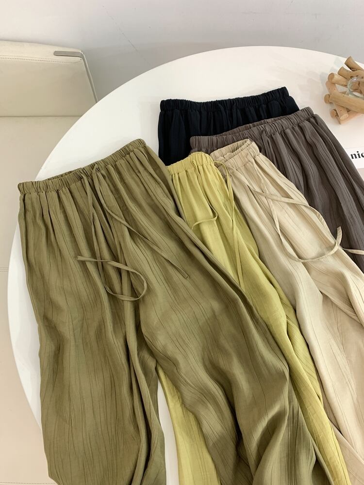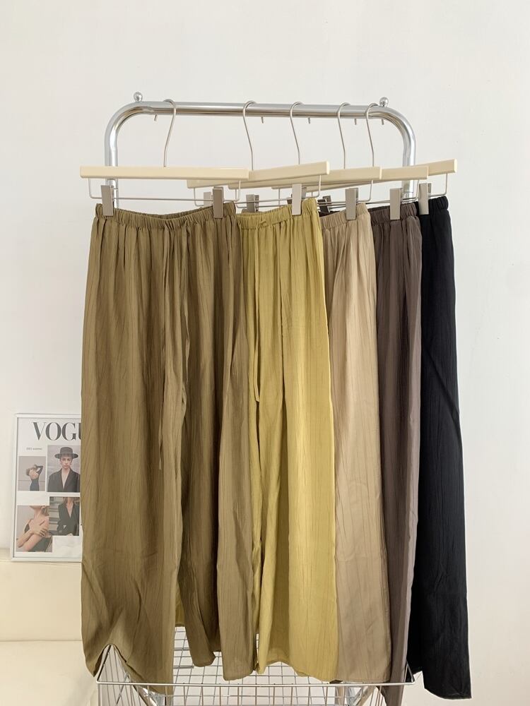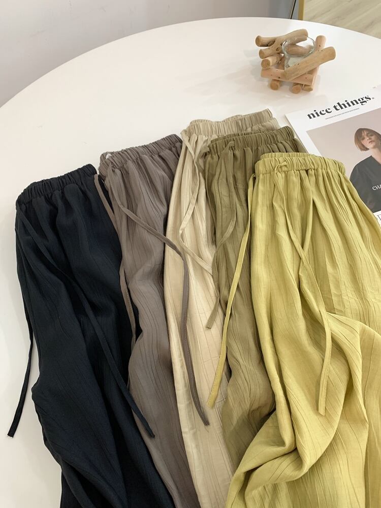 ワイドストレートデザインで、ハイウエストとウエストゴム仕様を採用し、快適な着心地を実現。