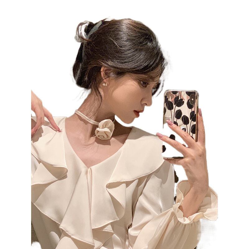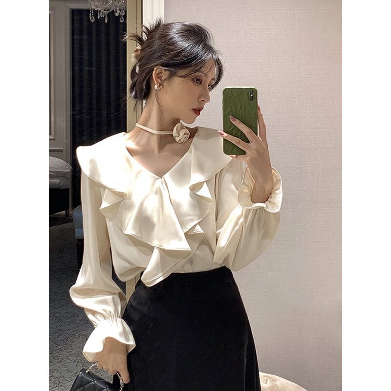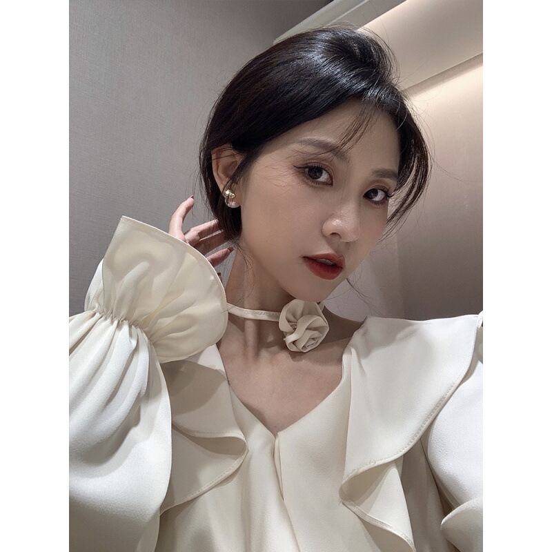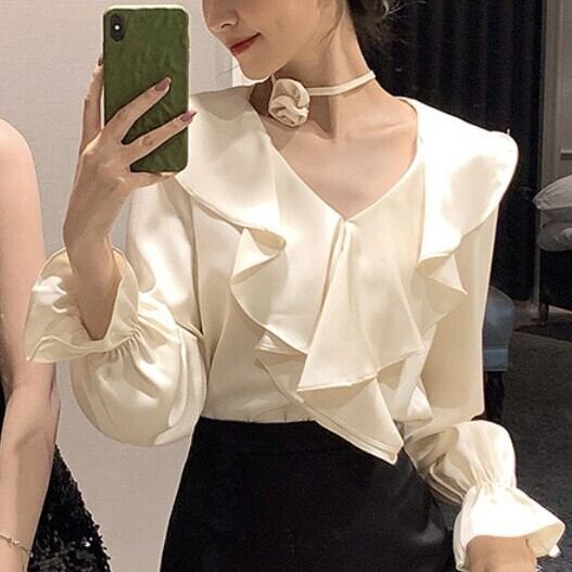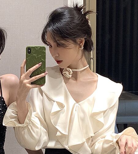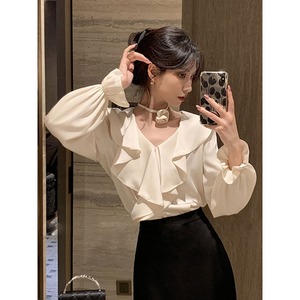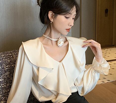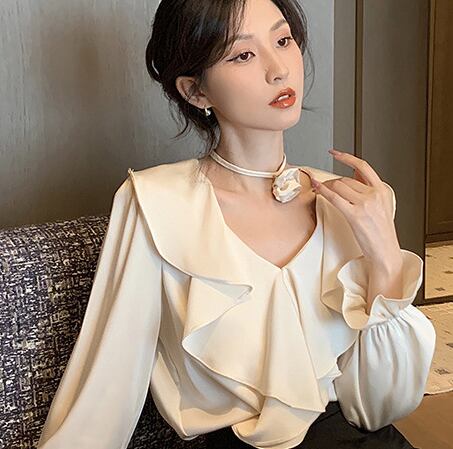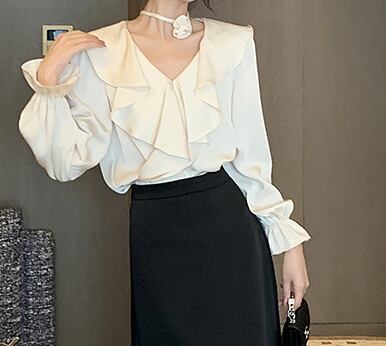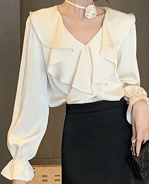 Vネックが顔周りをすっきり見せ、フレアな袖が女性らしいボリュームをプラス。