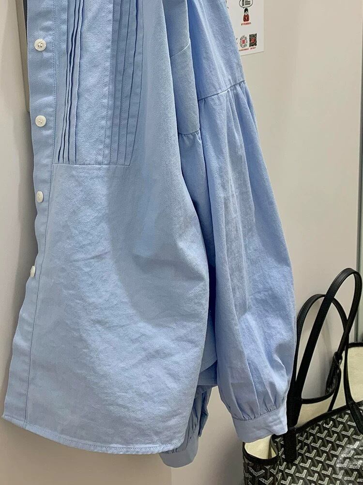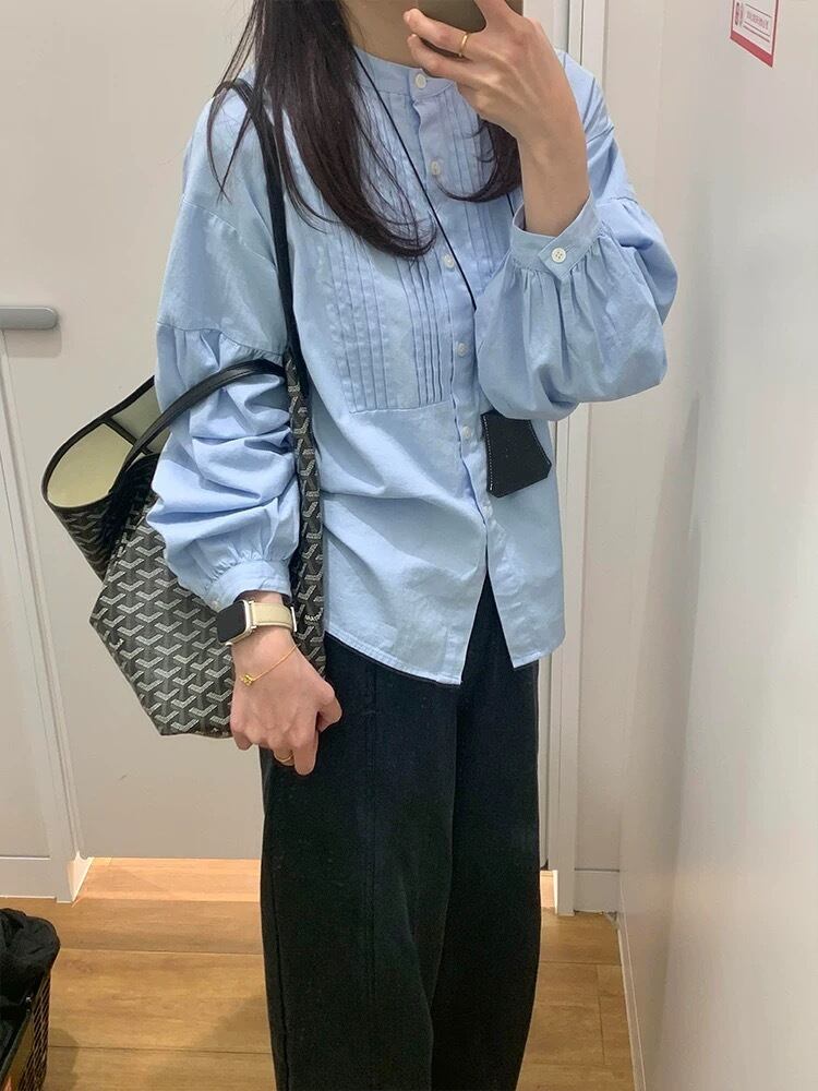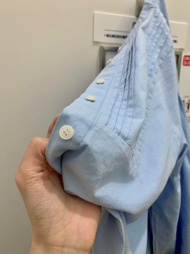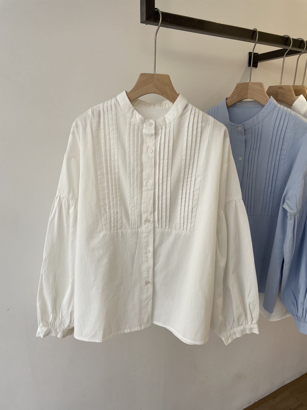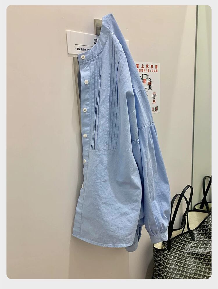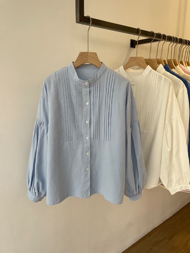 襟なしのデザインに、プリーツとボタンが施されたシンプルながらも清楚な仕様です。