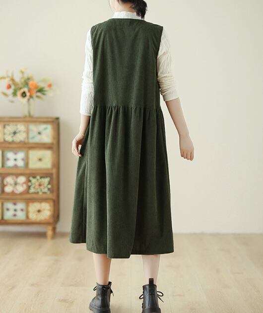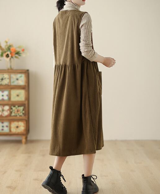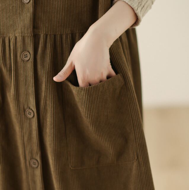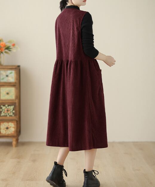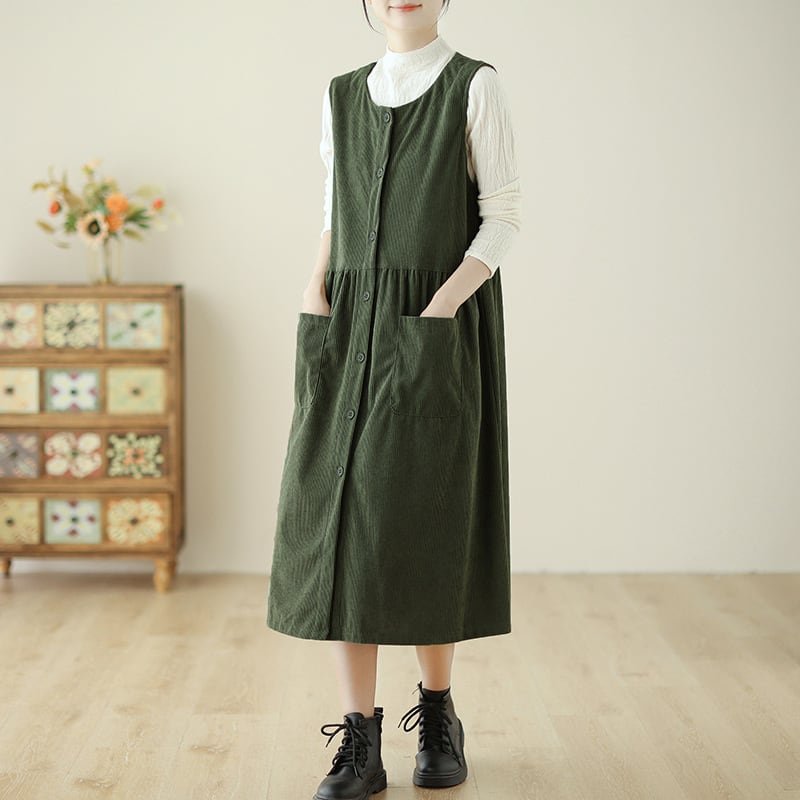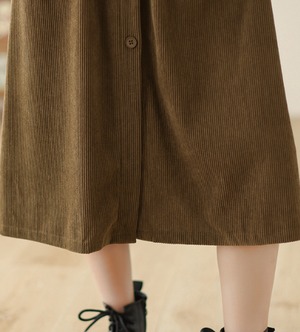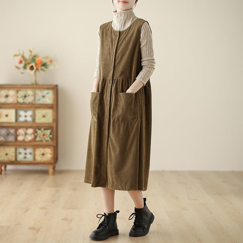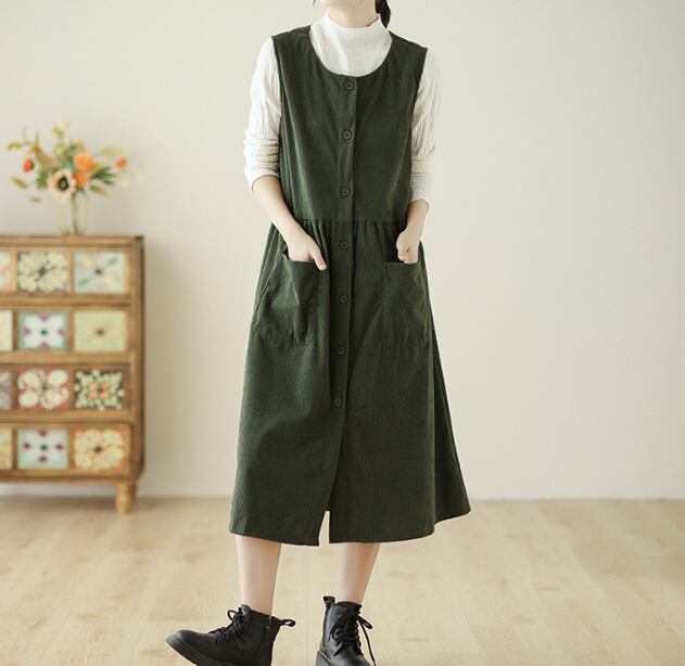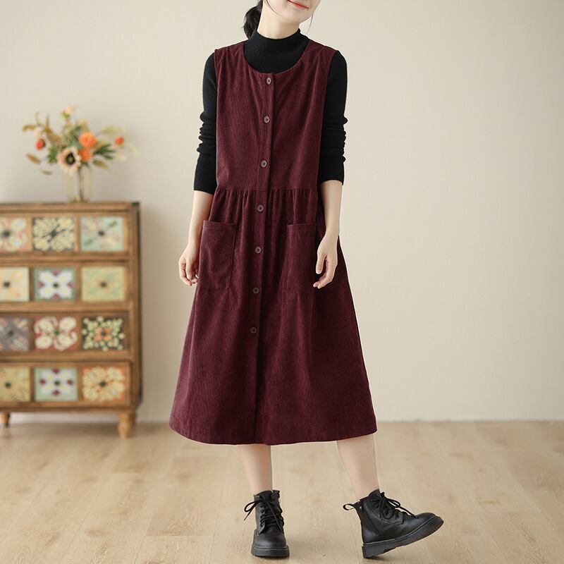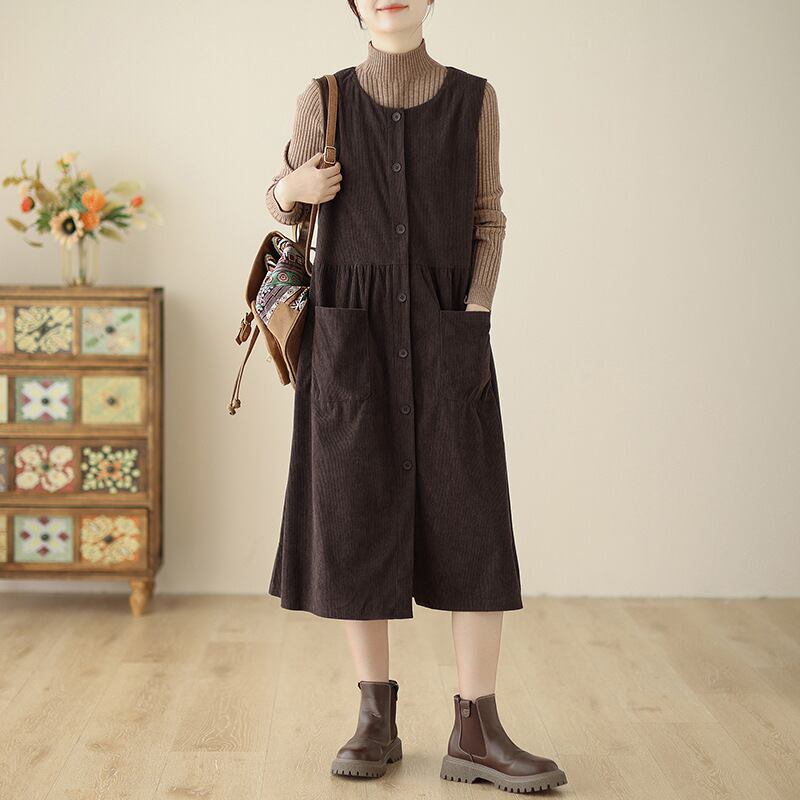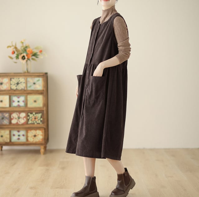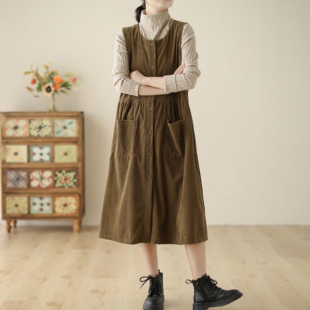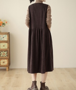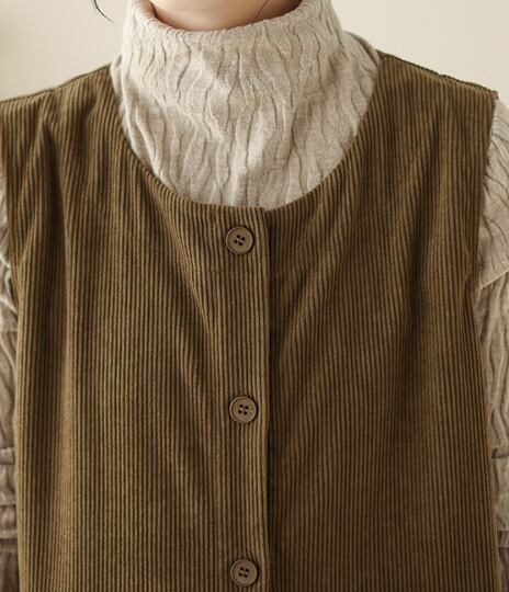 ノースリーブのクルーネックデザインは、コーデュロイ生地で秋っぽい印象が特徴です。