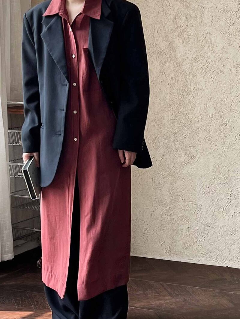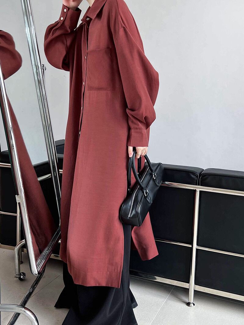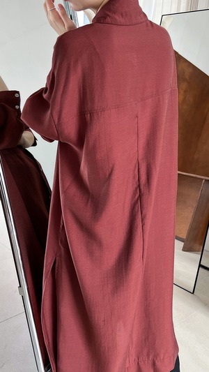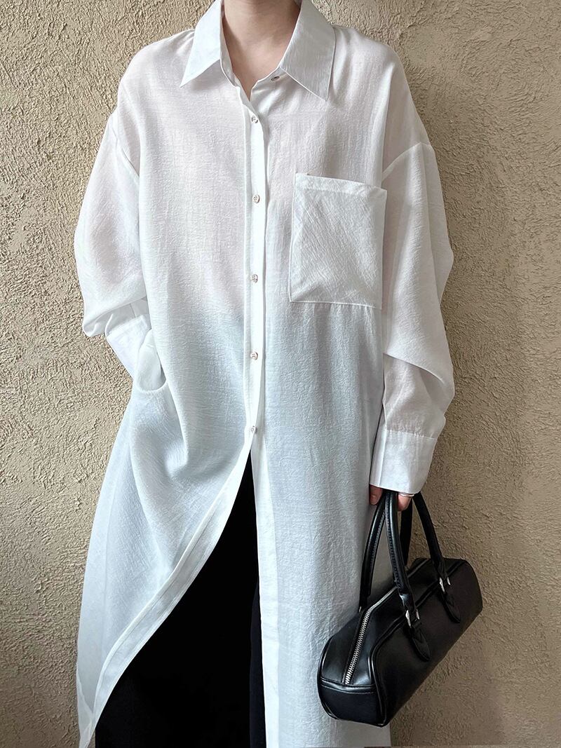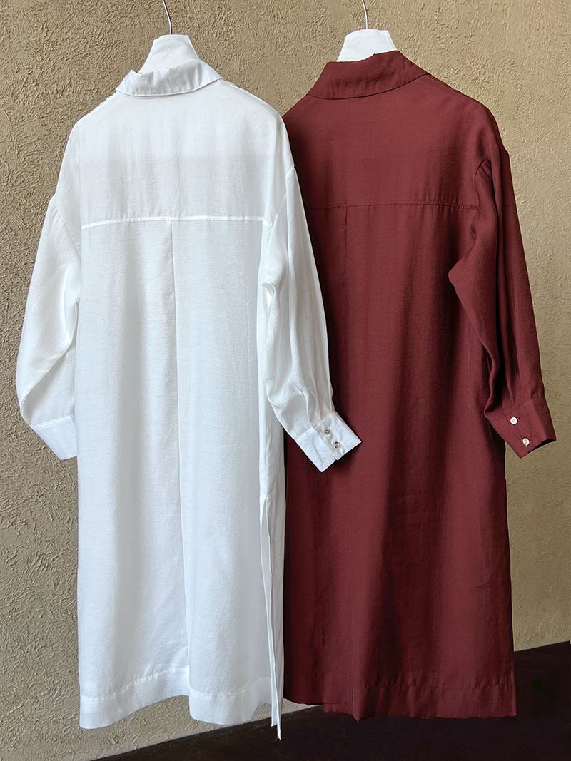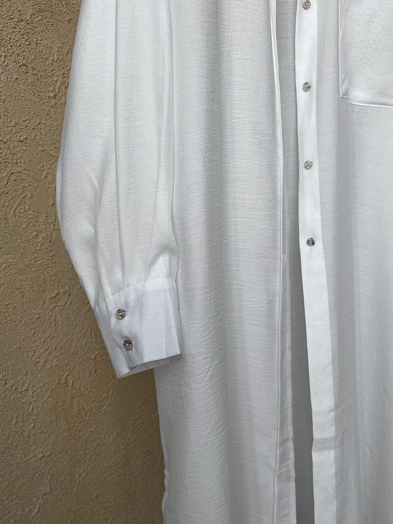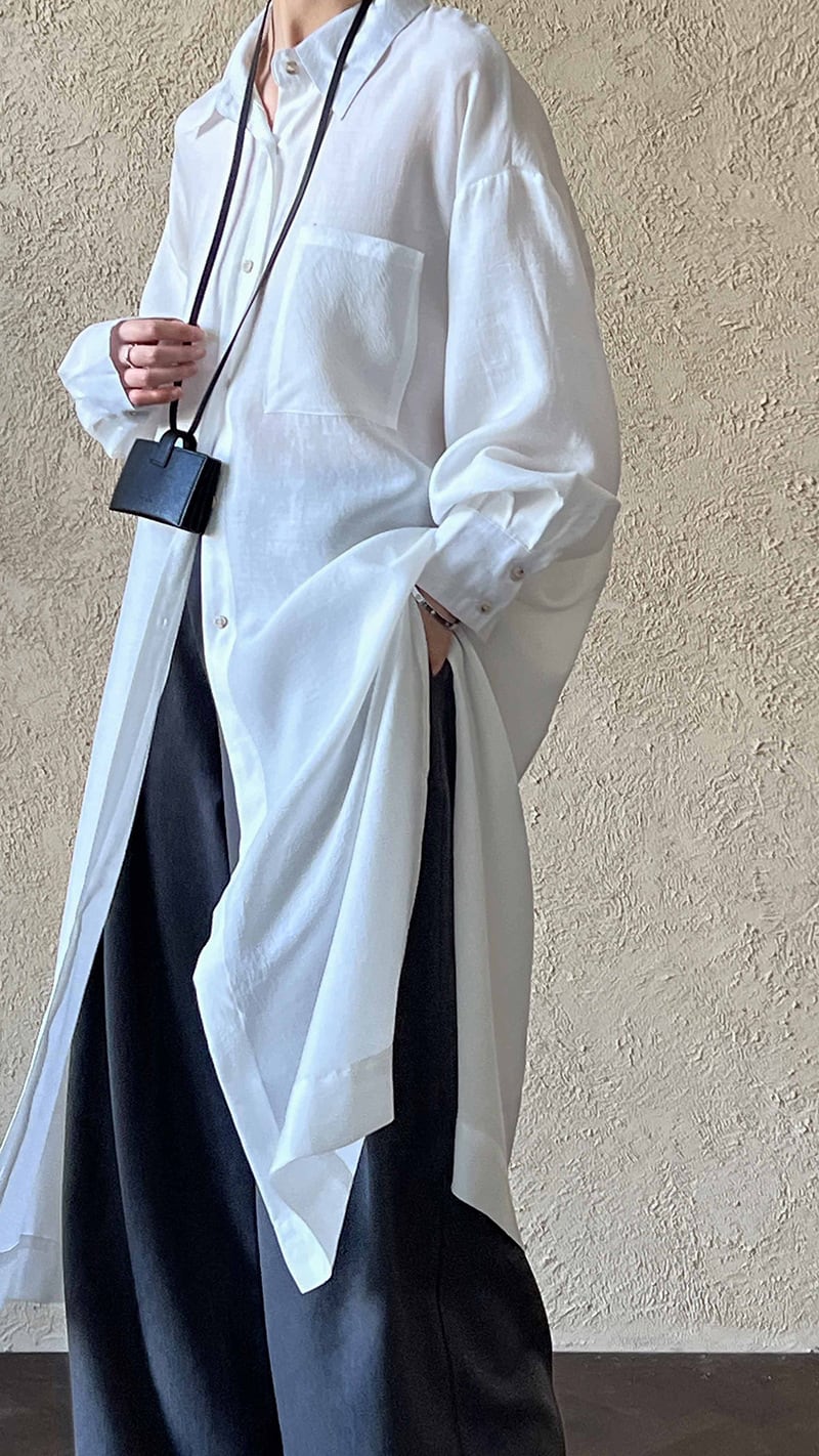 前開きのロング丈に襟付きのデザインが上品さを演出し、オーバーサイズのシルエットがこなれ感を引き立てます。
