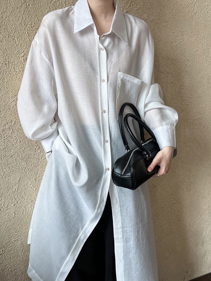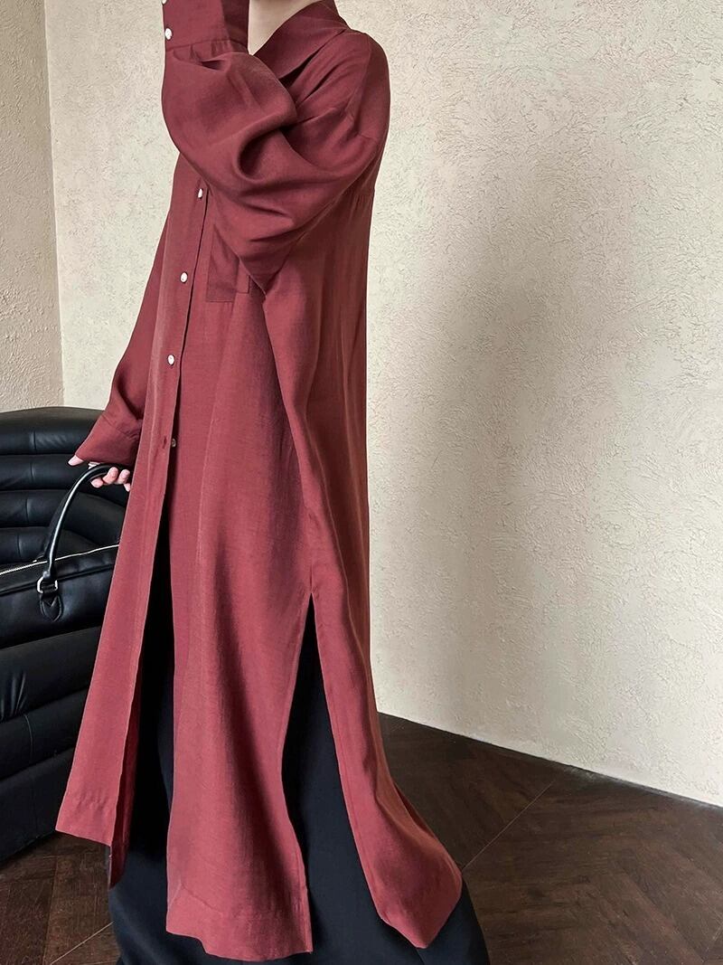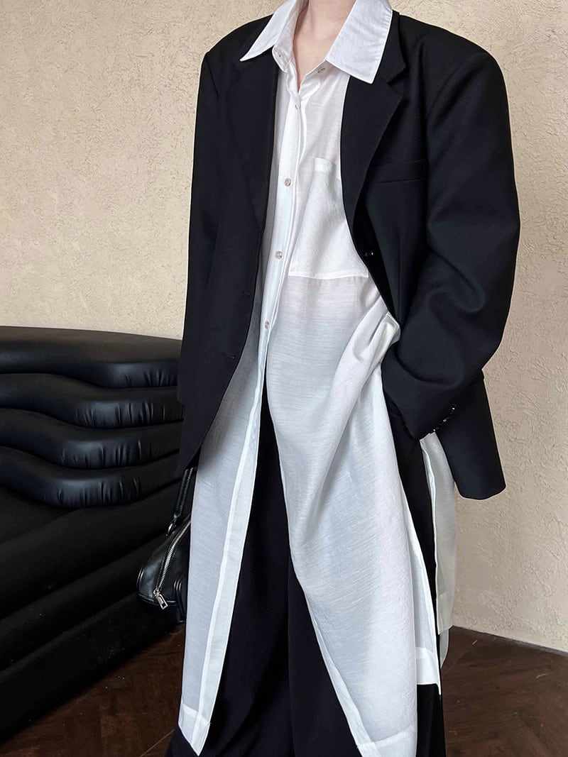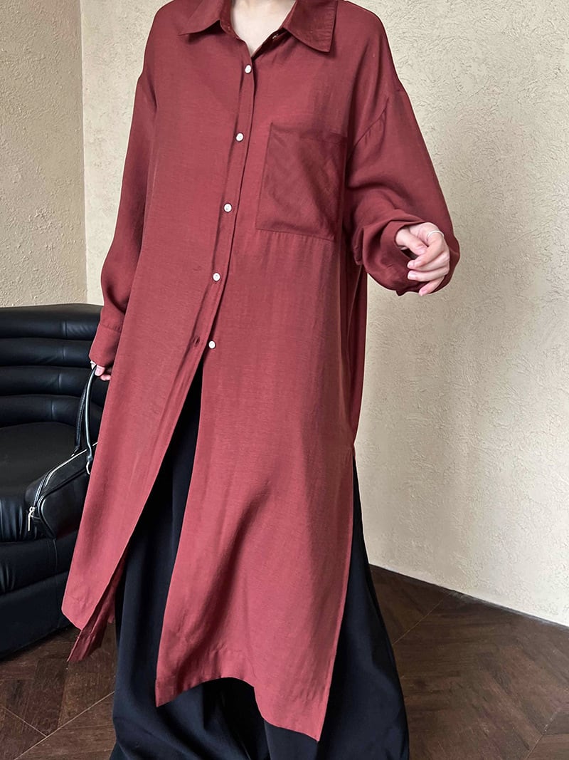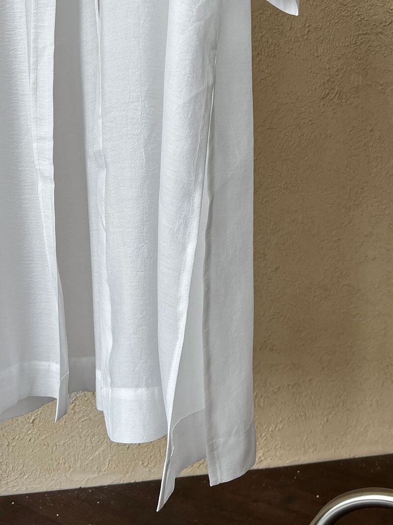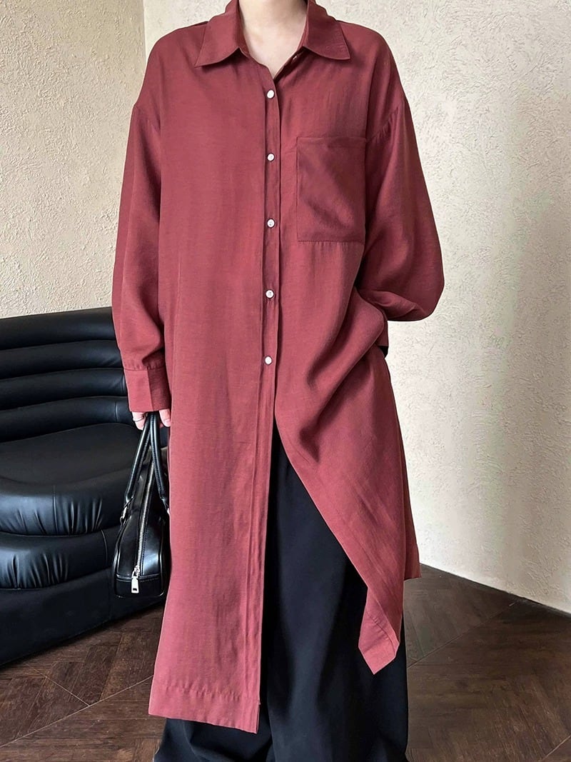前開きのロング丈に襟付きのデザインが上品さを演出し、オーバーサイズのシルエットがこなれ感を引き立てます。