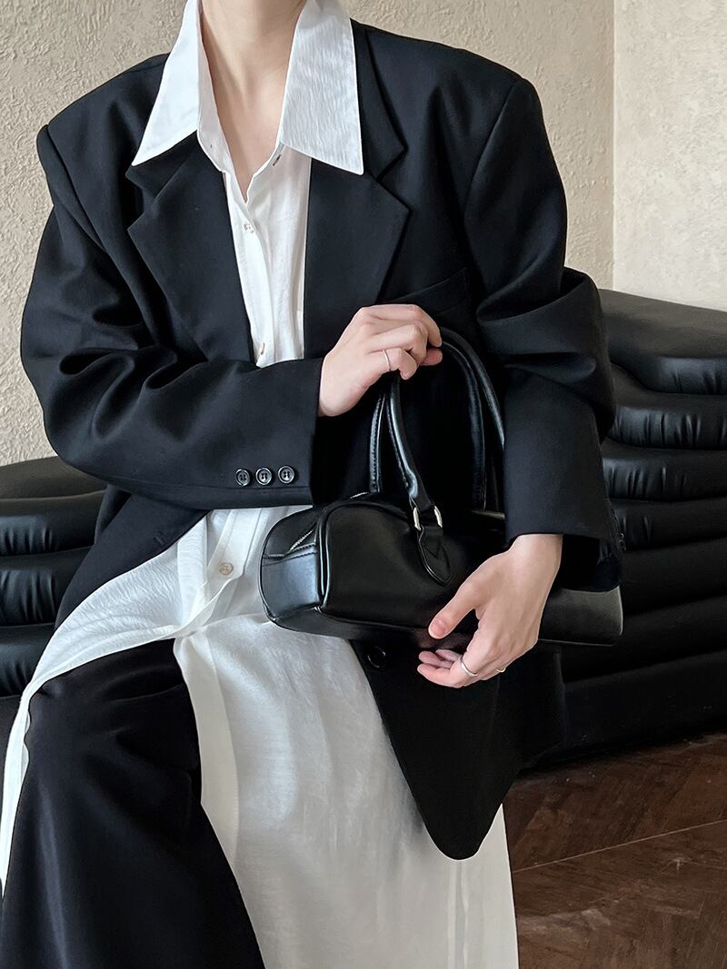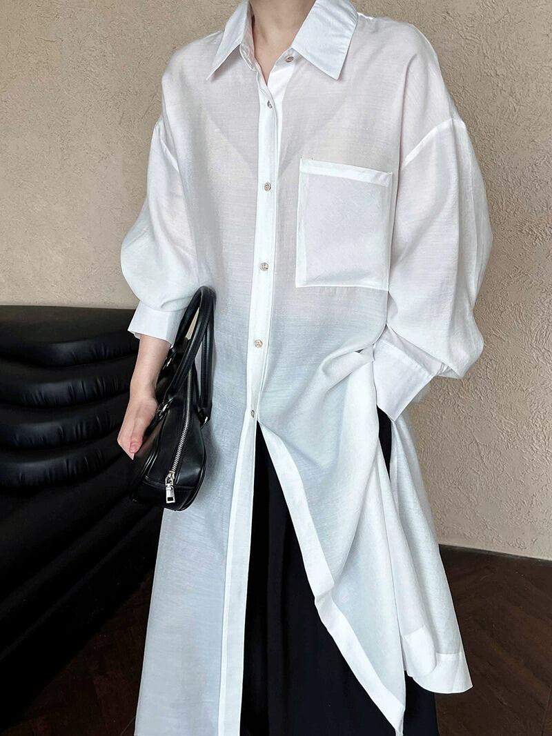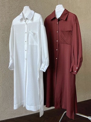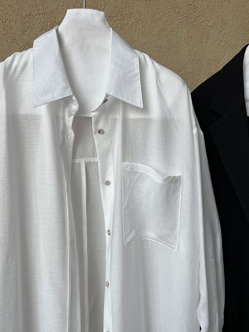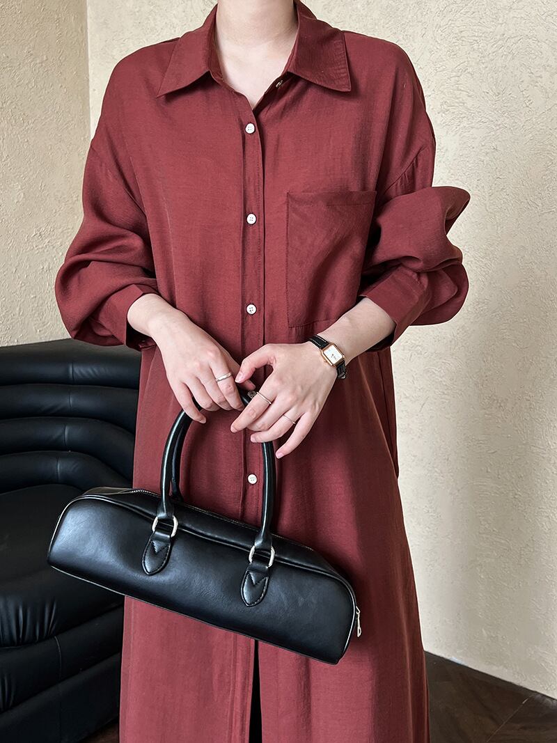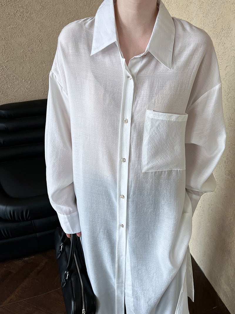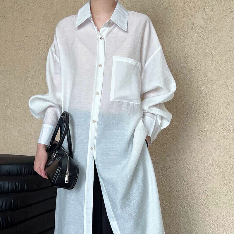 前開きのロング丈に襟付きのデザインが上品さを演出し、オーバーサイズのシルエットがこなれ感を引き立てます。