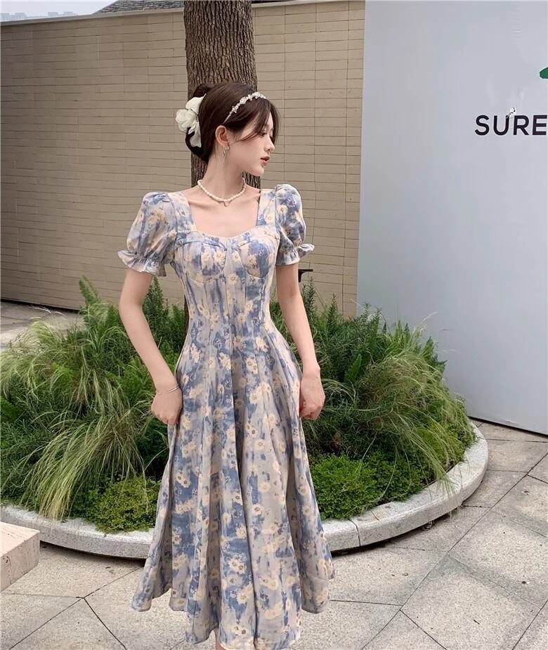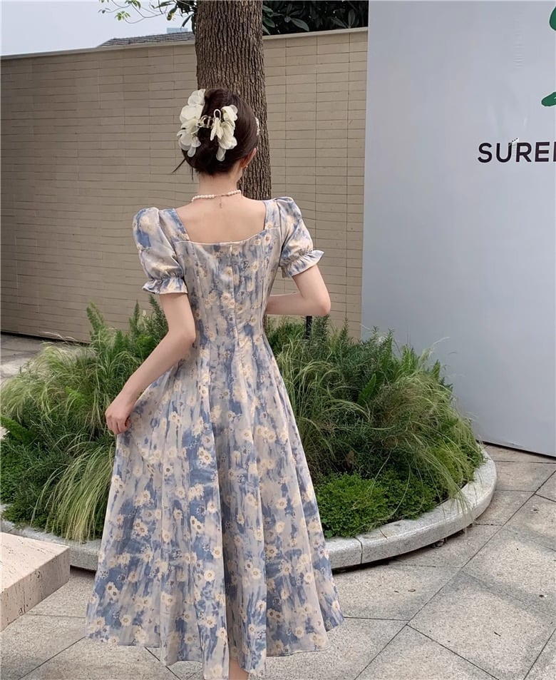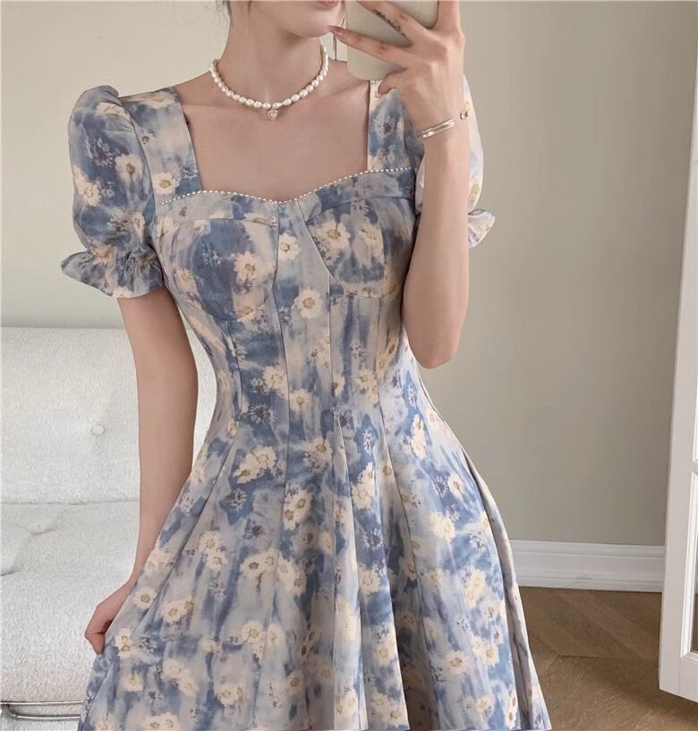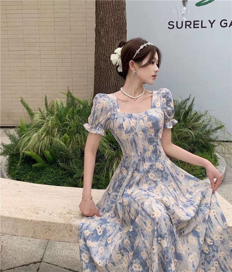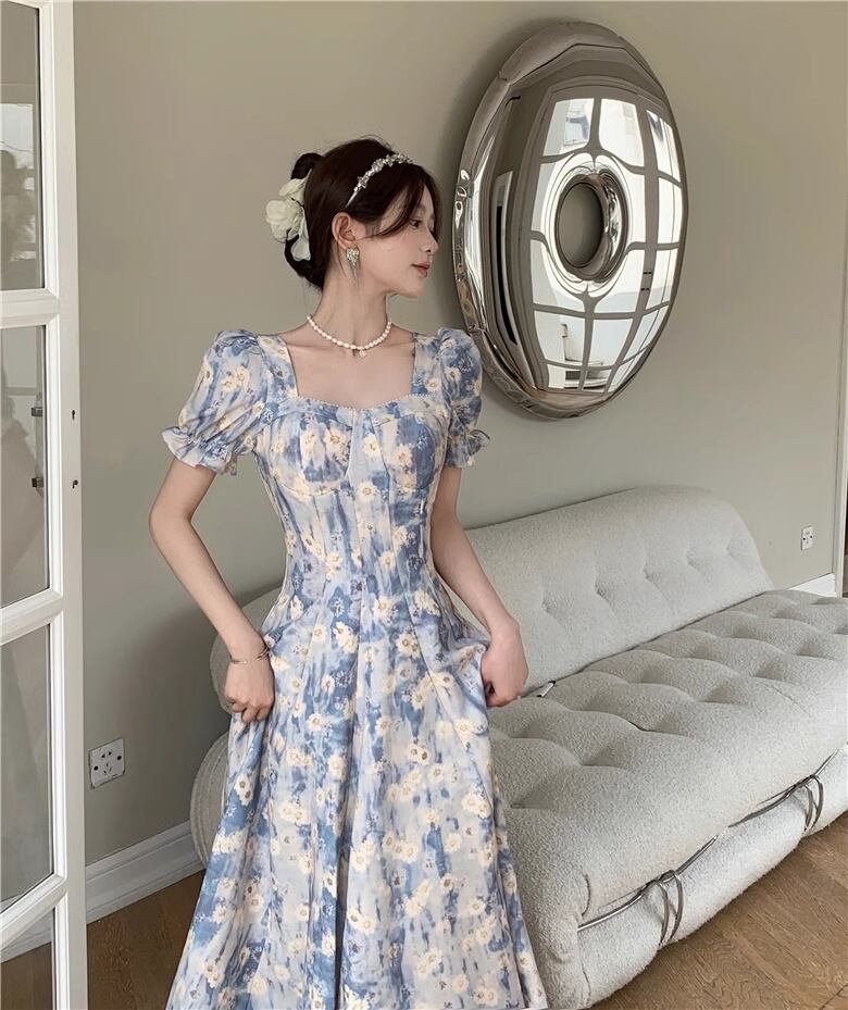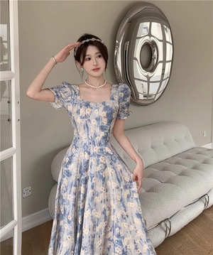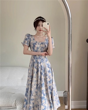 大人可愛い上品な花柄で、半袖のパフスリーブとスクエアネックが大人可愛い印象を与えます。