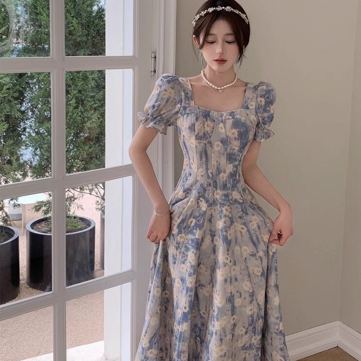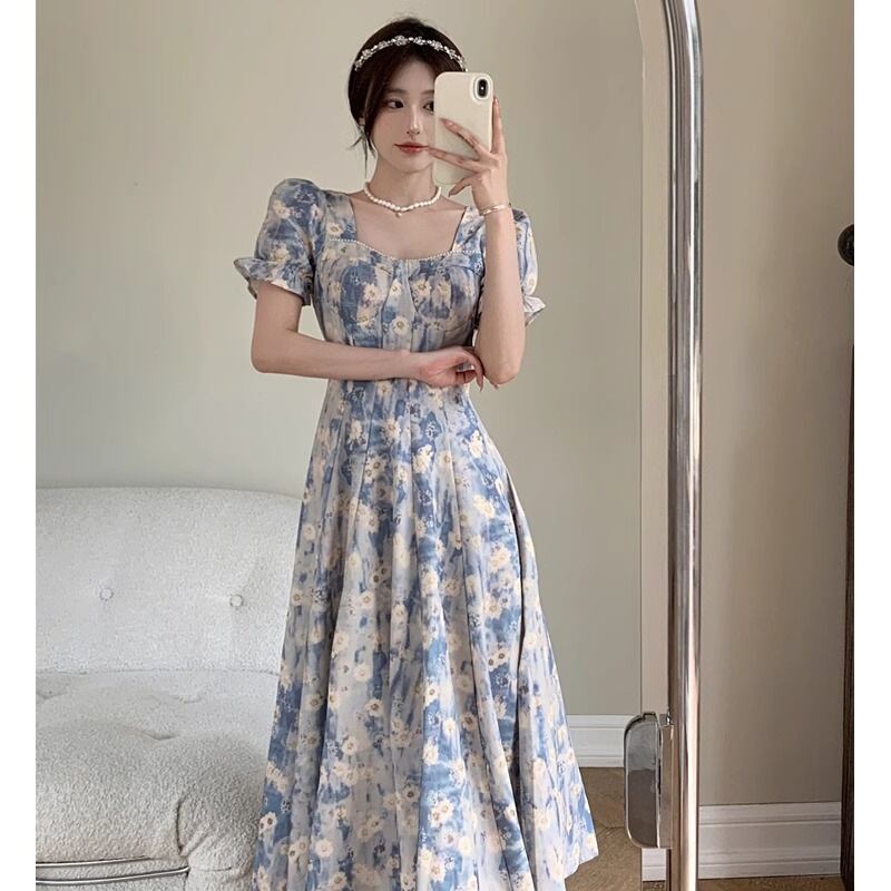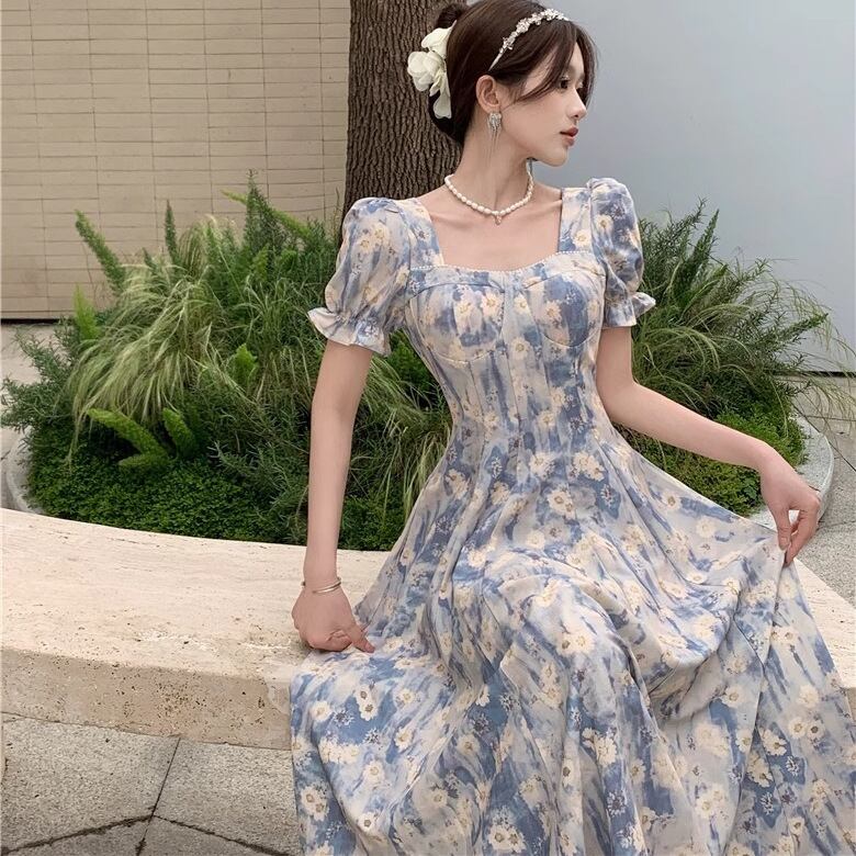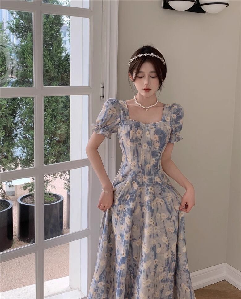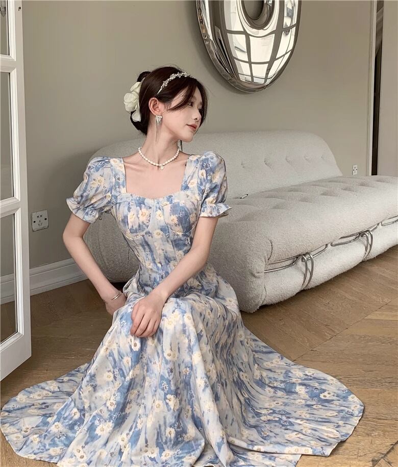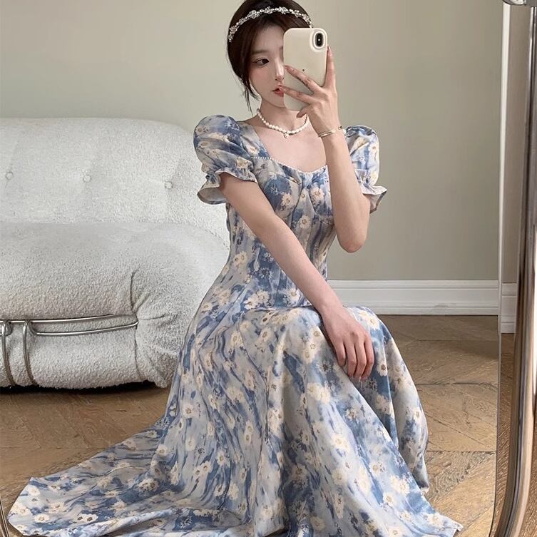 大人可愛い上品な花柄で、半袖のパフスリーブとスクエアネックが大人可愛い印象を与えます。
