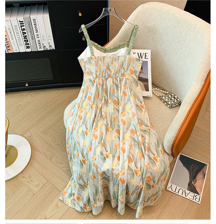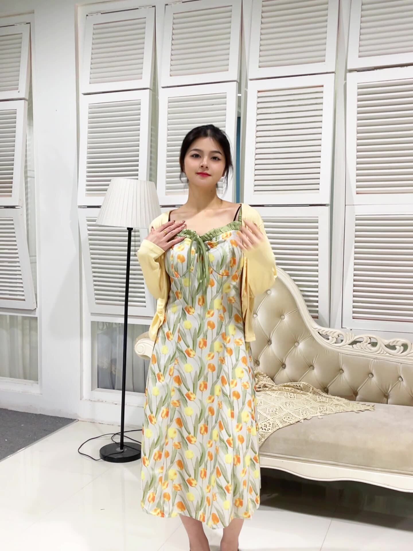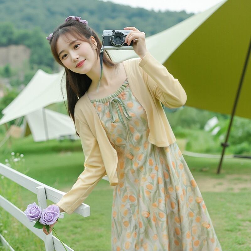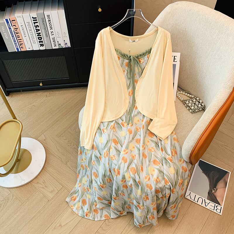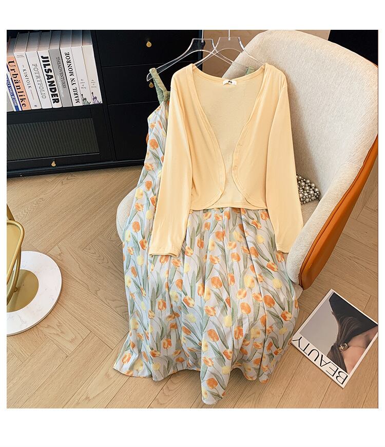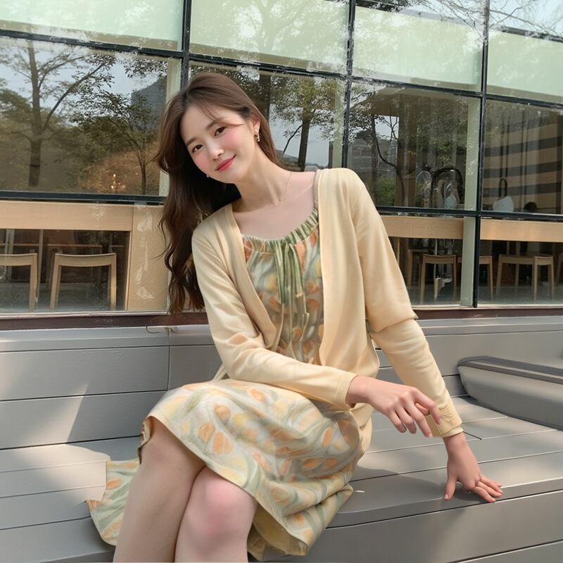 ミモレ丈のフレアワンピースと透け感のある長袖ストップスの2点セットです。