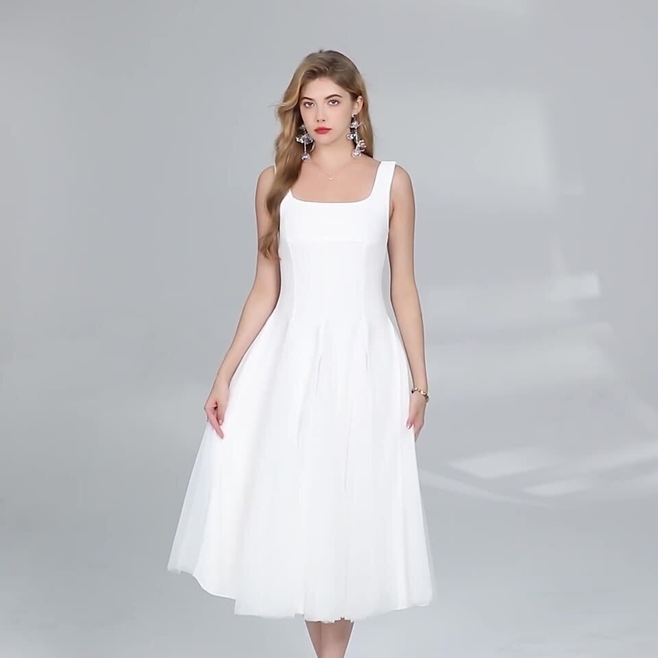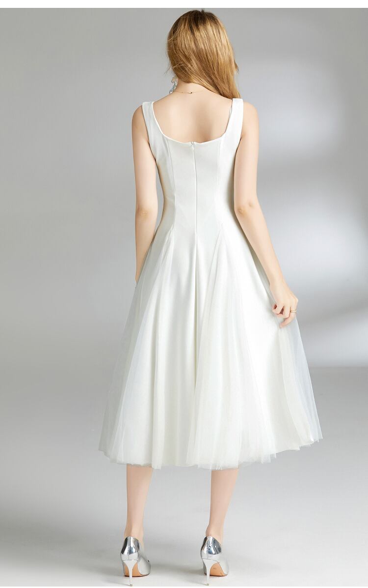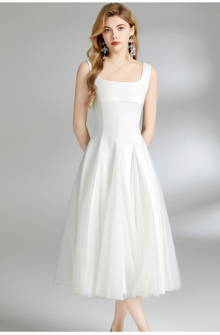 膝下のミモレ丈とノースリーブ、洗練されたスクエアネックが大人の魅力を引き立てます。