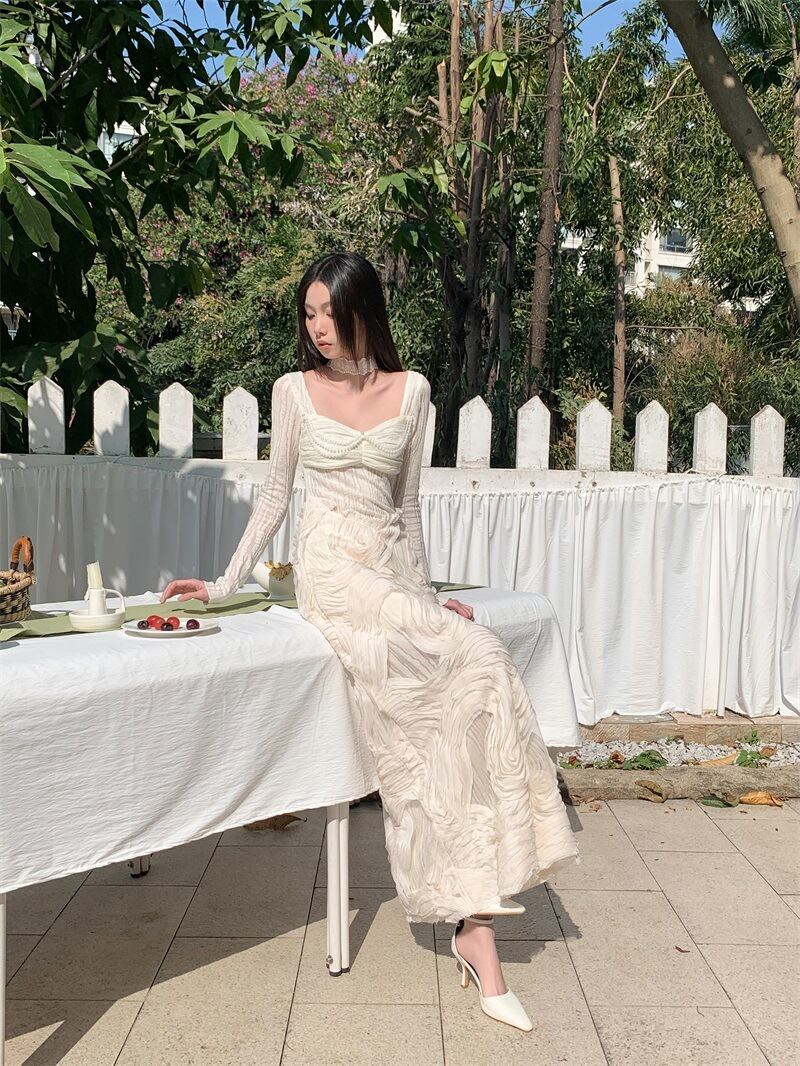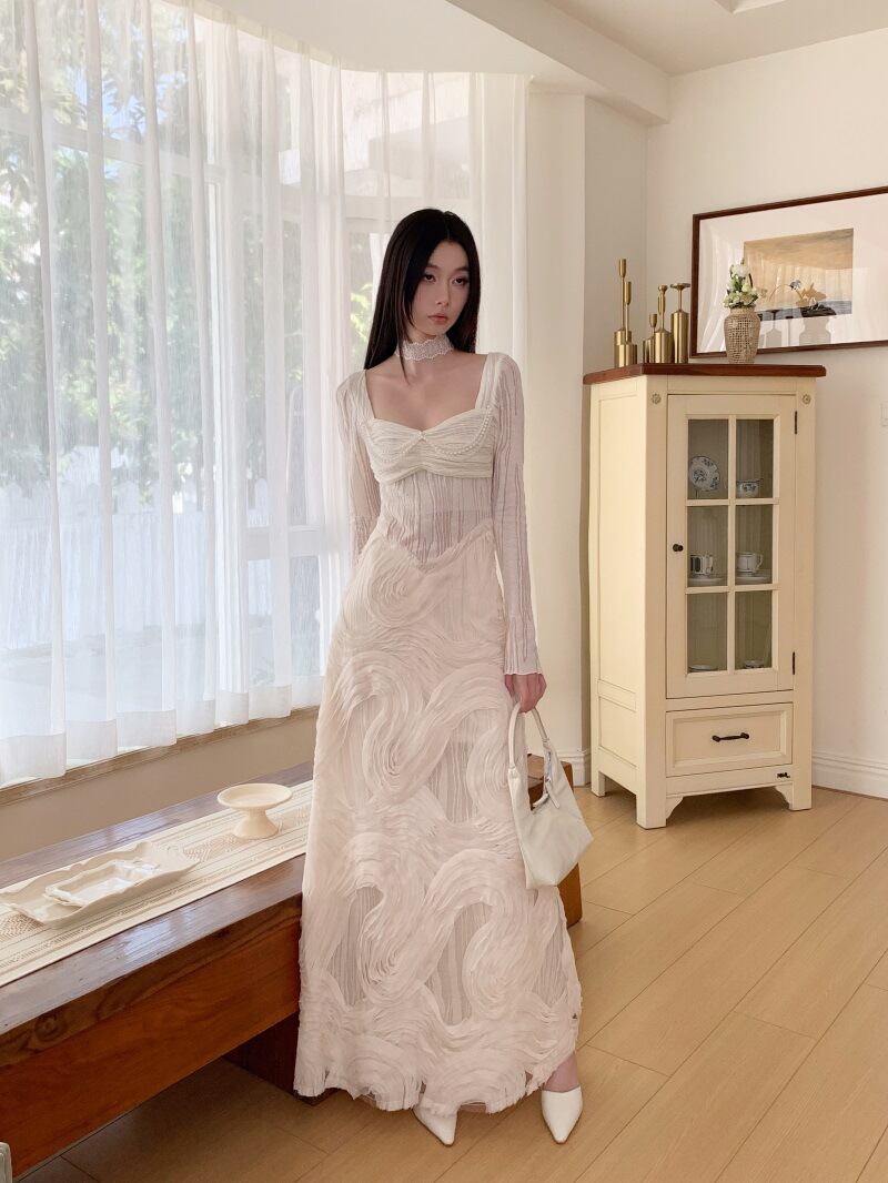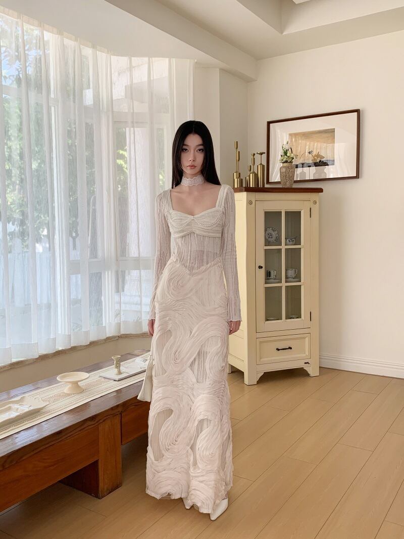 長袖とフレアスリーブのデザインが特徴で、さらにスクエアネックがデコルテを美しく演出。