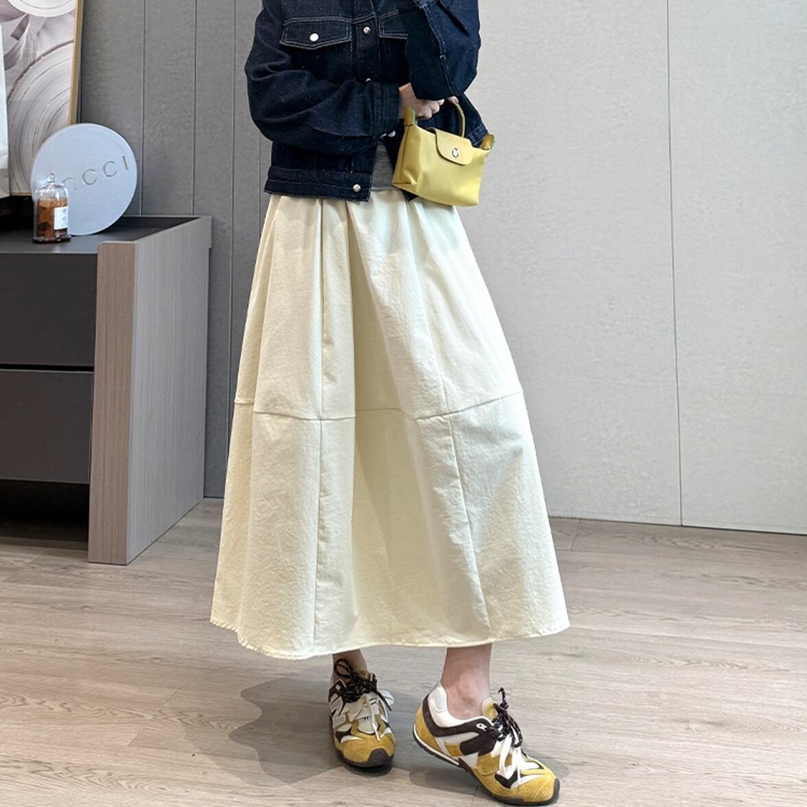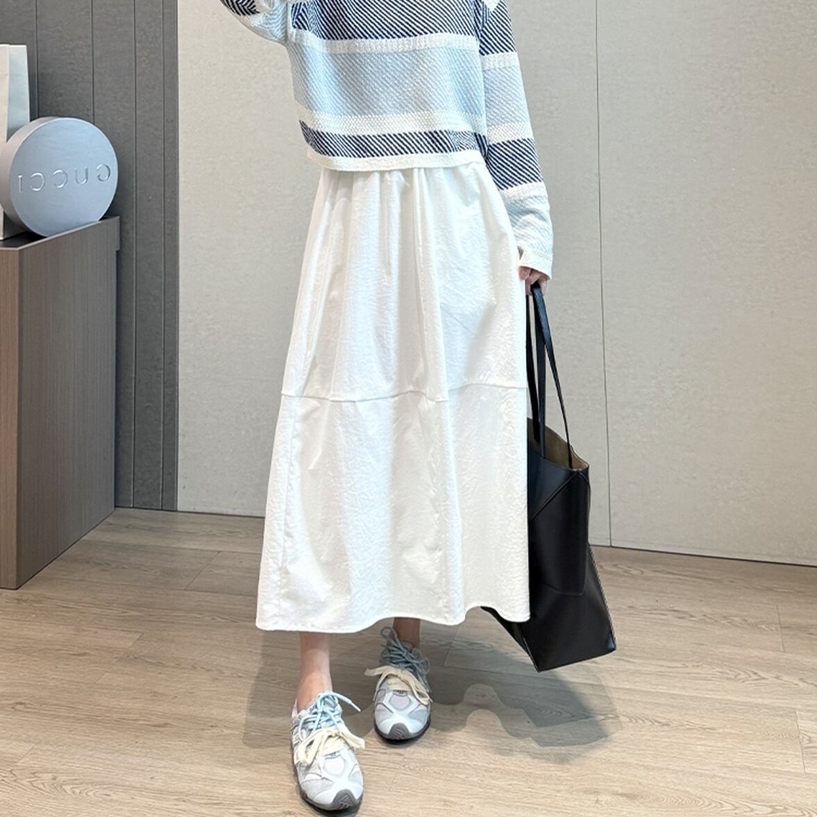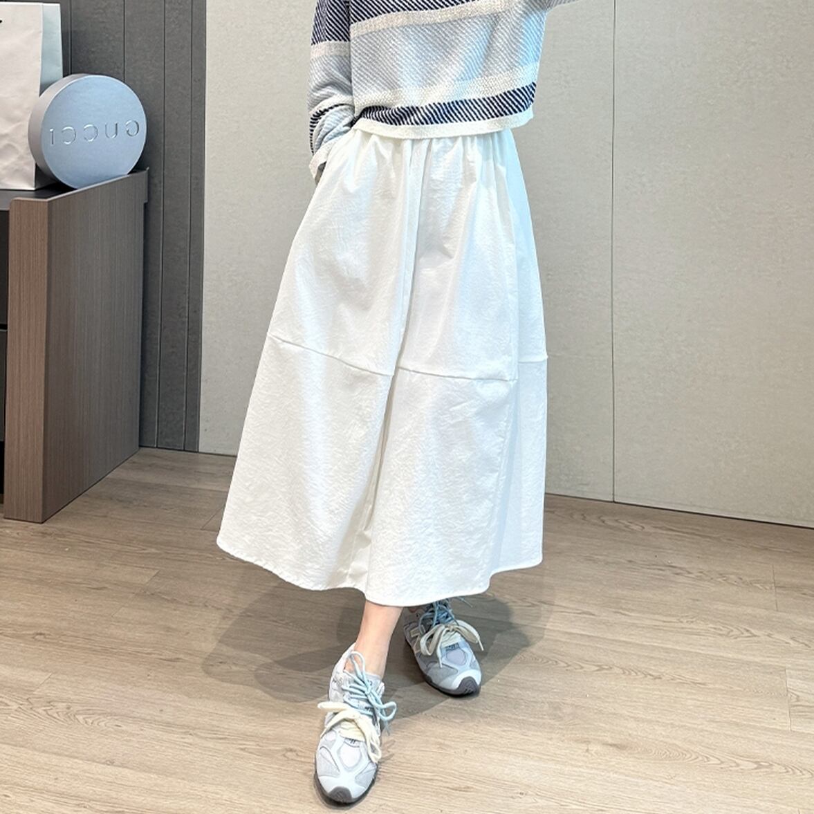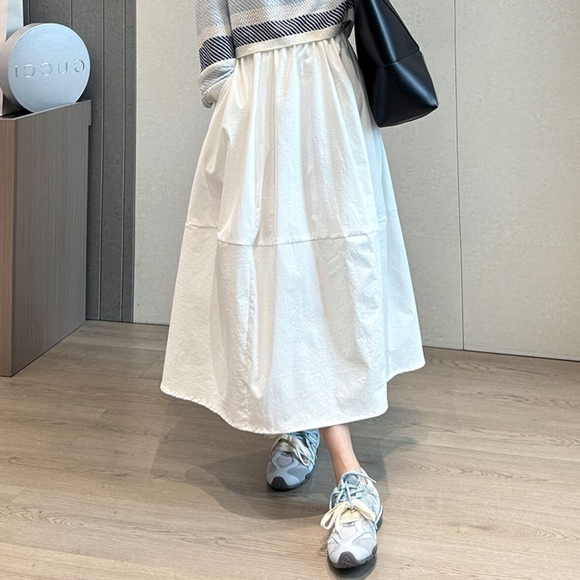 着るだけで鮮度が上がるロング丈、ウエストゴムでストレスフリーな着心地、真ん中で切り替えるデザインがアクセントのスカート。