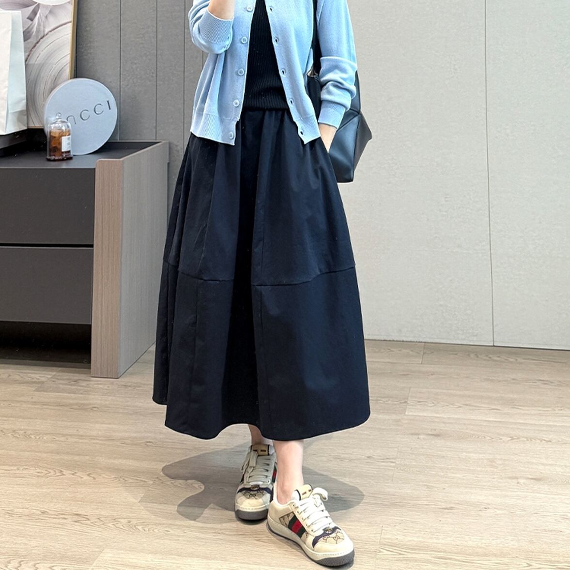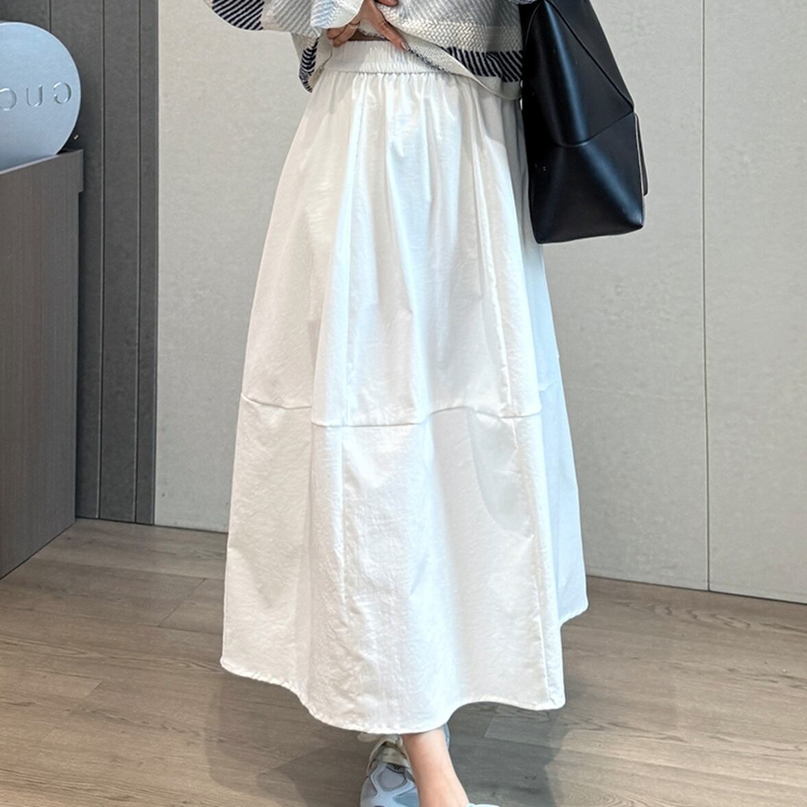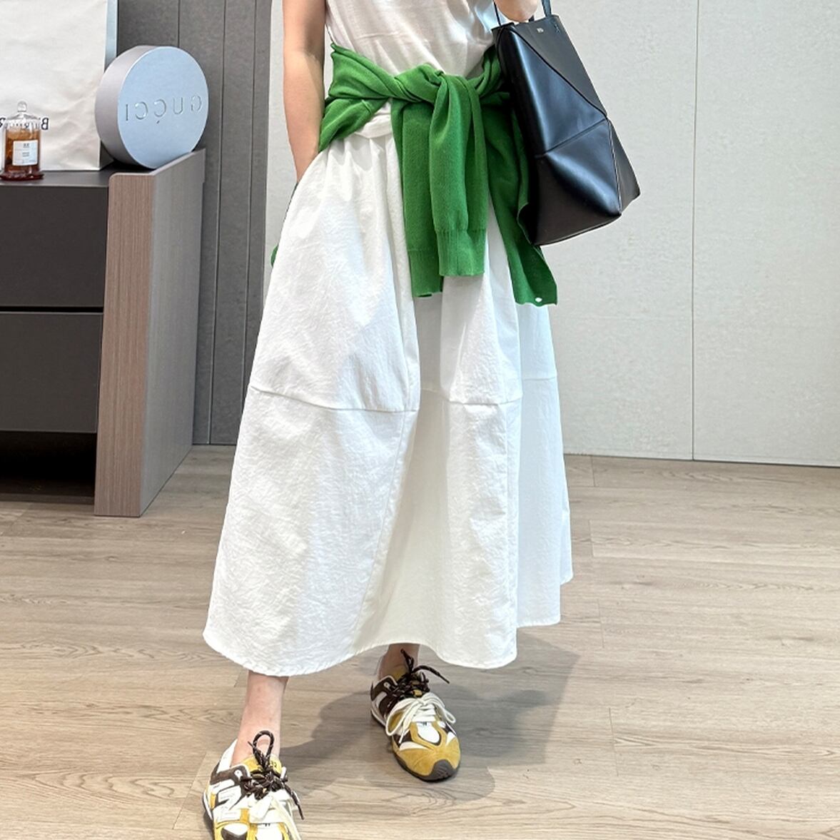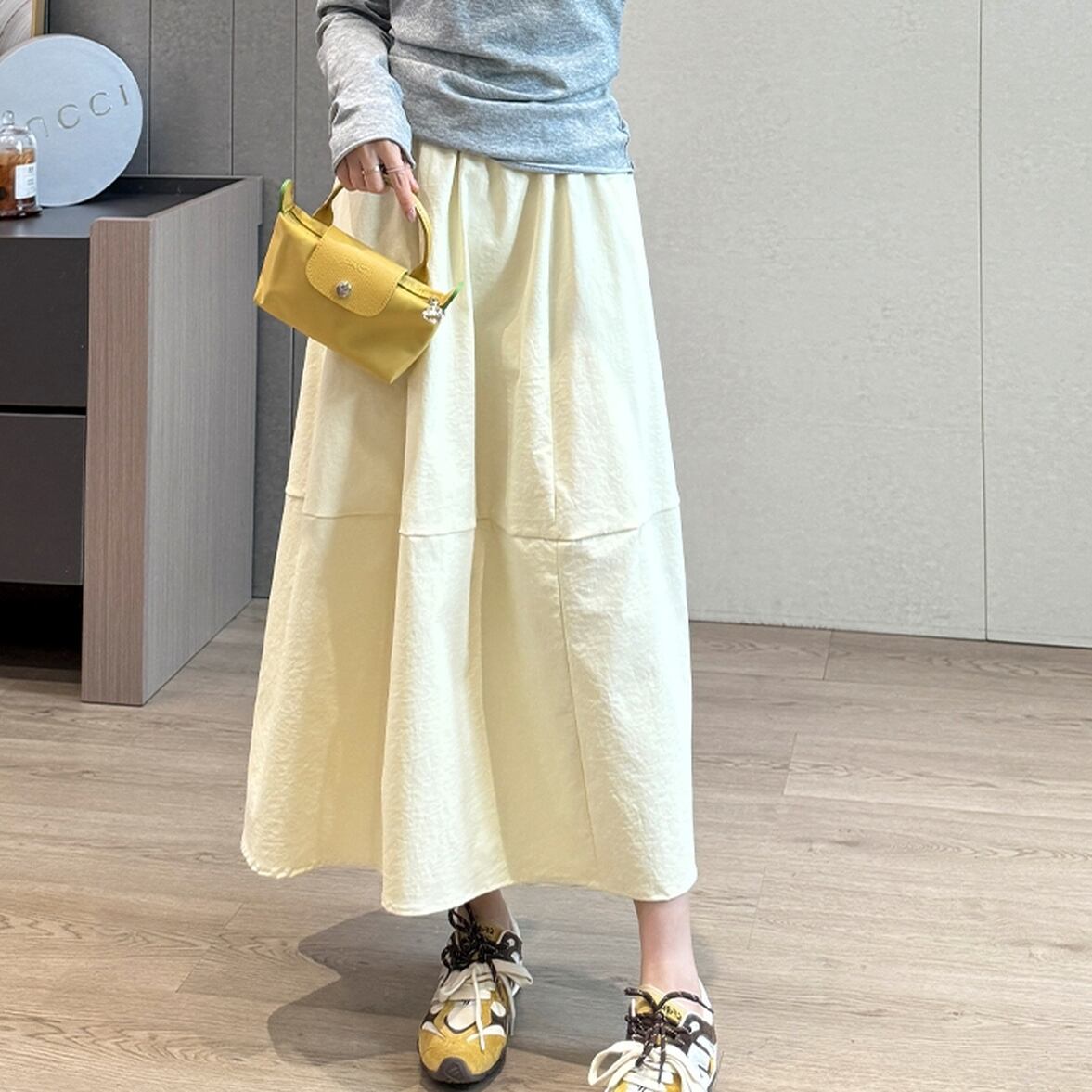 着るだけで鮮度が上がるロング丈、ウエストゴムでストレスフリーな着心地、真ん中で切り替えるデザインがアクセントのスカート。