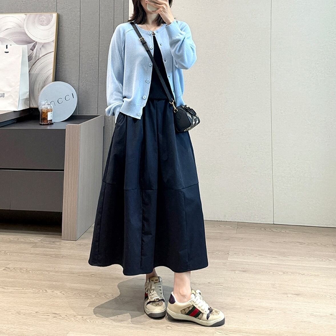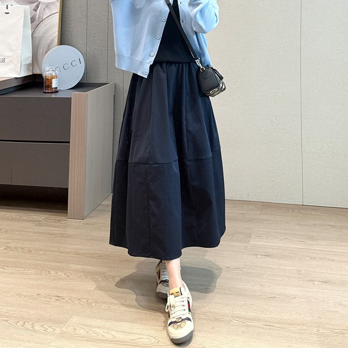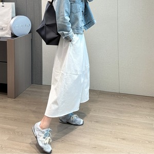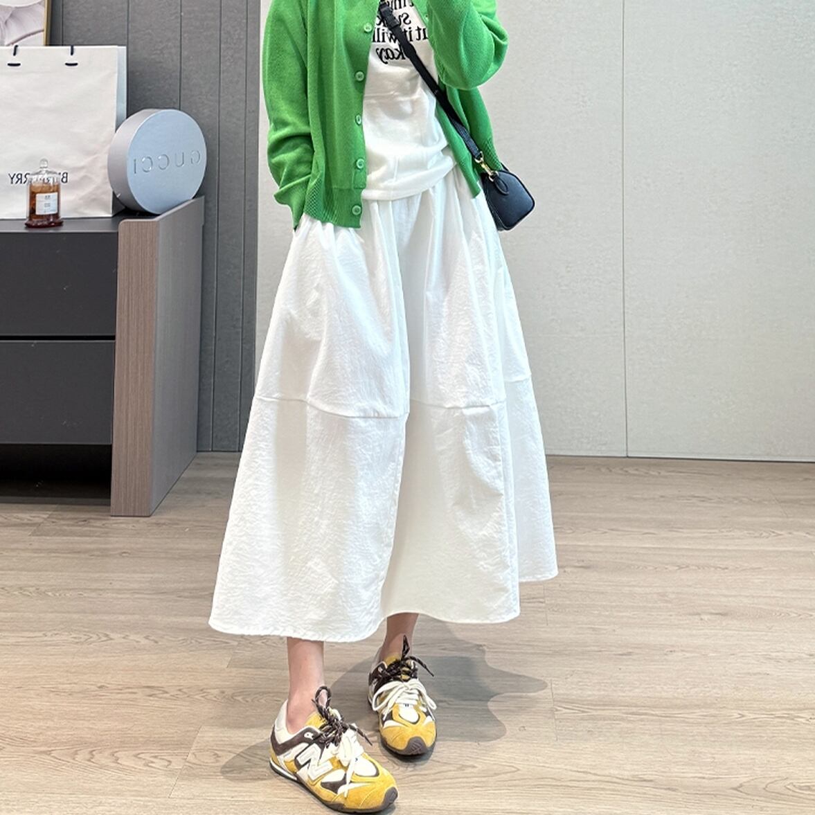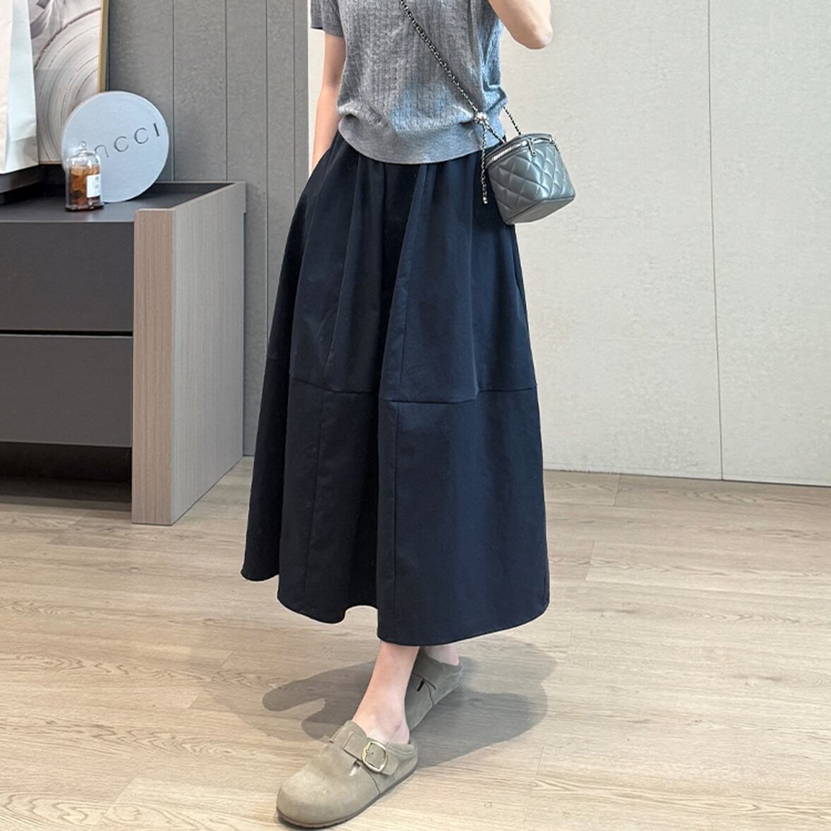 着るだけで鮮度が上がるロング丈、ウエストゴムでストレスフリーな着心地、真ん中で切り替えるデザインがアクセントのスカート。