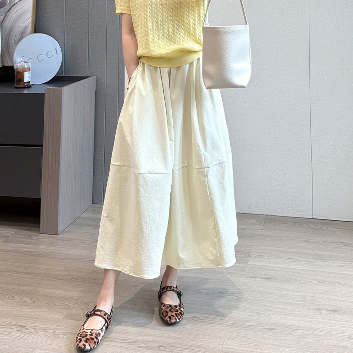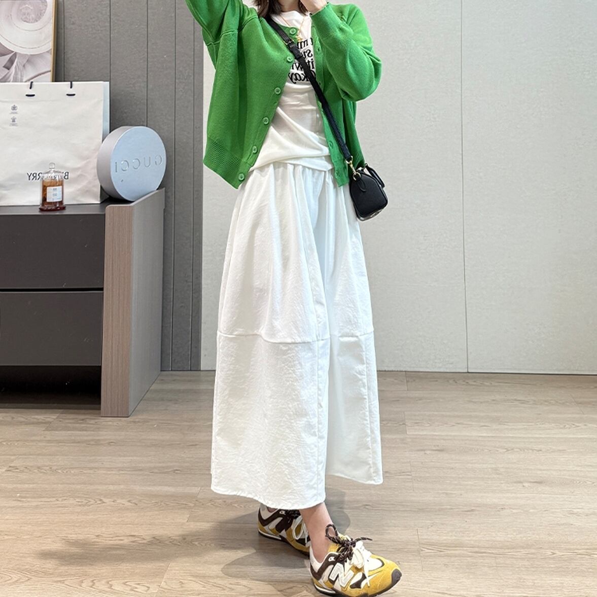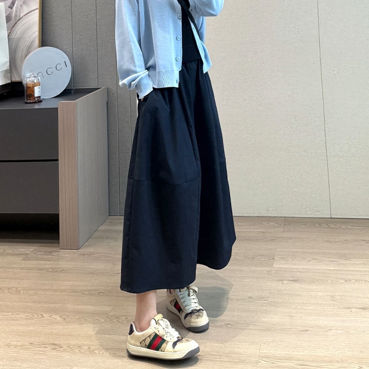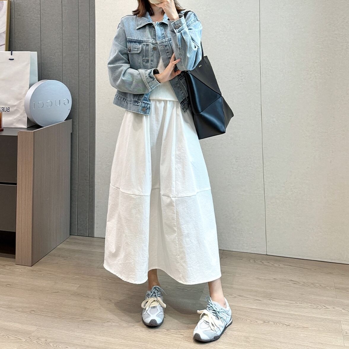 着るだけで鮮度が上がるロング丈、ウエストゴムでストレスフリーな着心地、真ん中で切り替えるデザインがアクセントのスカート。
