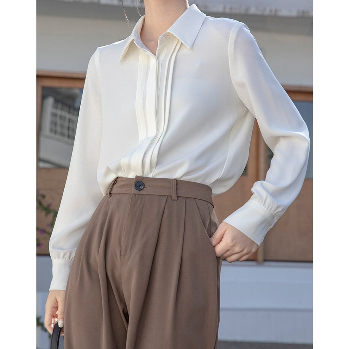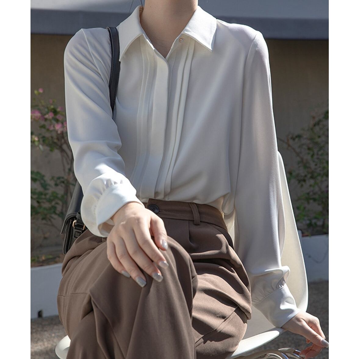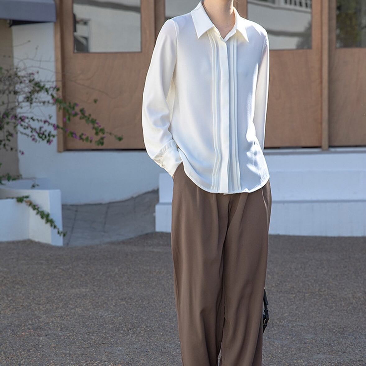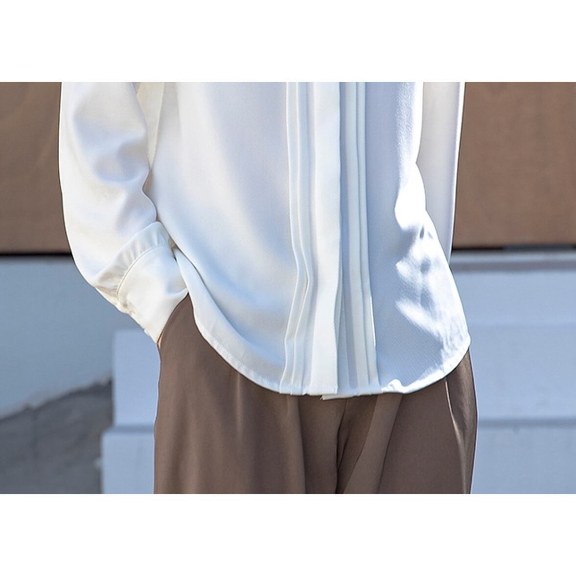 フロントのプリーツラインがシンプルですっきり見え、幅広いシーンでさりげなくアクセントを発揮するシャツ。