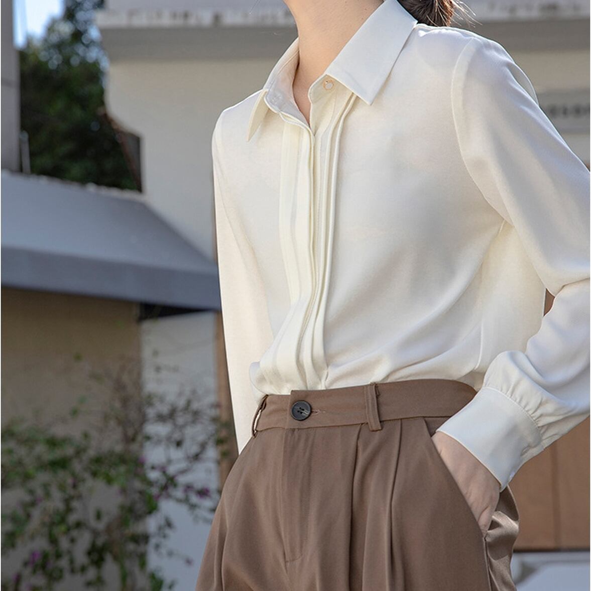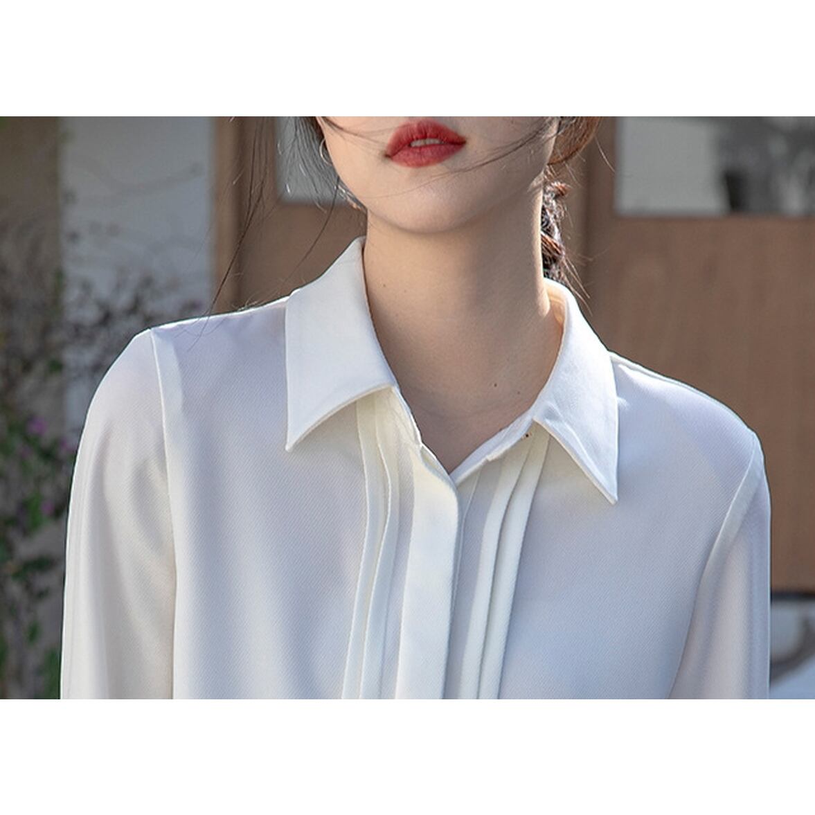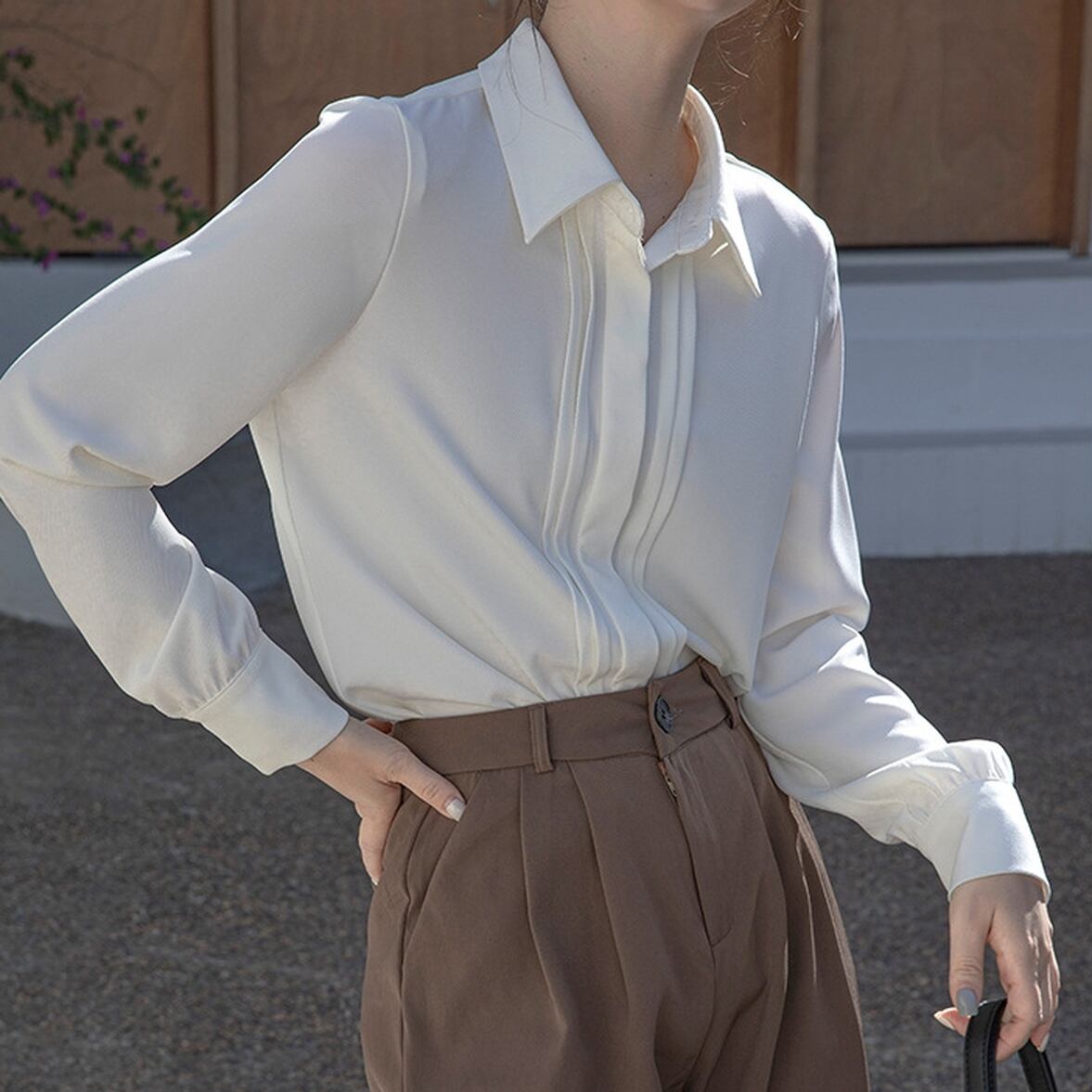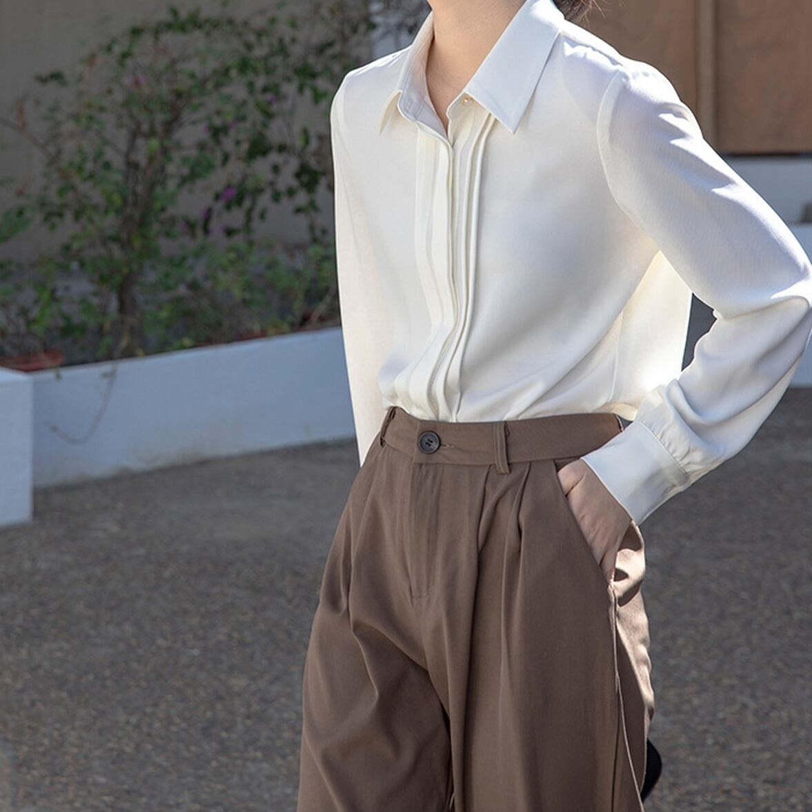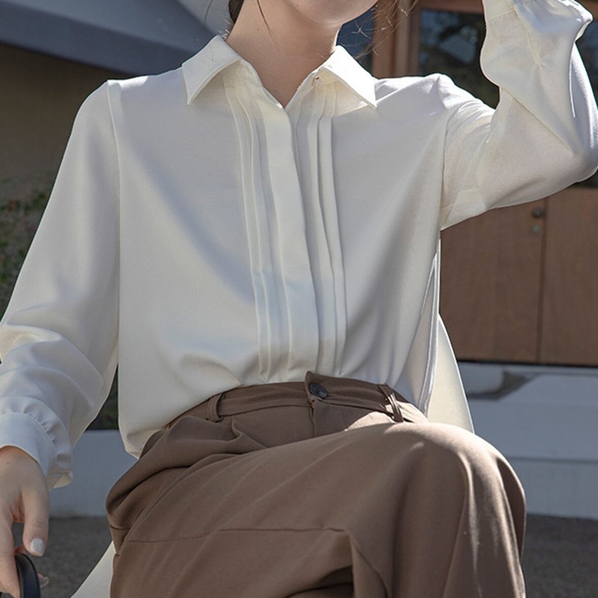 フロントのプリーツラインがシンプルですっきり見え、幅広いシーンでさりげなくアクセントを発揮するシャツ。
