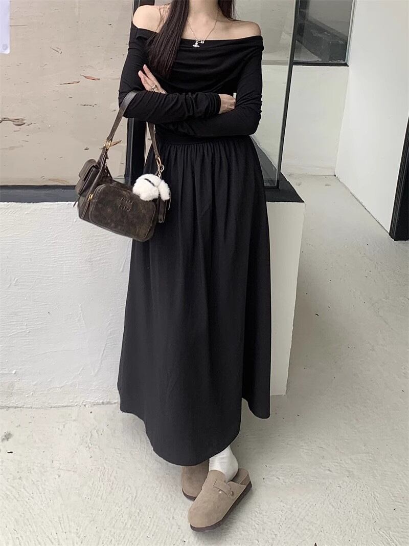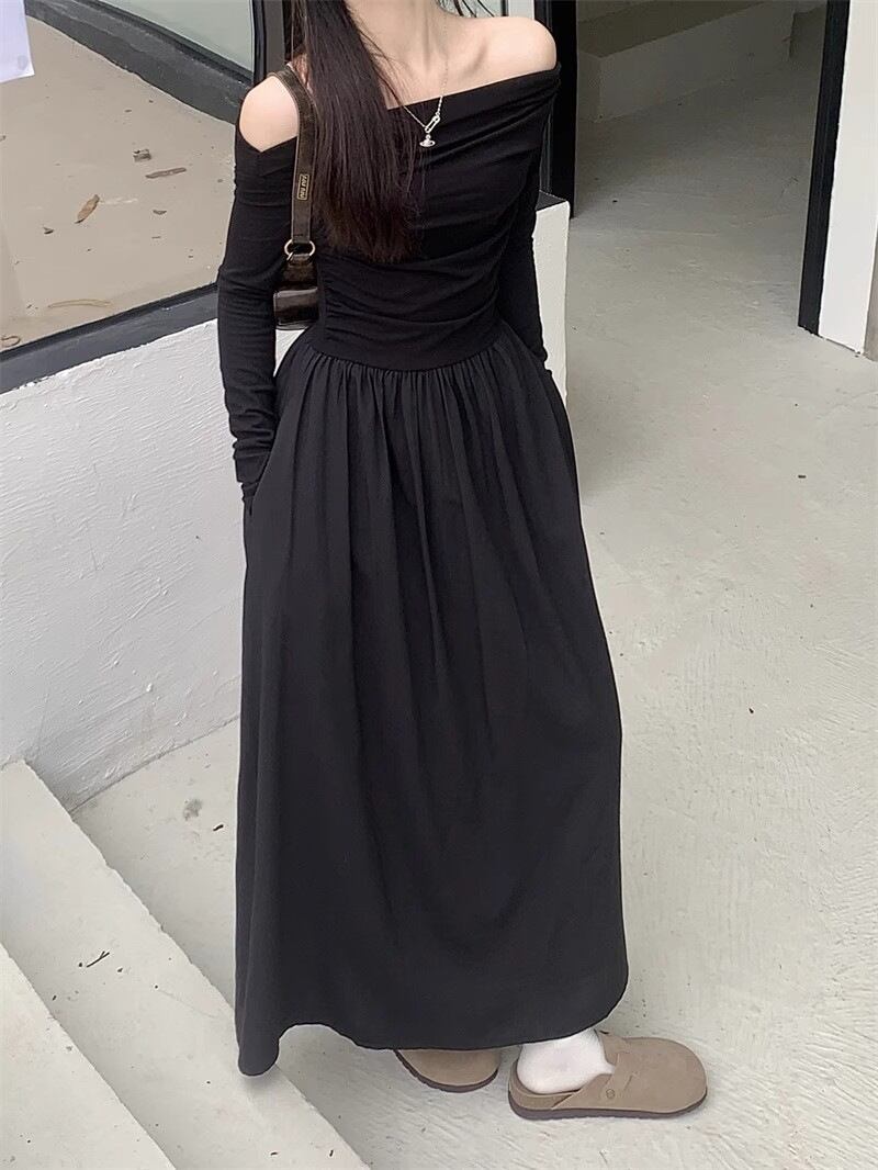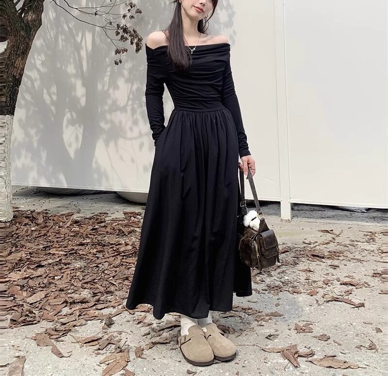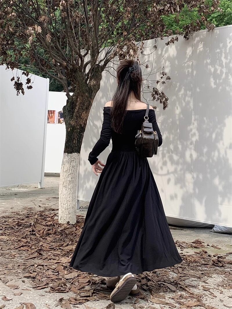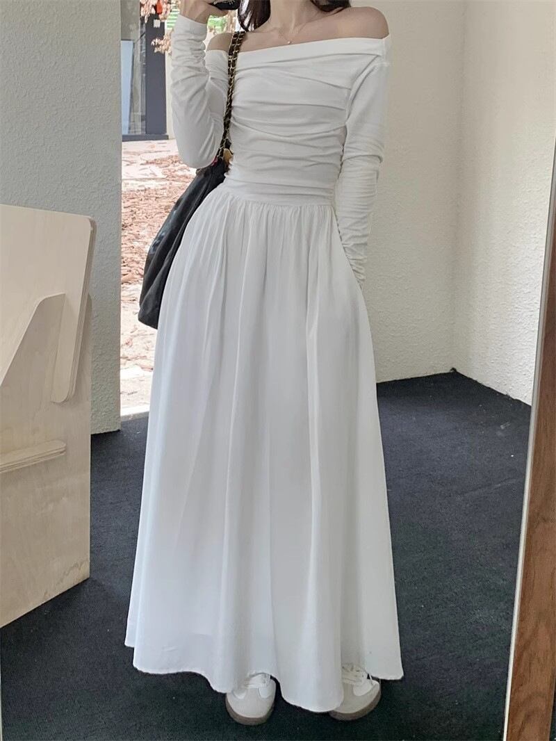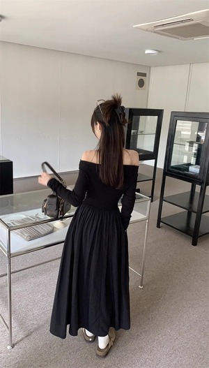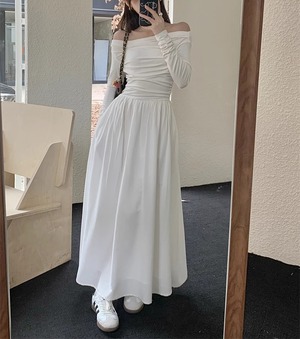 フレアで華やかなマキシ丈、長袖のオフショルダーデザインが特徴で大人可愛い印象を演出します。
