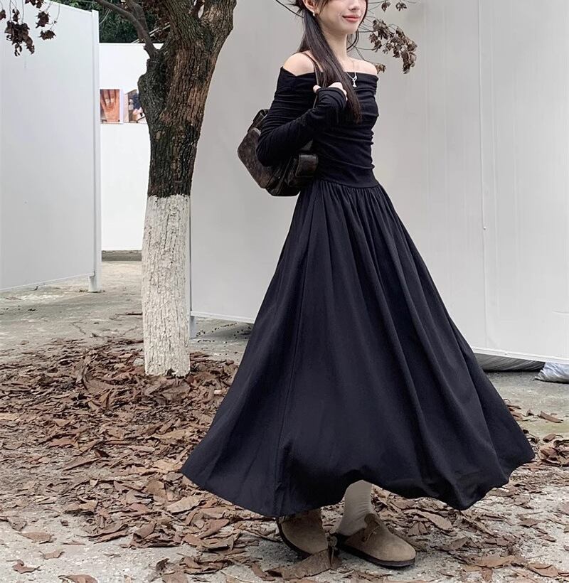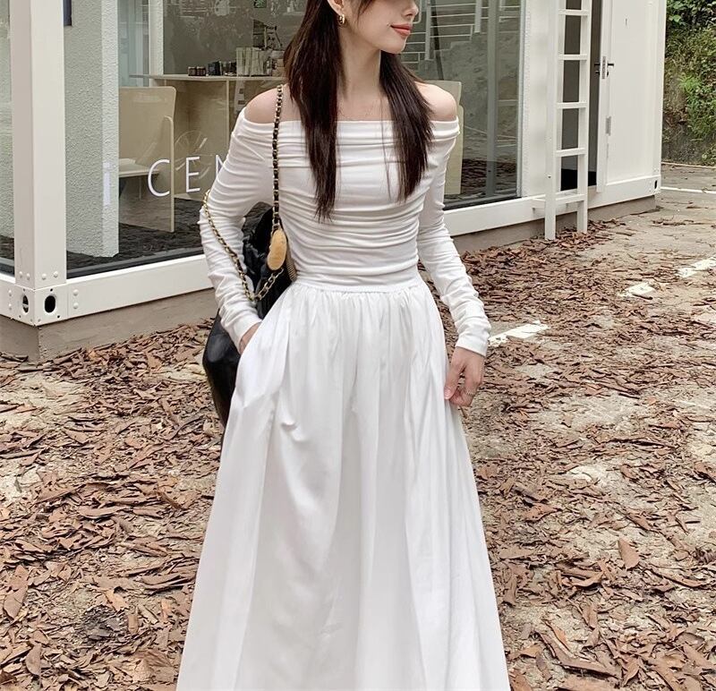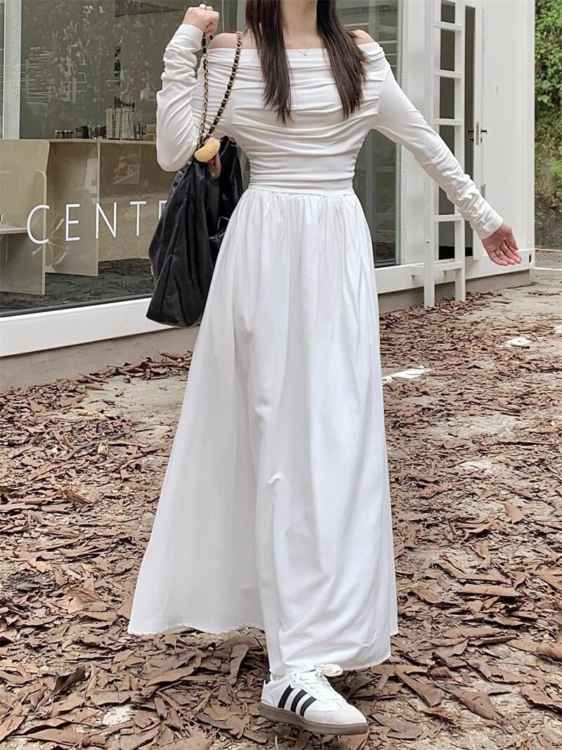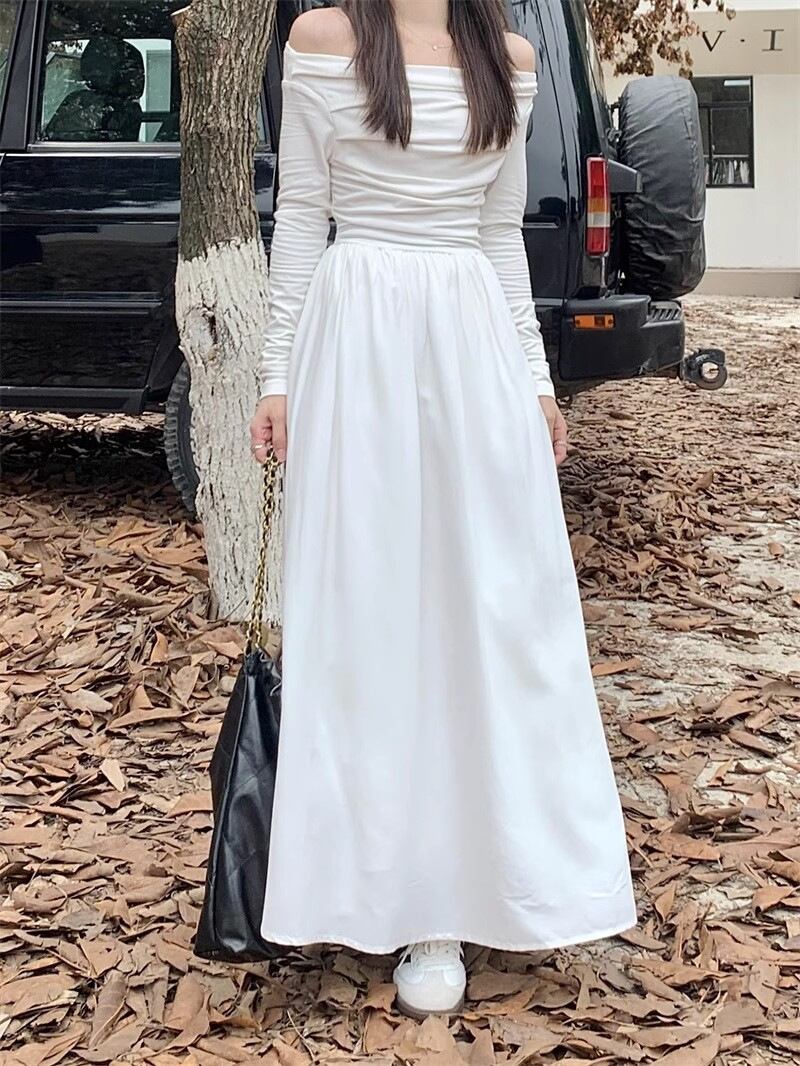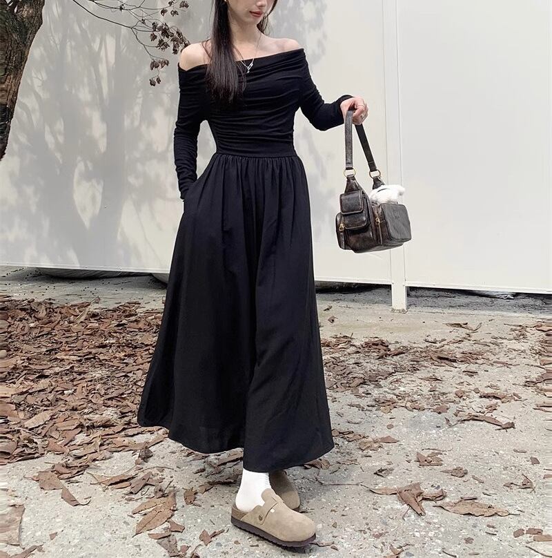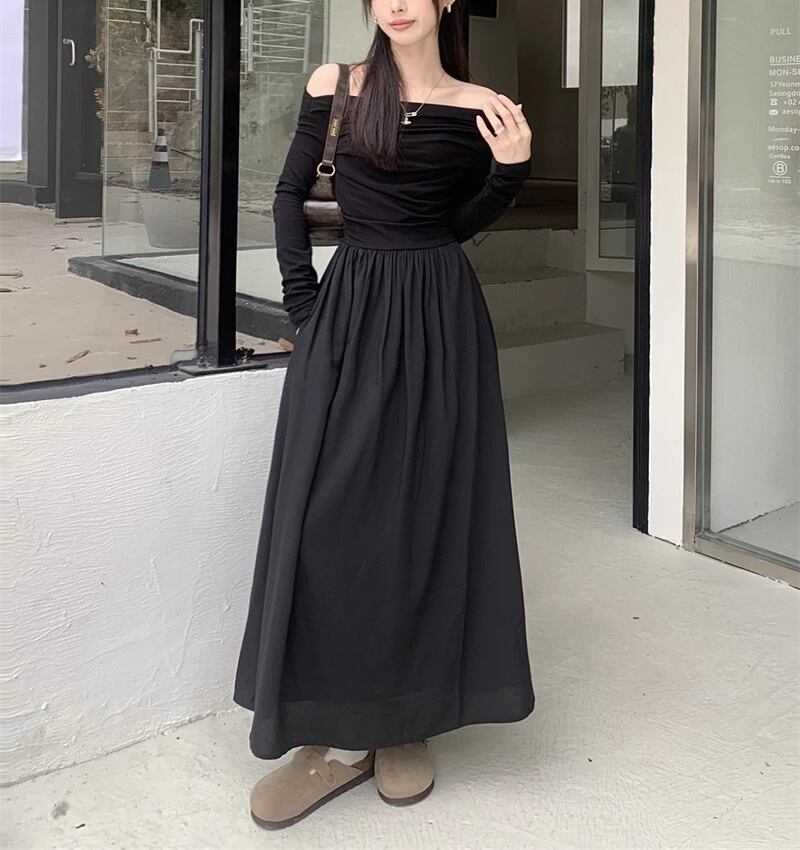 フレアで華やかなマキシ丈、長袖のオフショルダーデザインが特徴で大人可愛い印象を演出します。