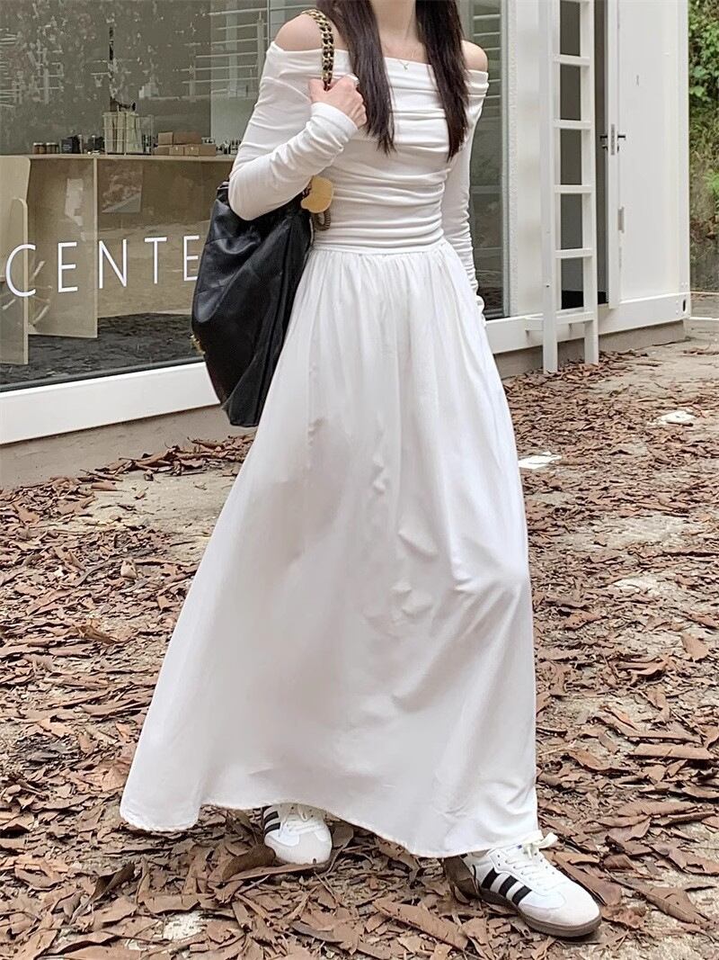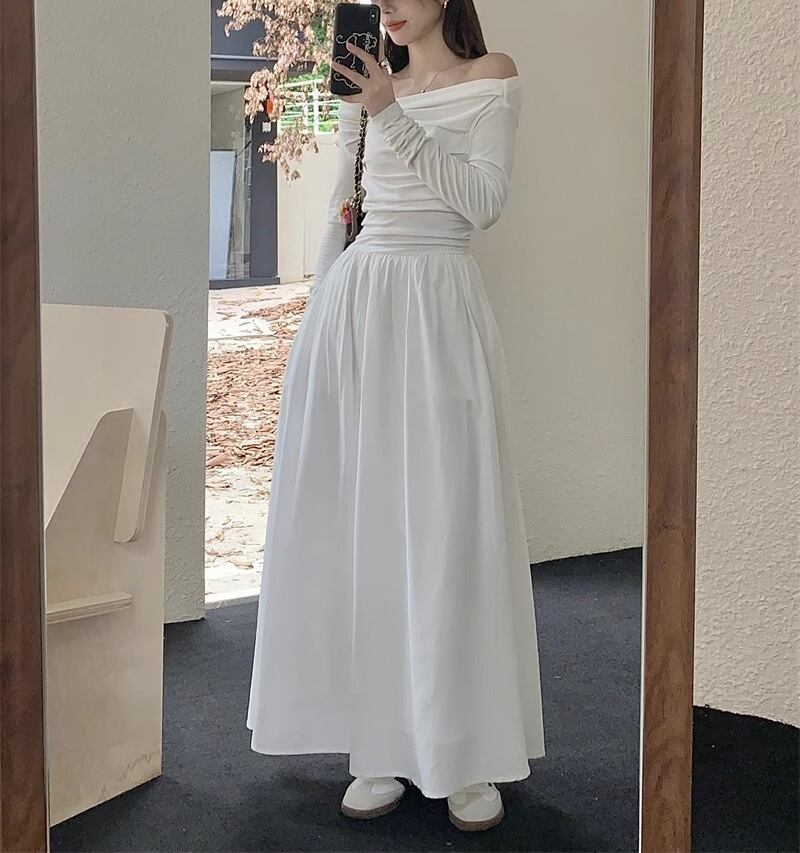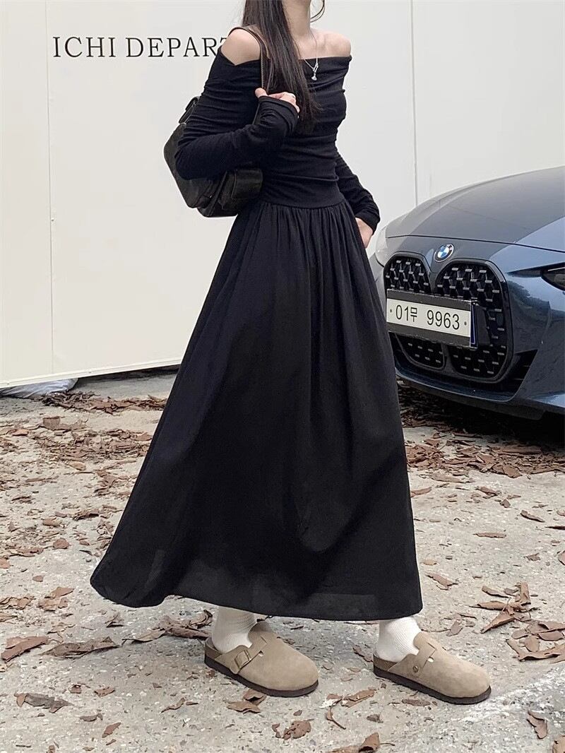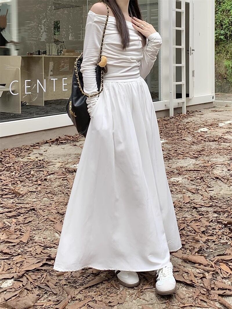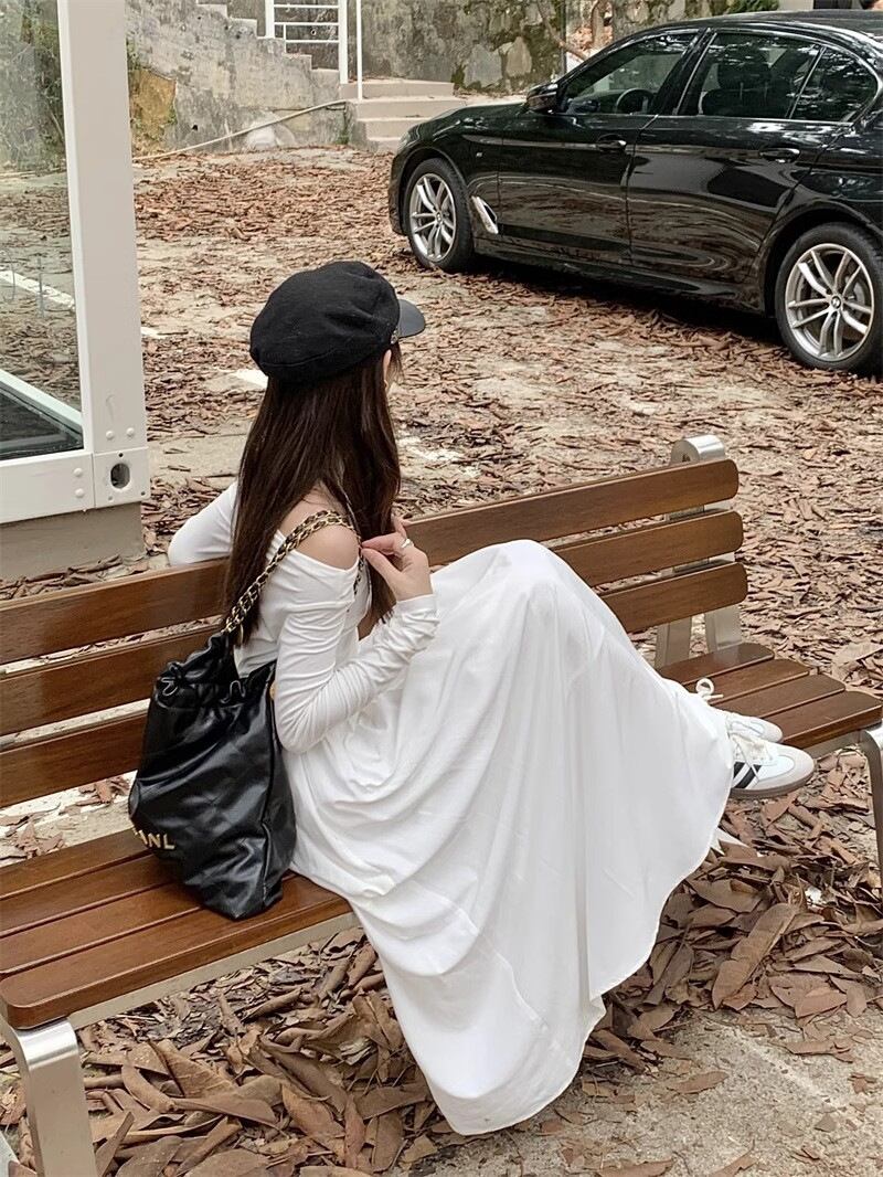 フレアで華やかなマキシ丈、長袖のオフショルダーデザインが特徴で大人可愛い印象を演出します。