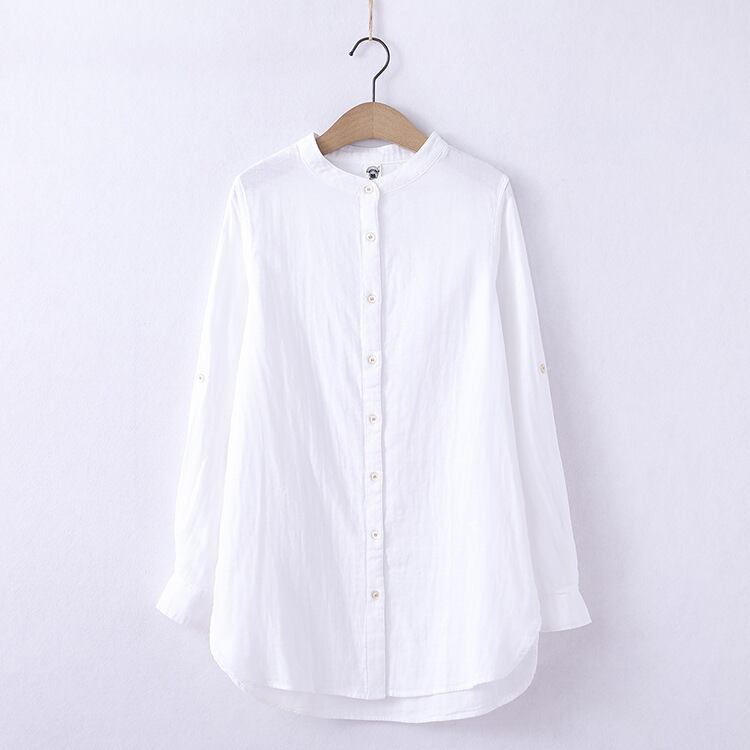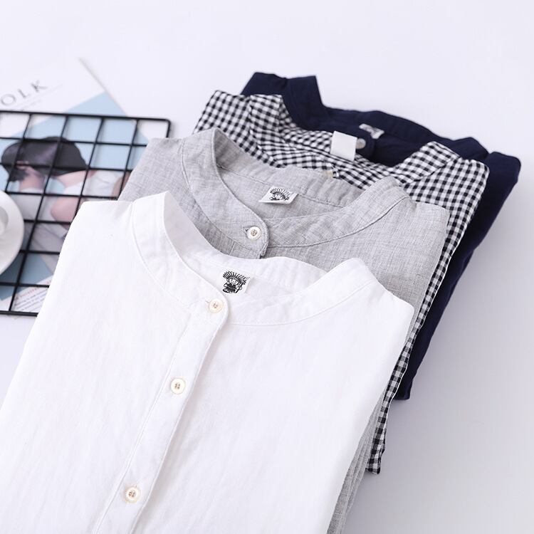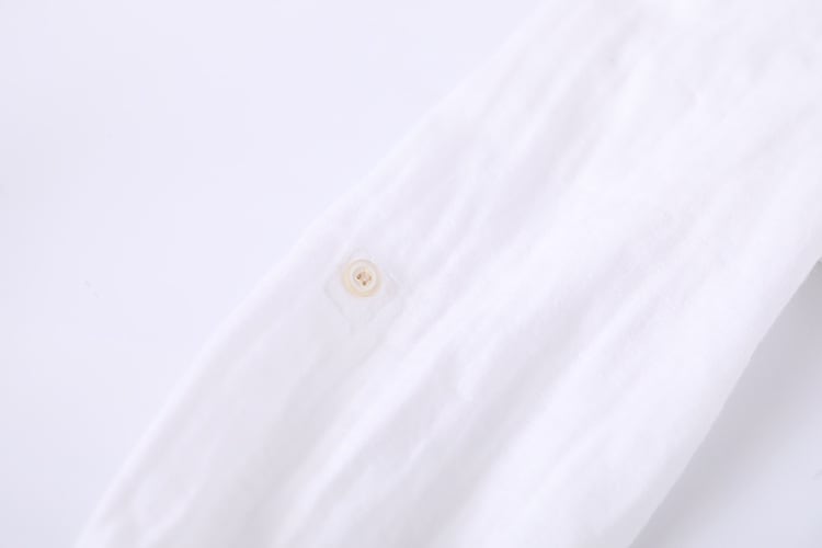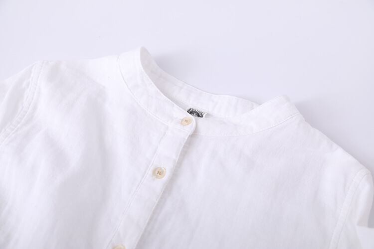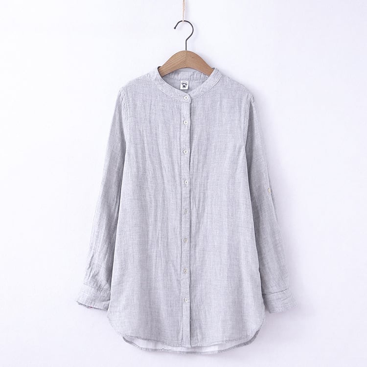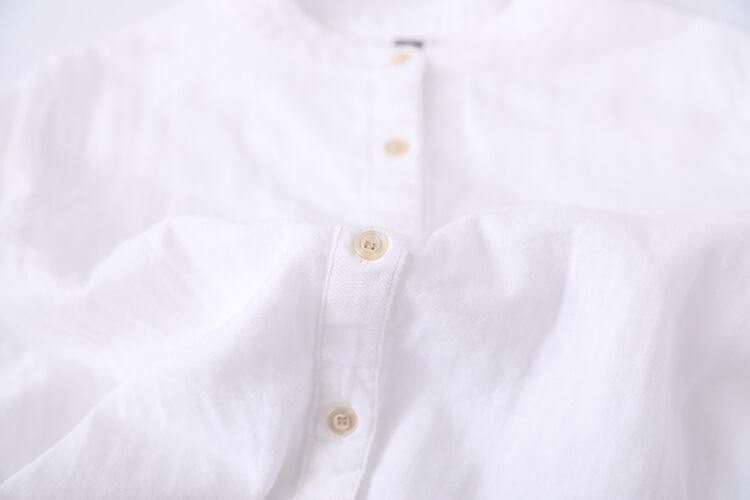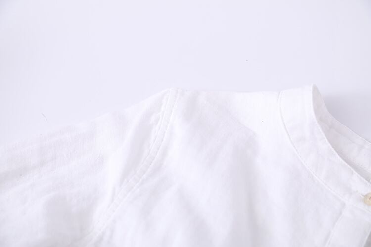 シンプルなラウンドネックで襟なしのスタイルは、リラックスした雰囲気を演出。