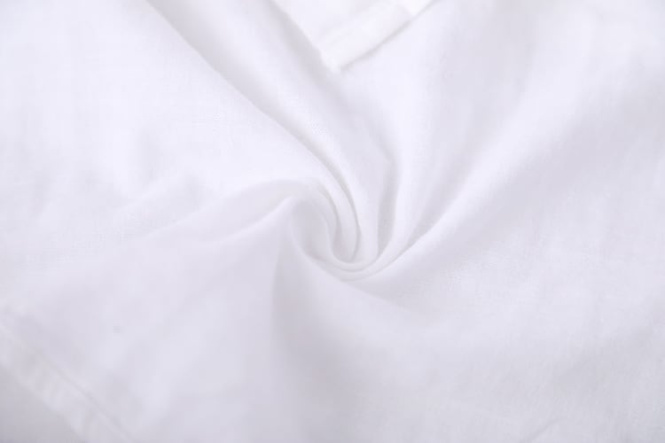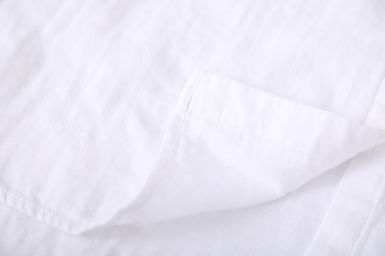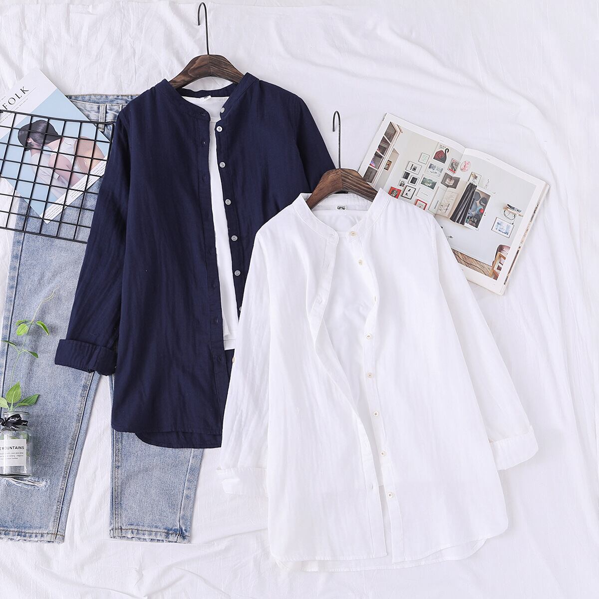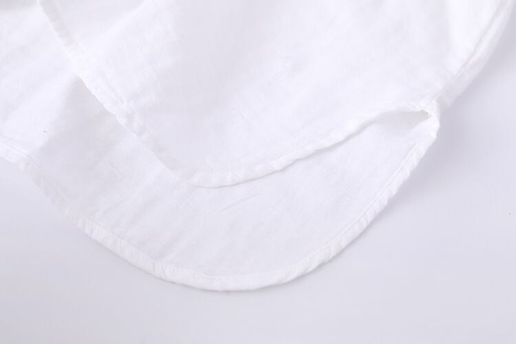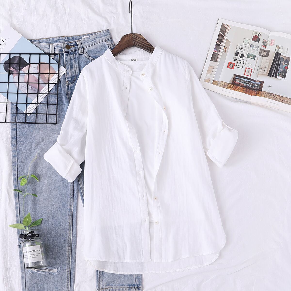 シンプルなラウンドネックで襟なしのスタイルは、リラックスした雰囲気を演出。