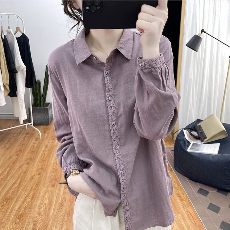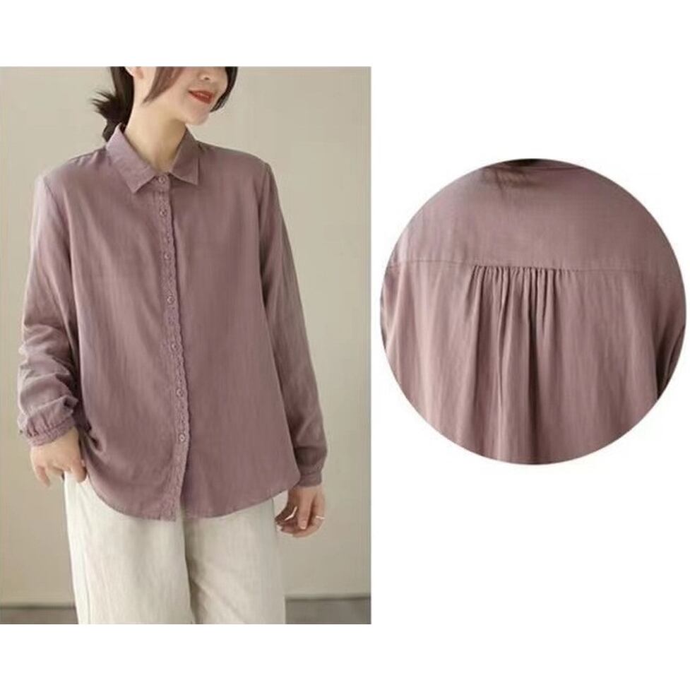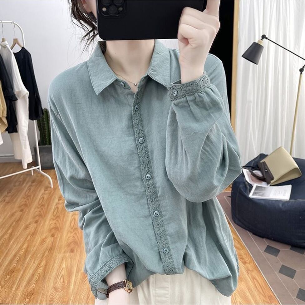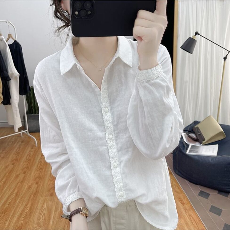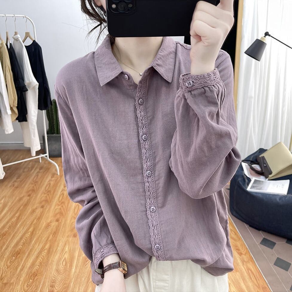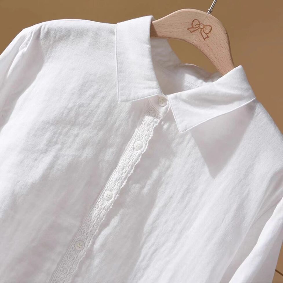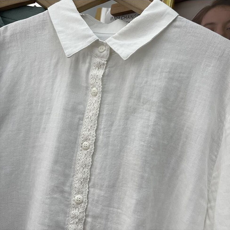 ボタンのラインと袖口に繊細なレースを施した襟付き長袖シャツ。