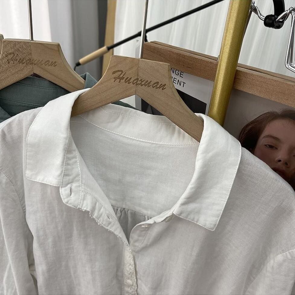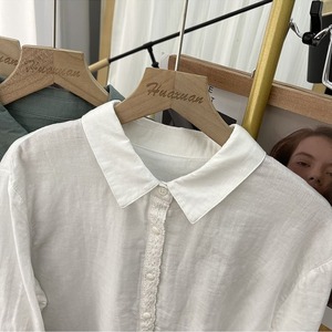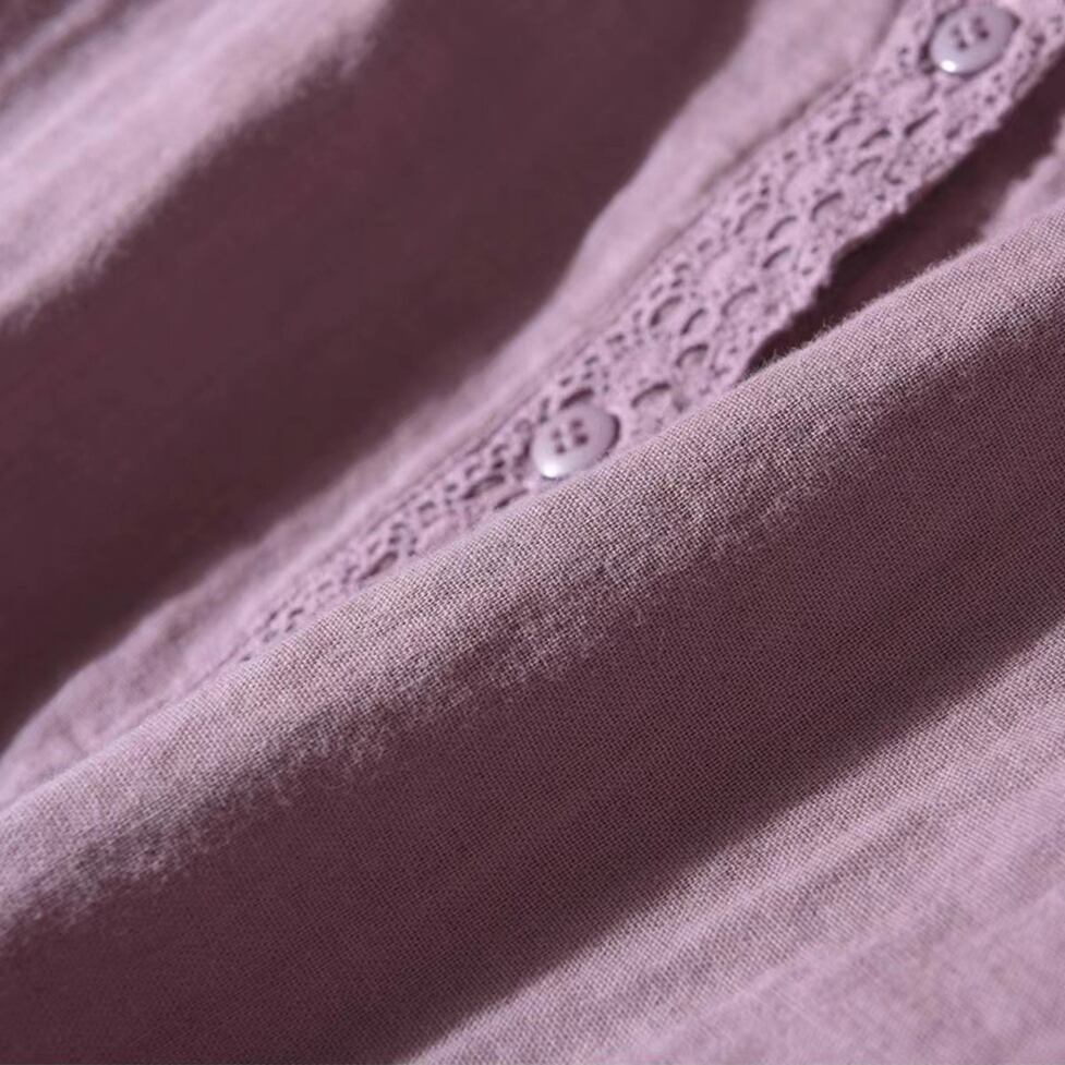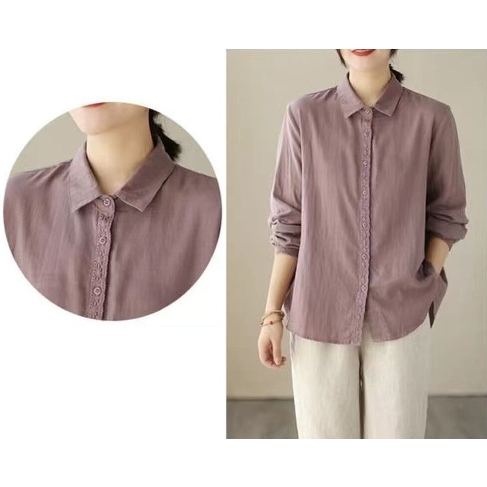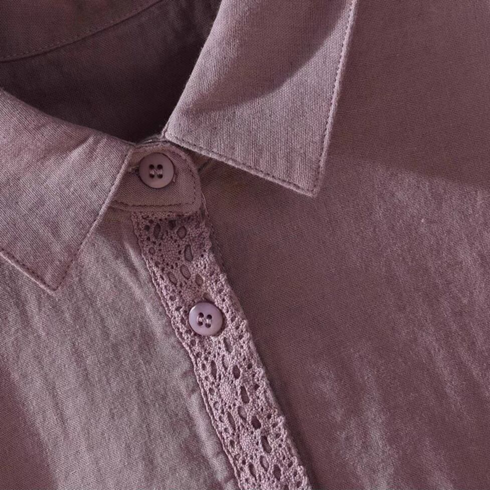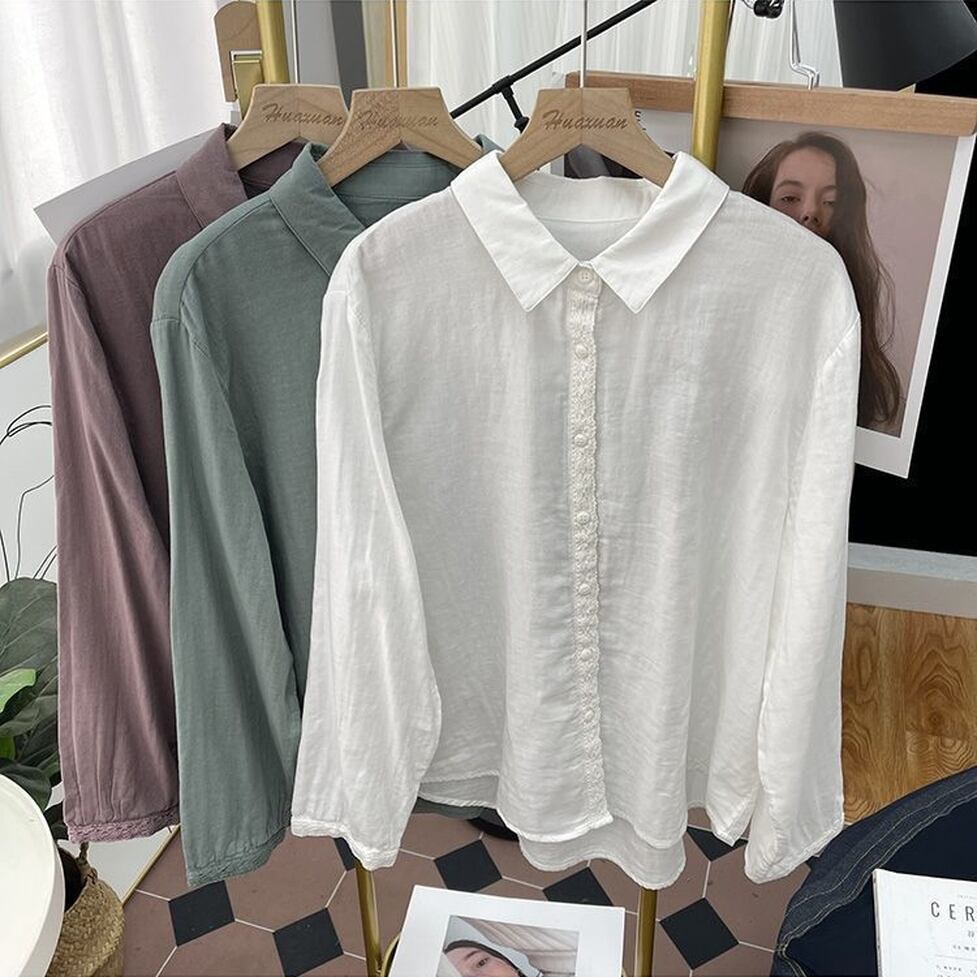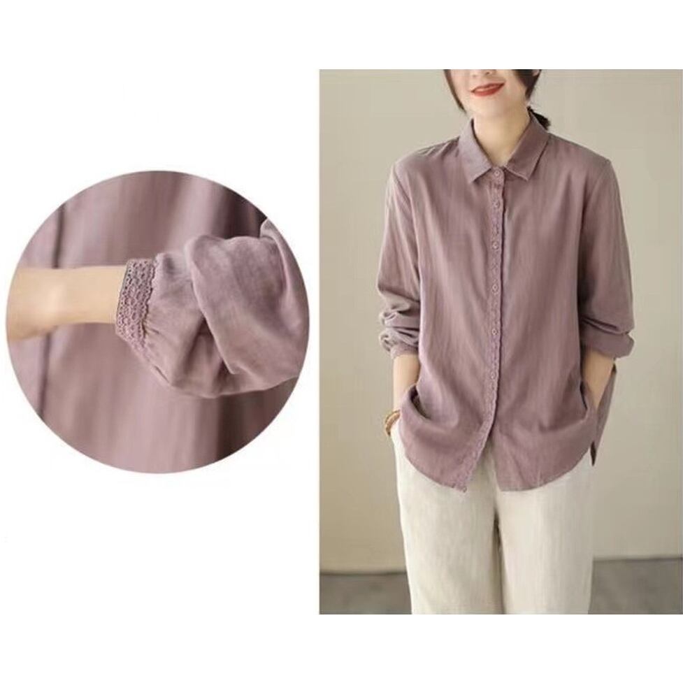 ボタンのラインと袖口に繊細なレースを施した襟付き長袖シャツ。