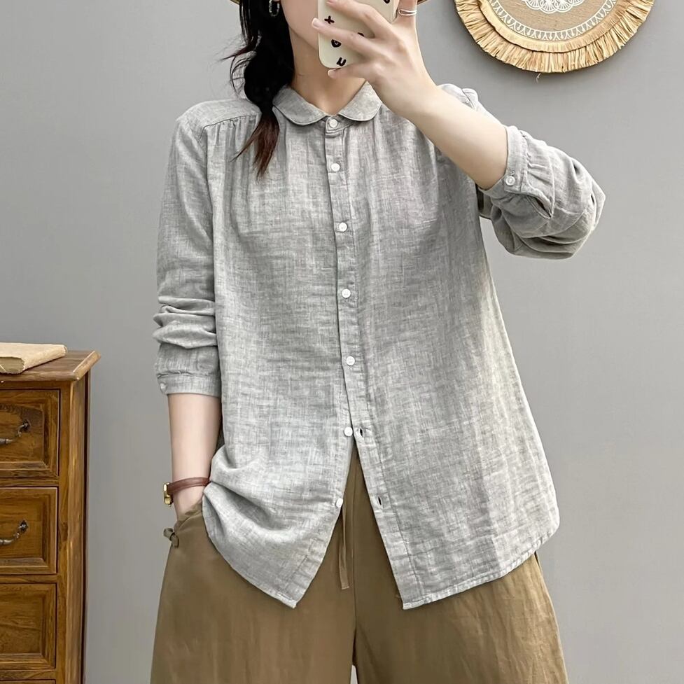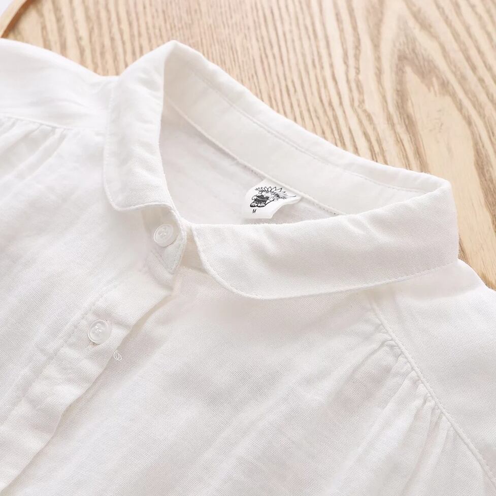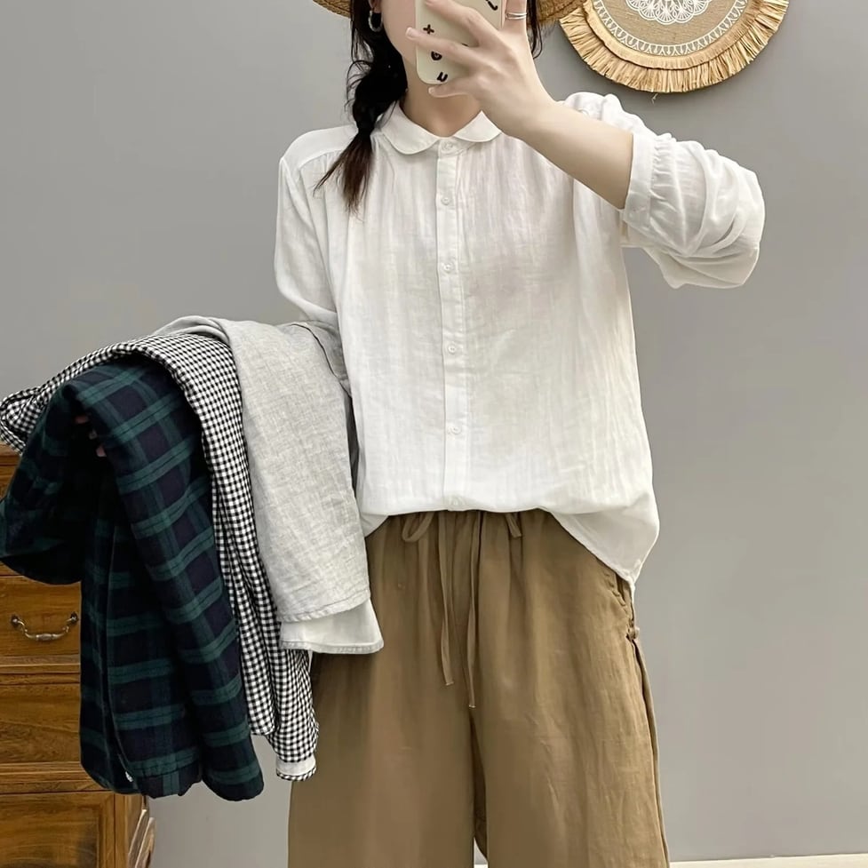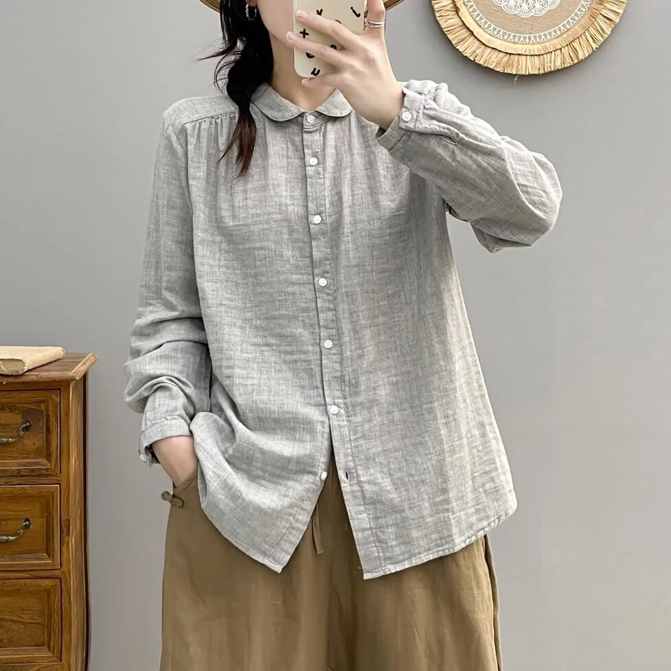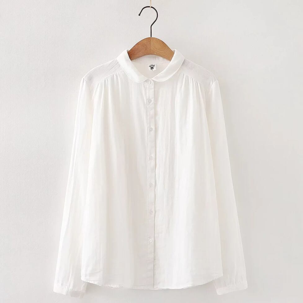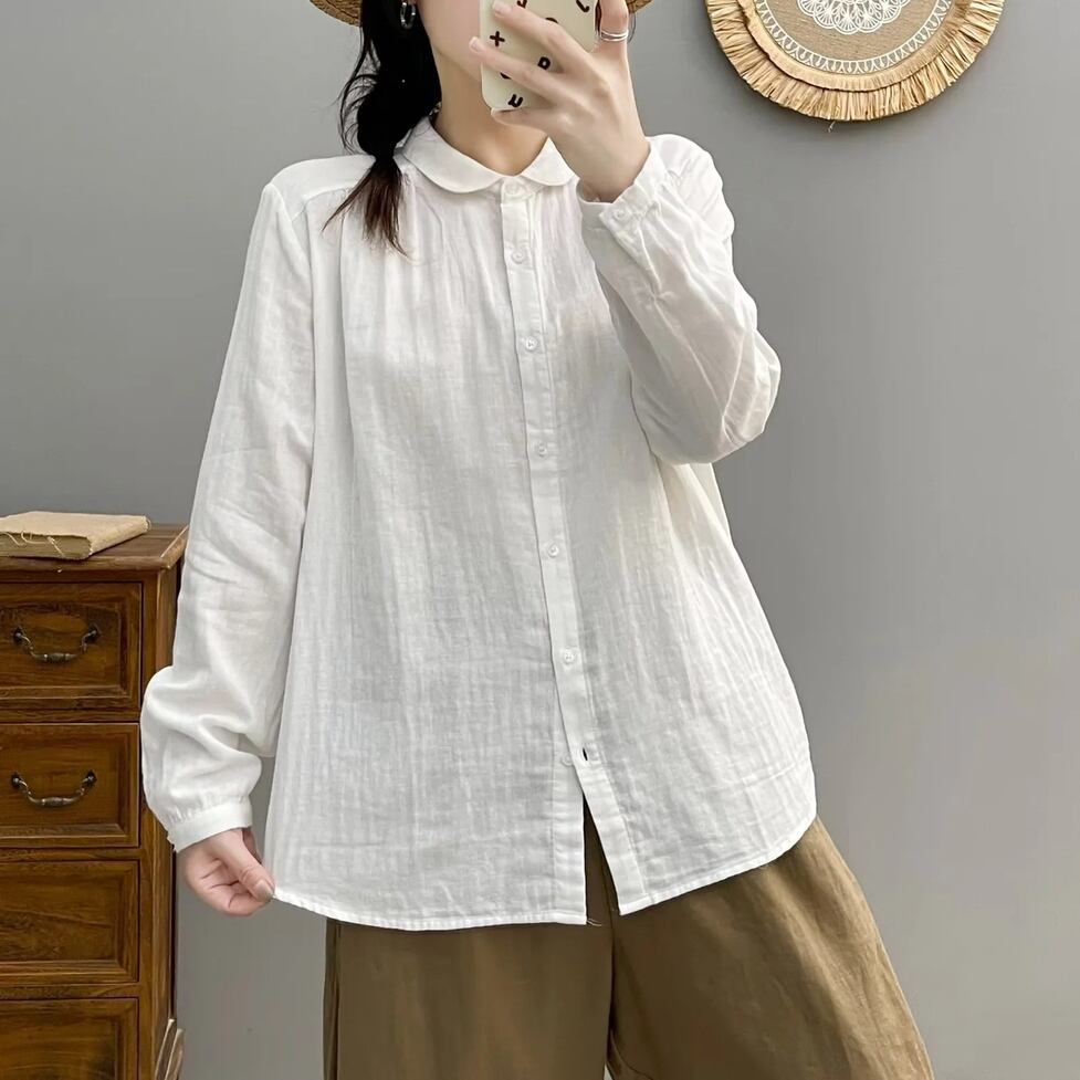 ほんのり透けた軽やかな素材感、小さめの丸くカーブした襟、ゆったりリラックスした不運域でナチュラルに着られるシャツ。