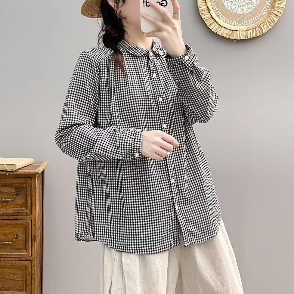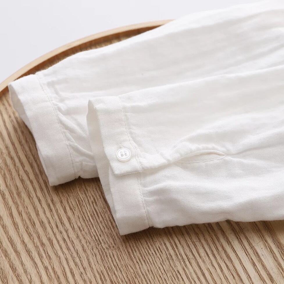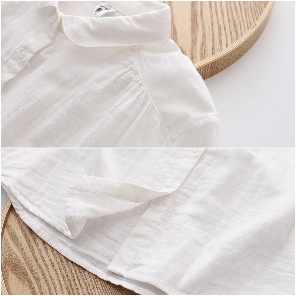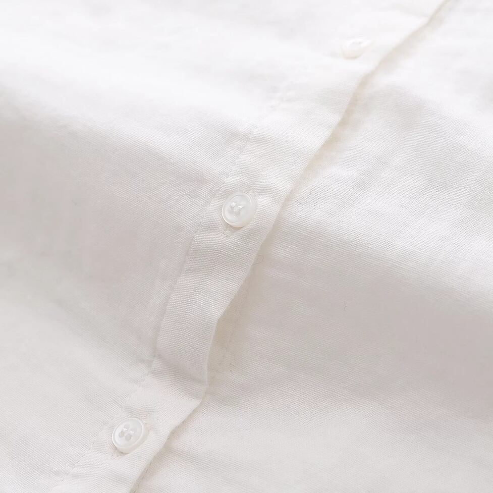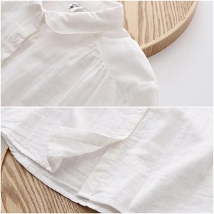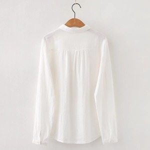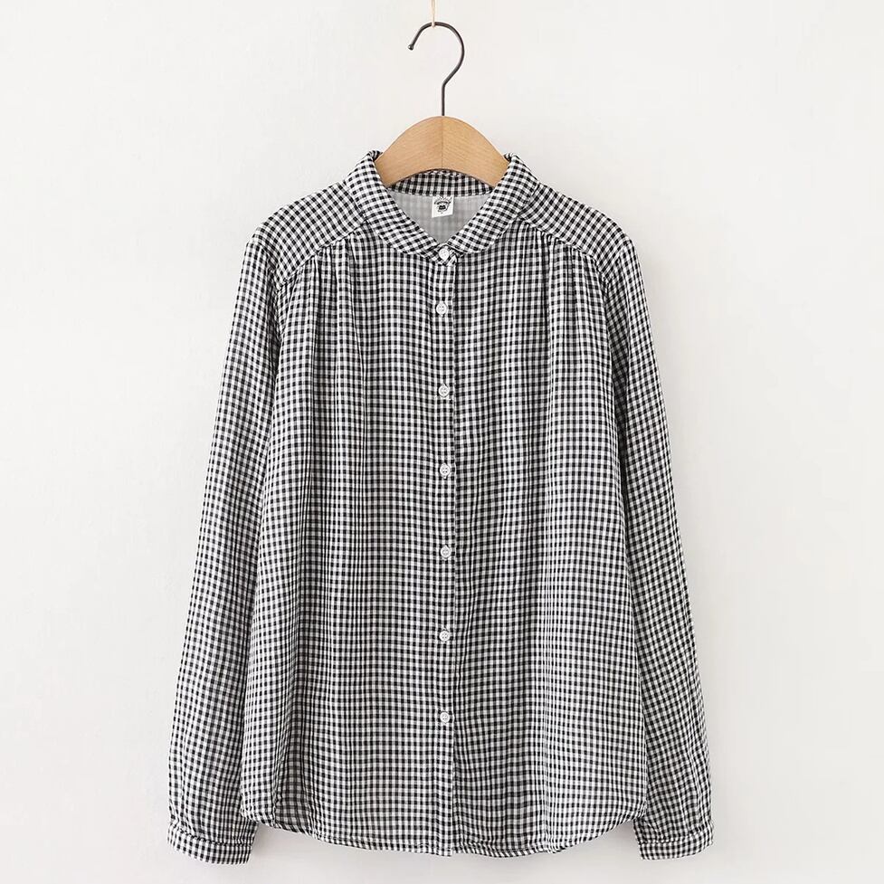 ほんのり透けた軽やかな素材感、小さめの丸くカーブした襟、ゆったりリラックスした不運域でナチュラルに着られるシャツ。