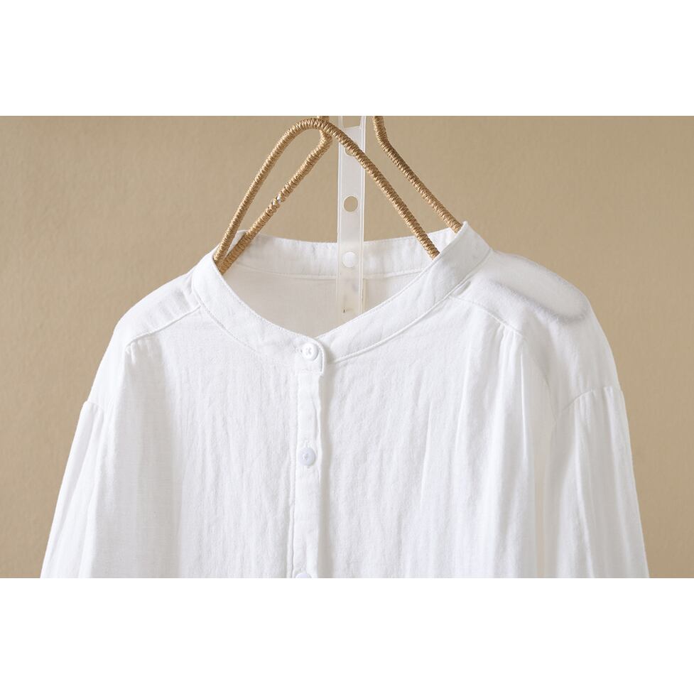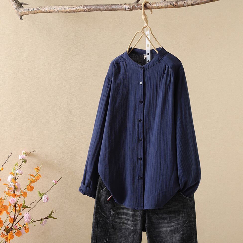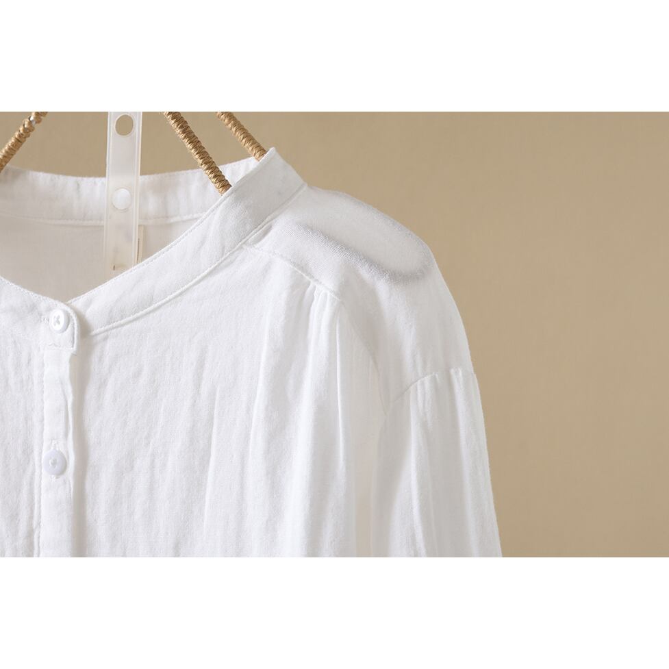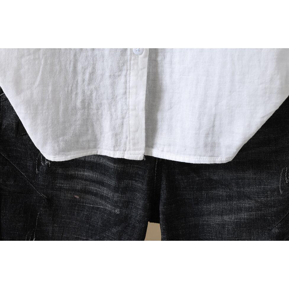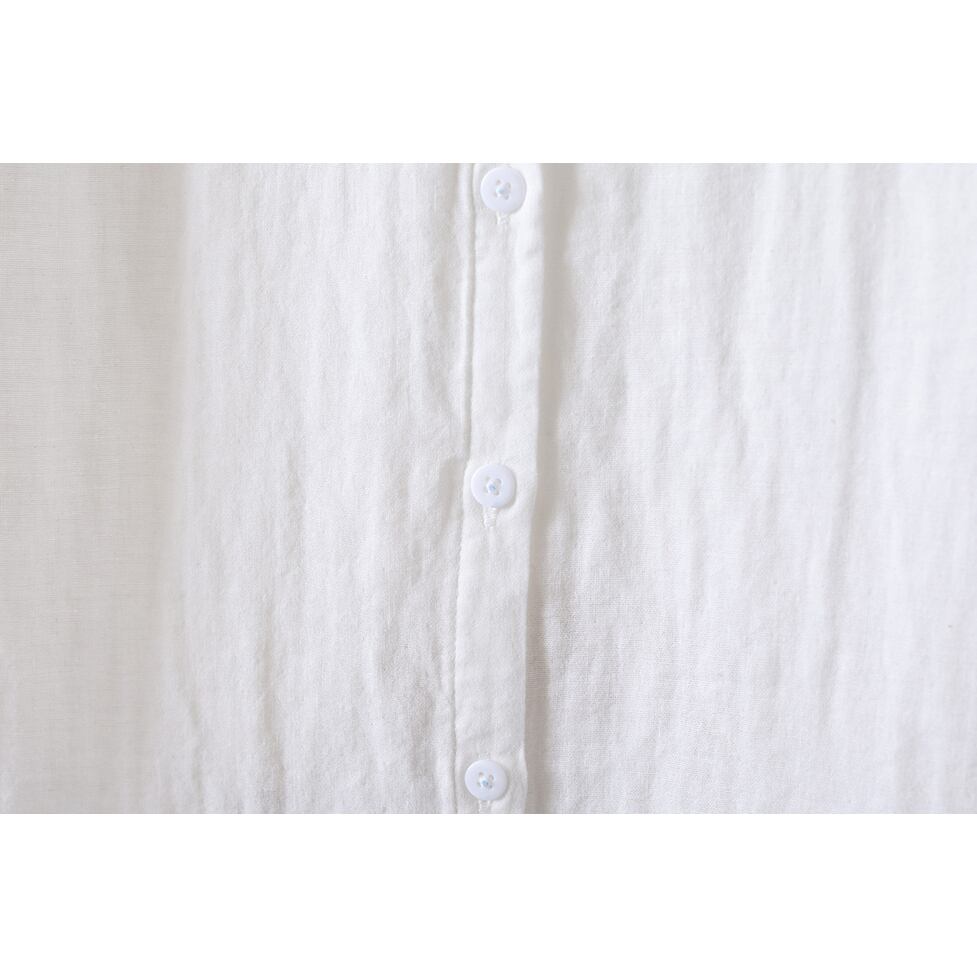ナチュラルでレトロな雰囲気を引き出すシワ加工が特徴の襟無し長袖ワイドシャツ。