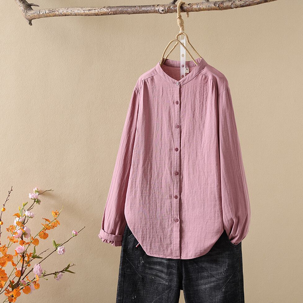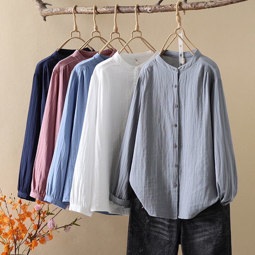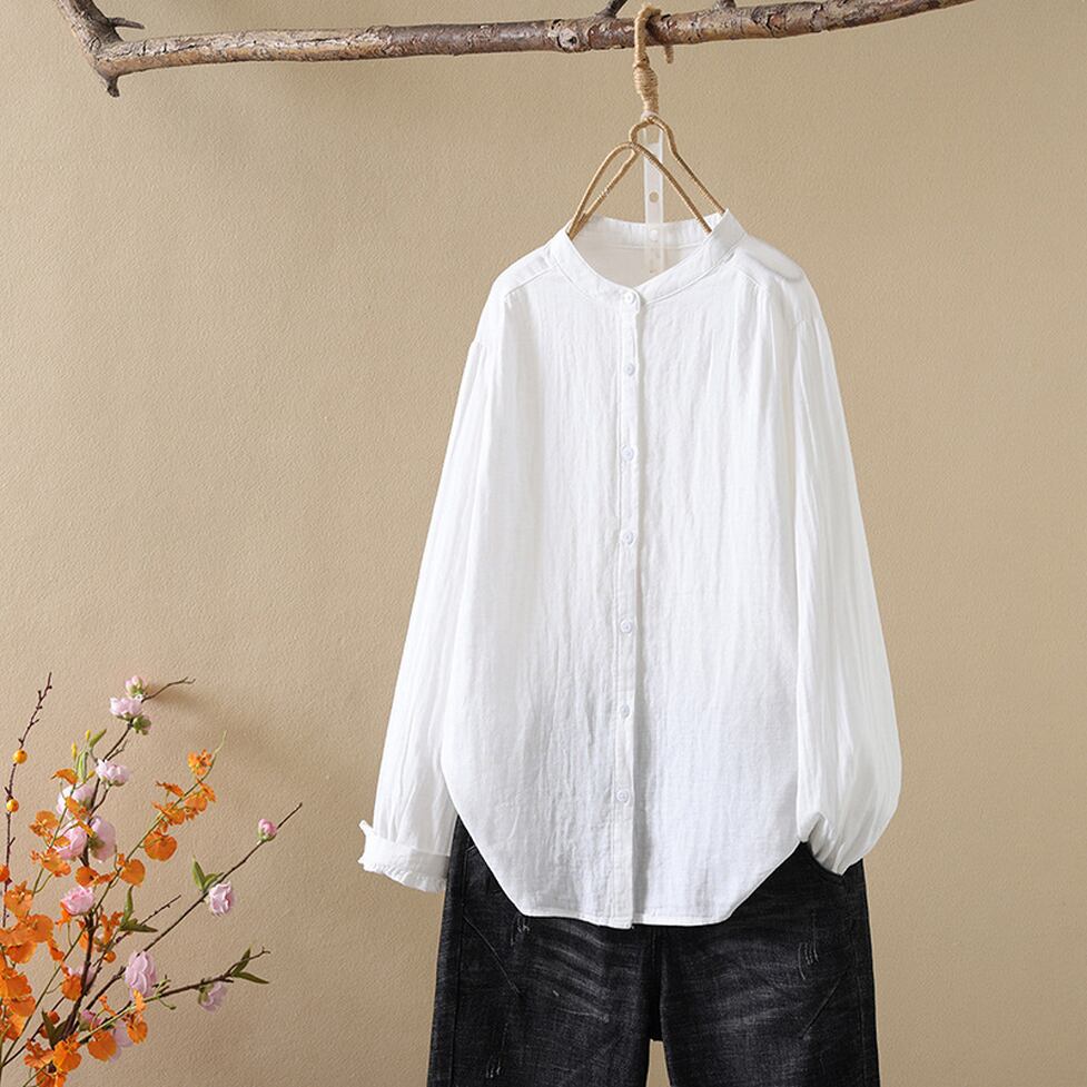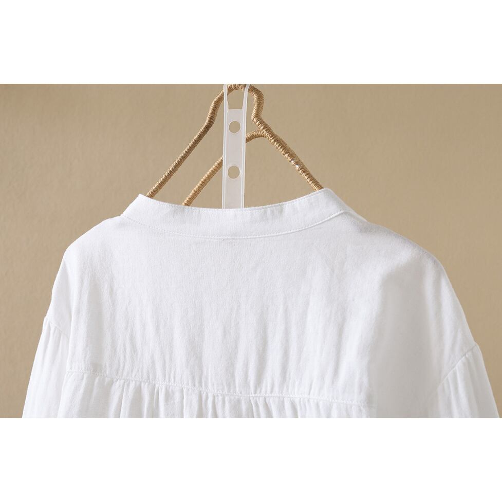 ナチュラルでレトロな雰囲気を引き出すシワ加工が特徴の襟無し長袖ワイドシャツ。