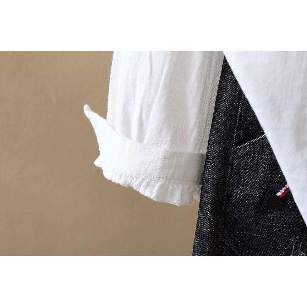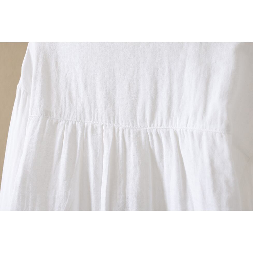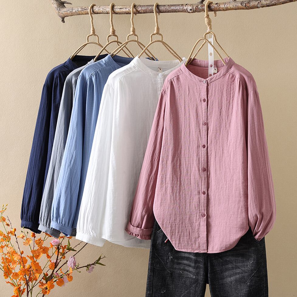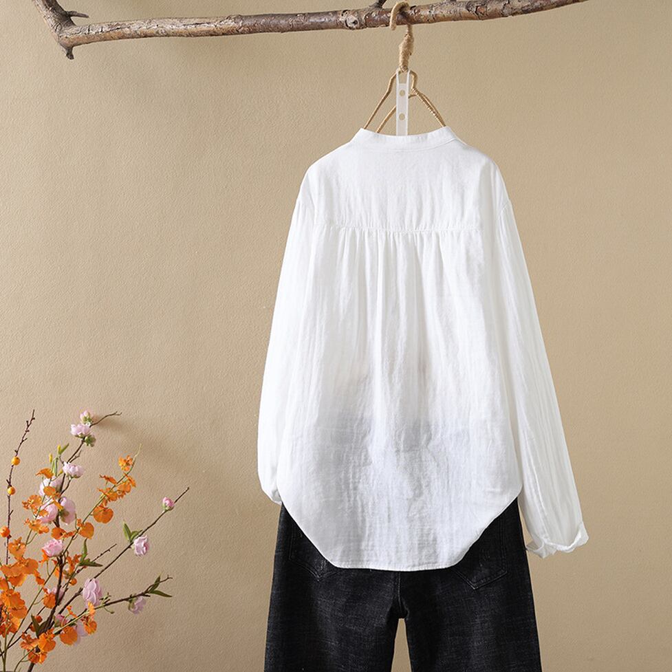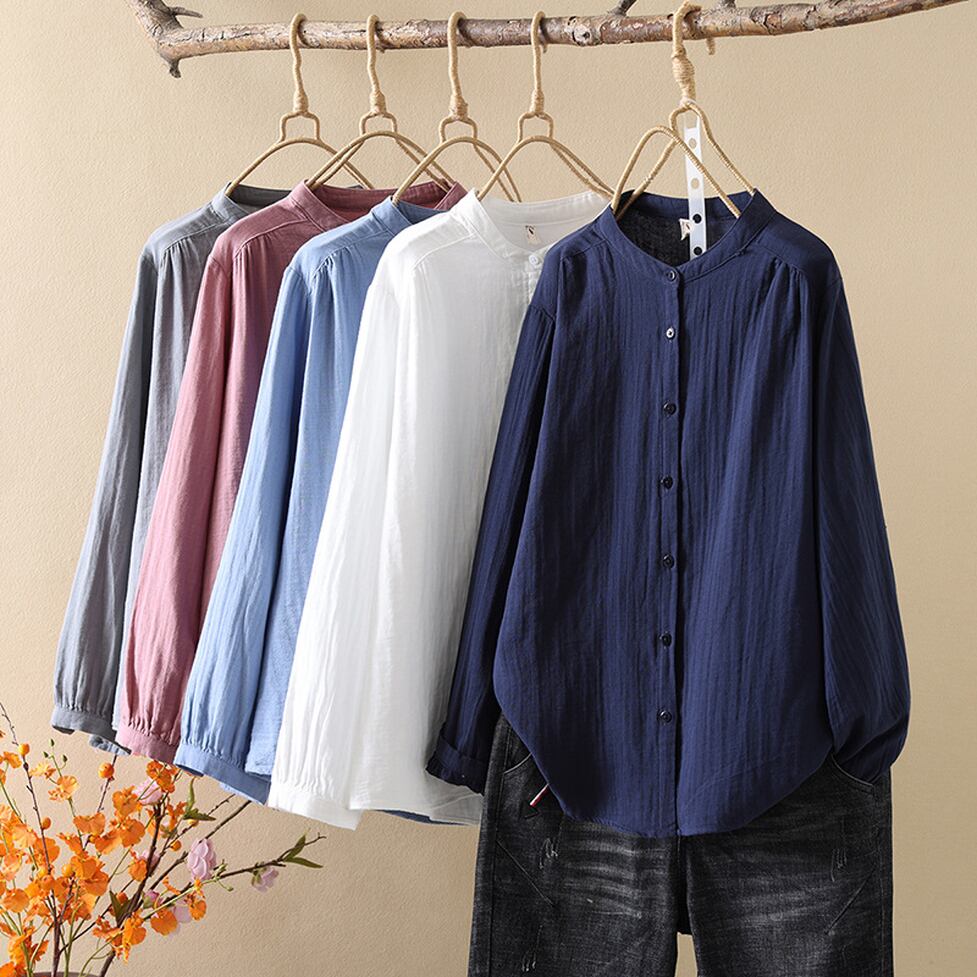 ナチュラルでレトロな雰囲気を引き出すシワ加工が特徴の襟無し長袖ワイドシャツ。