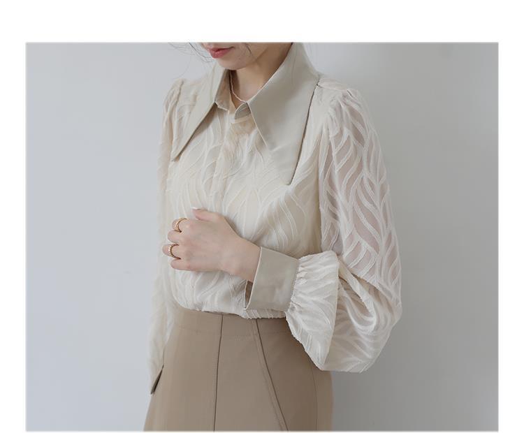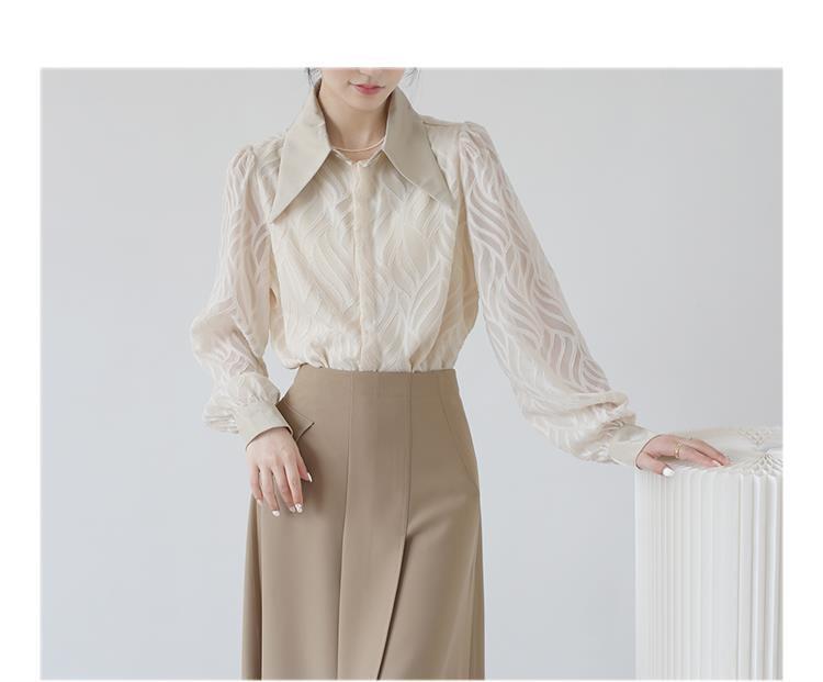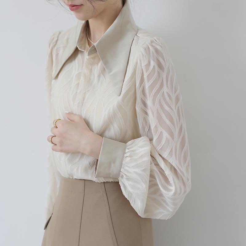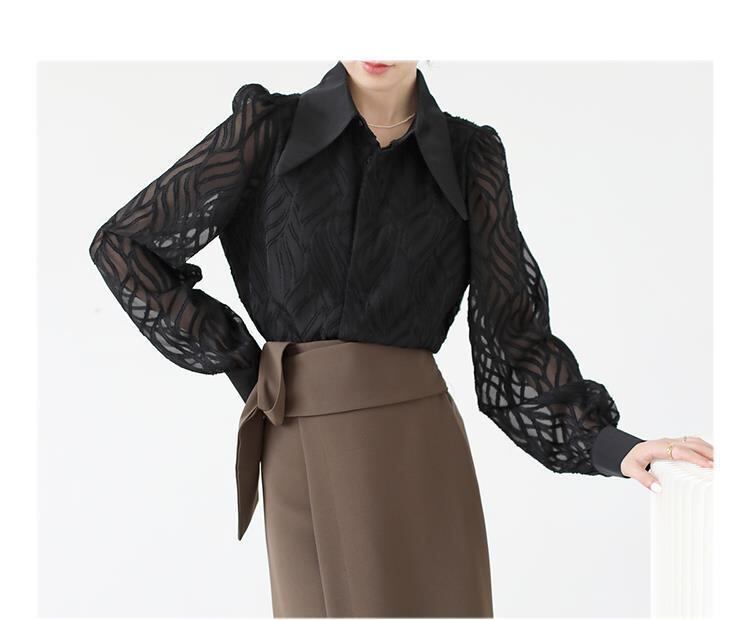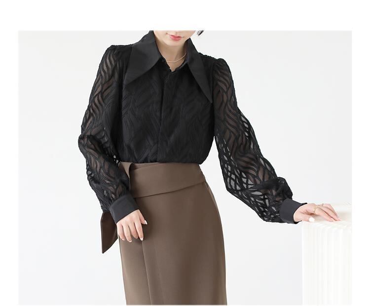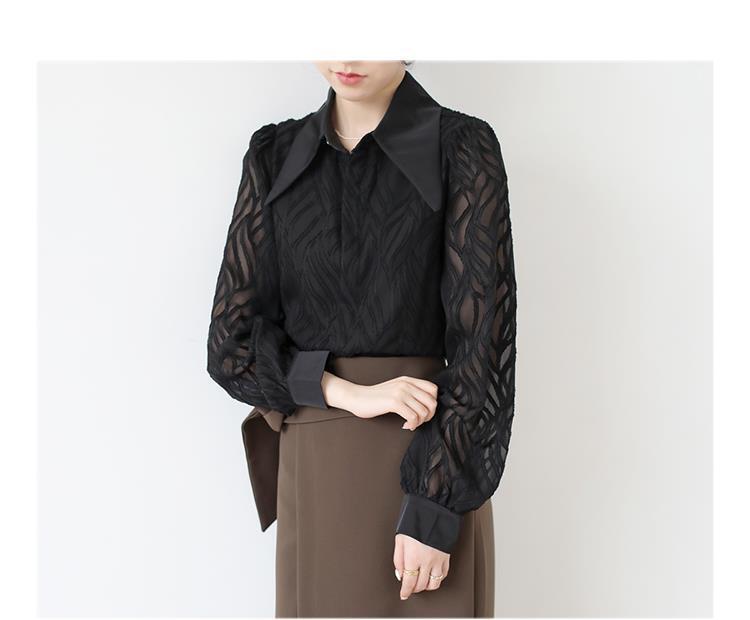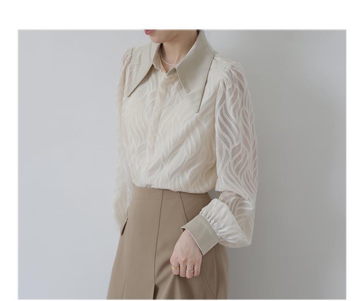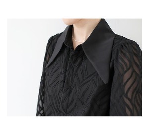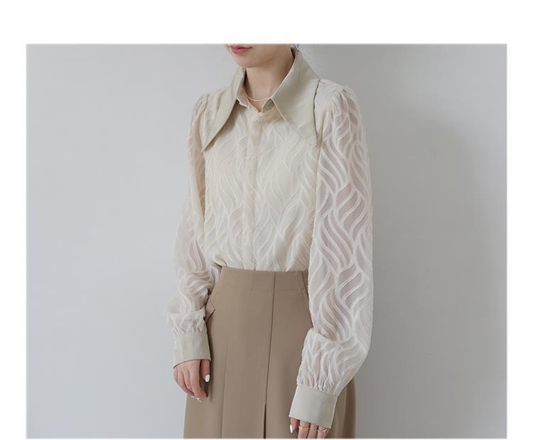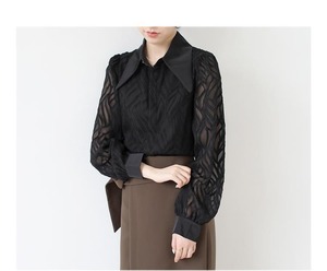 透け感のあるシアー素材に、立体的な柄が浮かぶ印象的なブラウス。