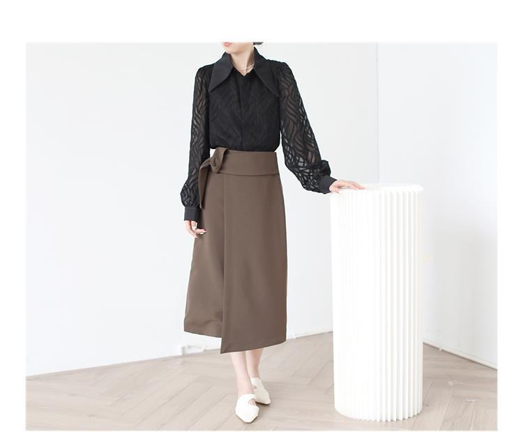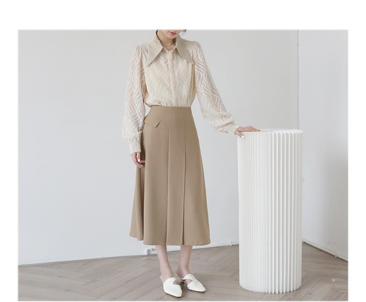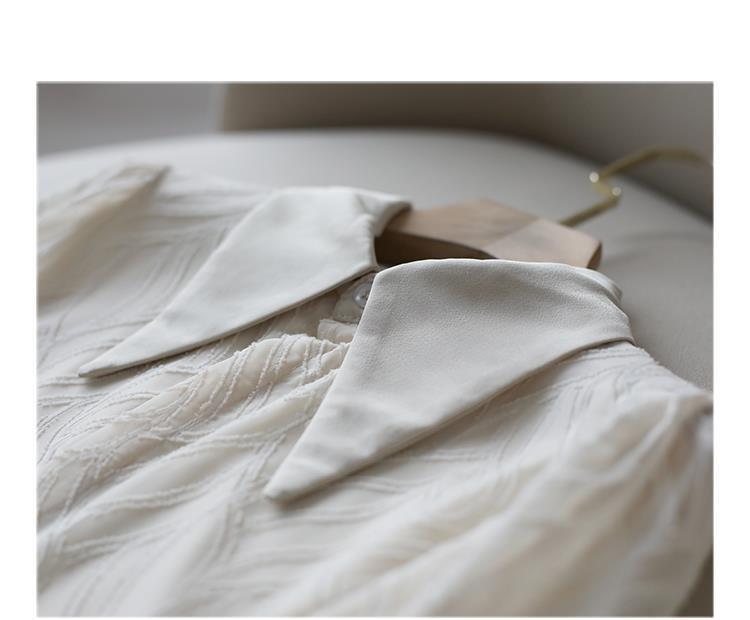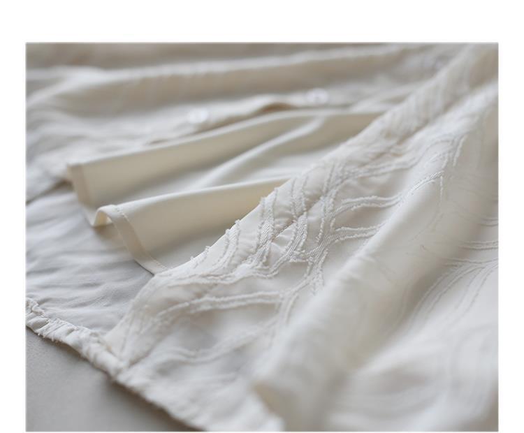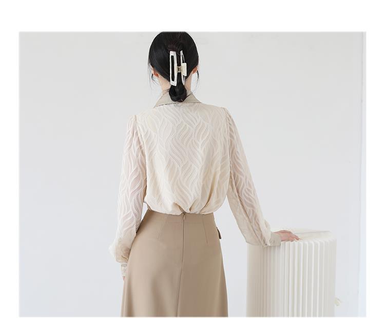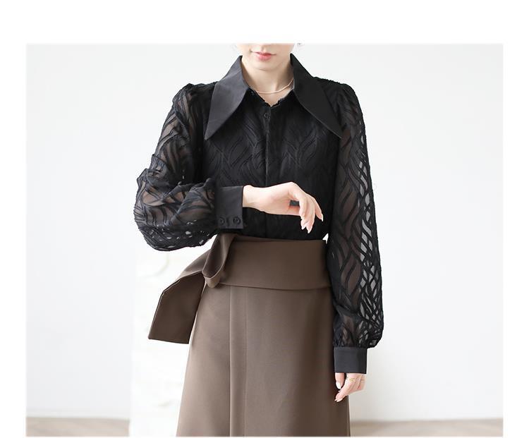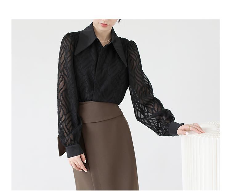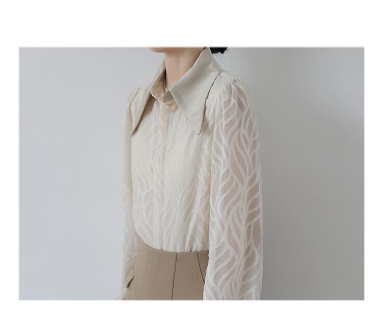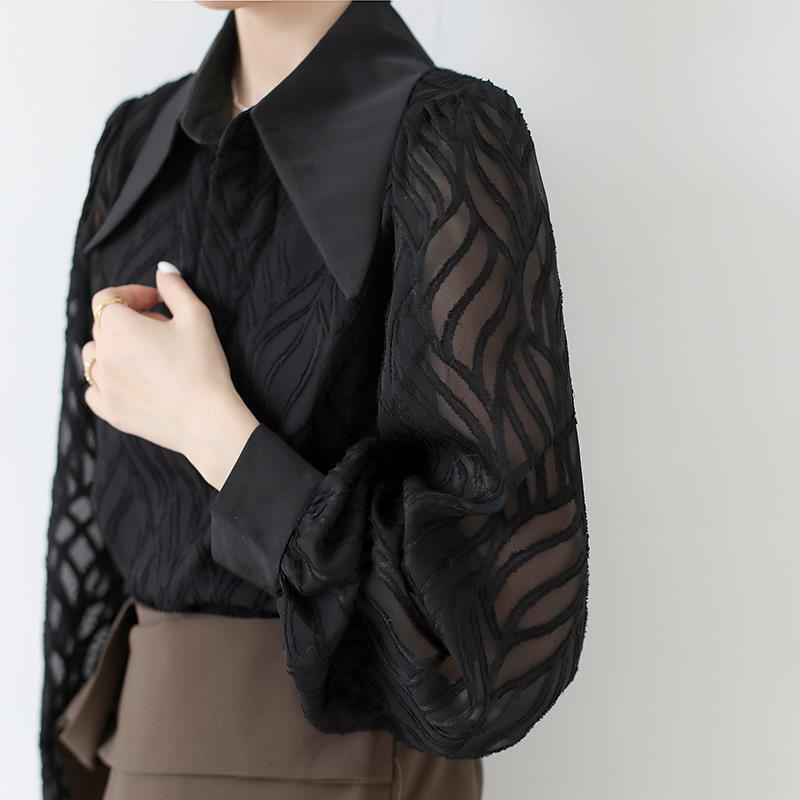 透け感のあるシアー素材に、立体的な柄が浮かぶ印象的なブラウス。