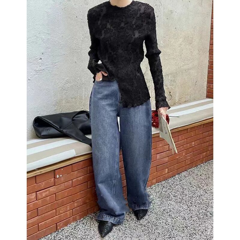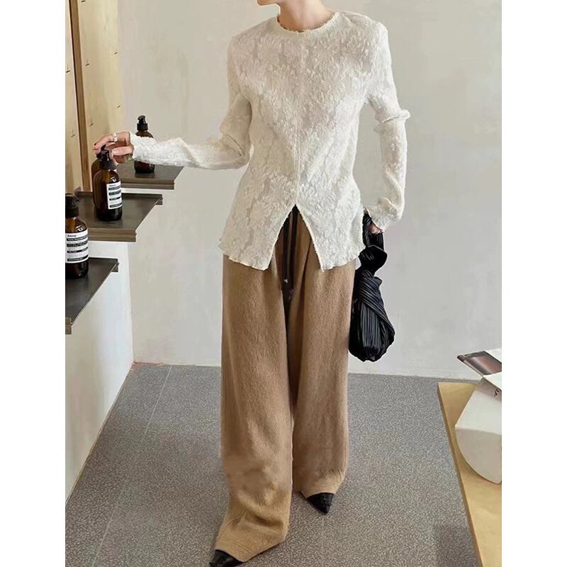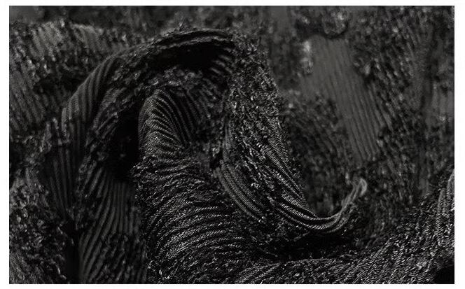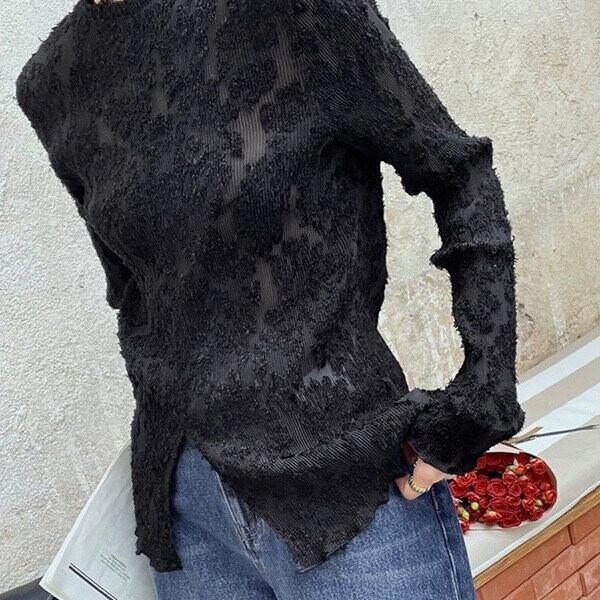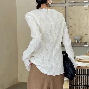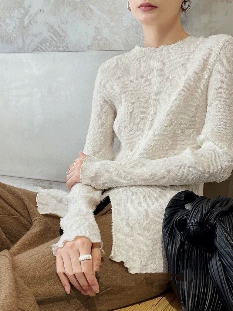 萌袖と立体的な花柄が特徴で、ノーカラーなので上品な印象を与えつつ、スリムなシルエットはフェミニンでありながらこなれ感を演出します。