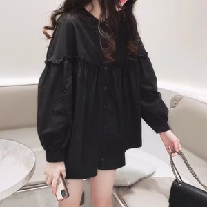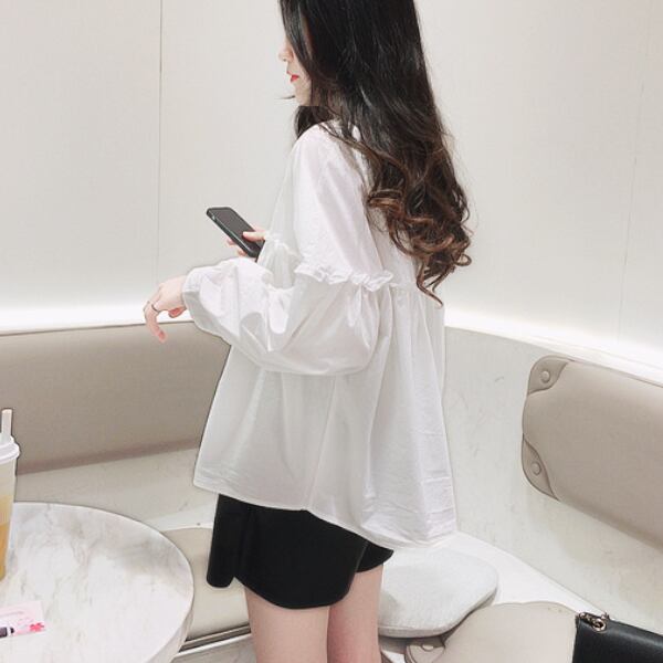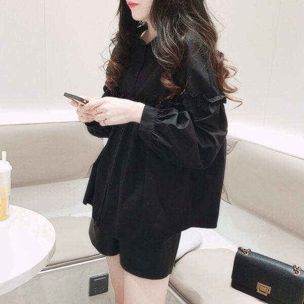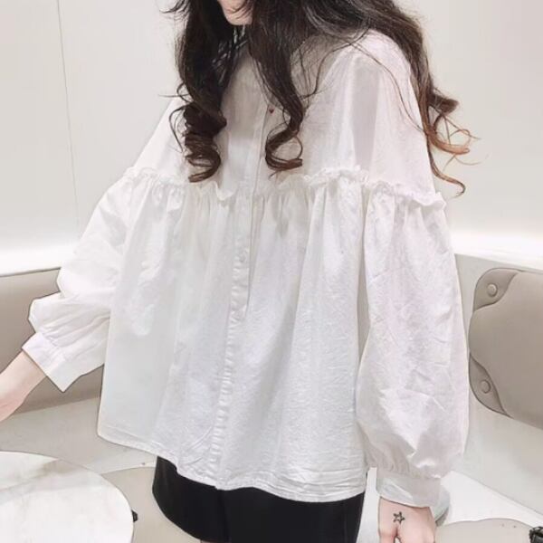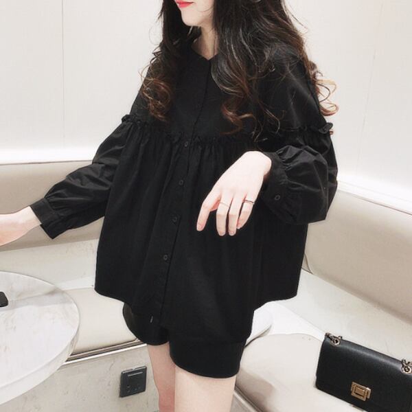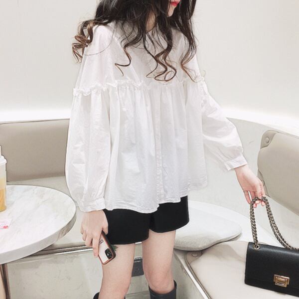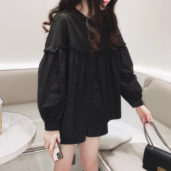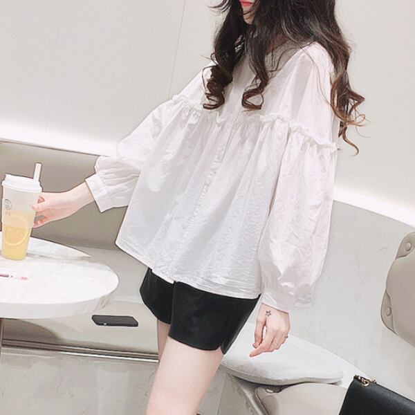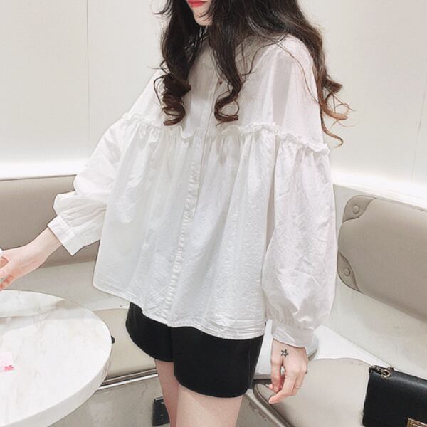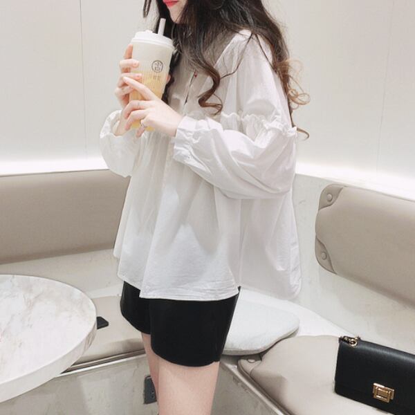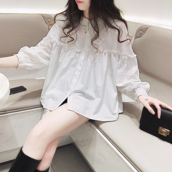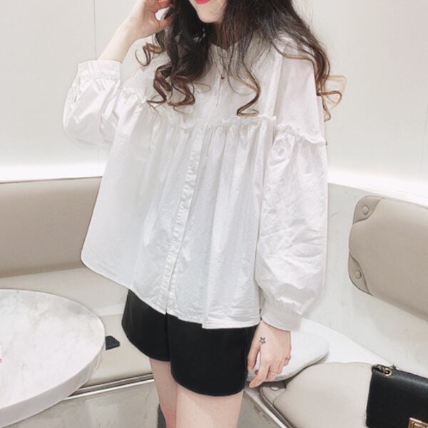 おしゃれでかわいい!ふんわりレディースシャツ。前開きデザインと萌袖が印象的。ノーカラー仕様で上品さを保ちながらも、リラックス感のある着心地です。 普段使いからお出かけ、旅行など、様々なシーンで活躍する一枚です!