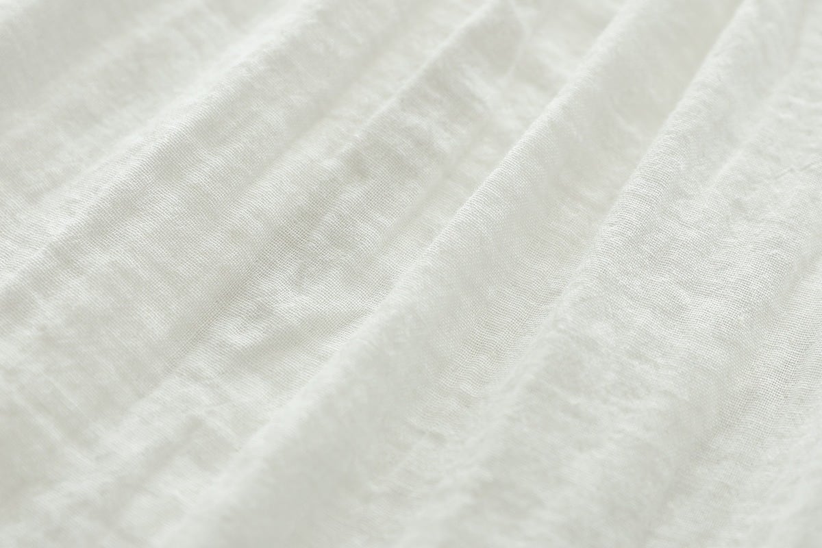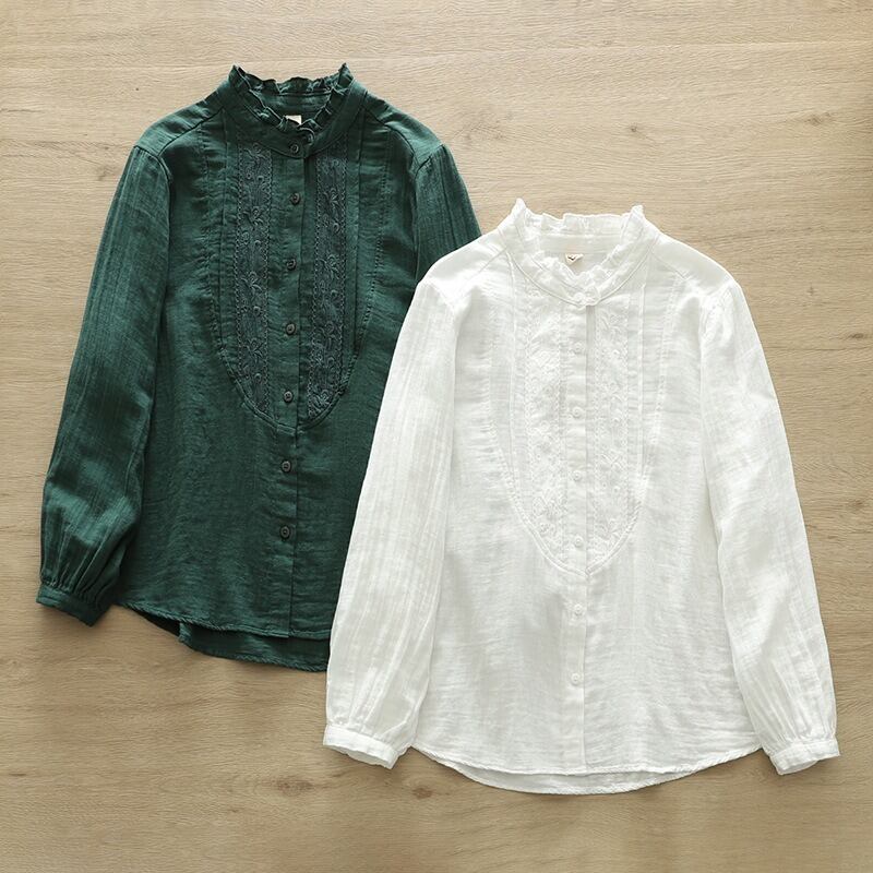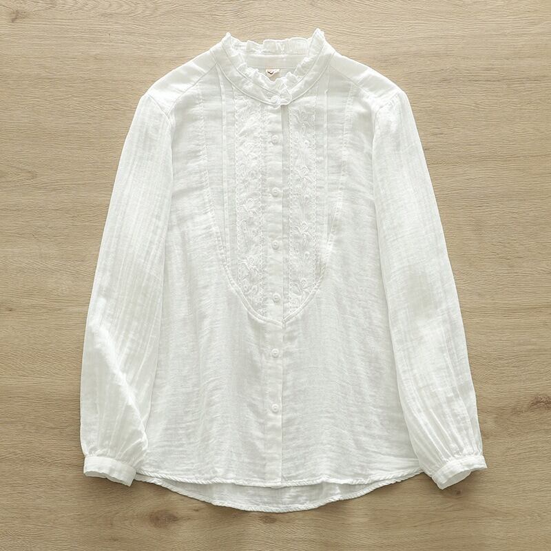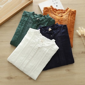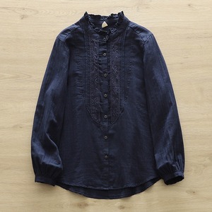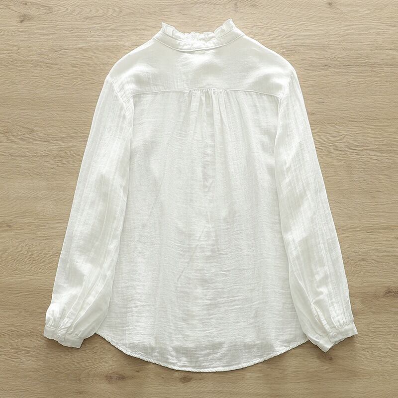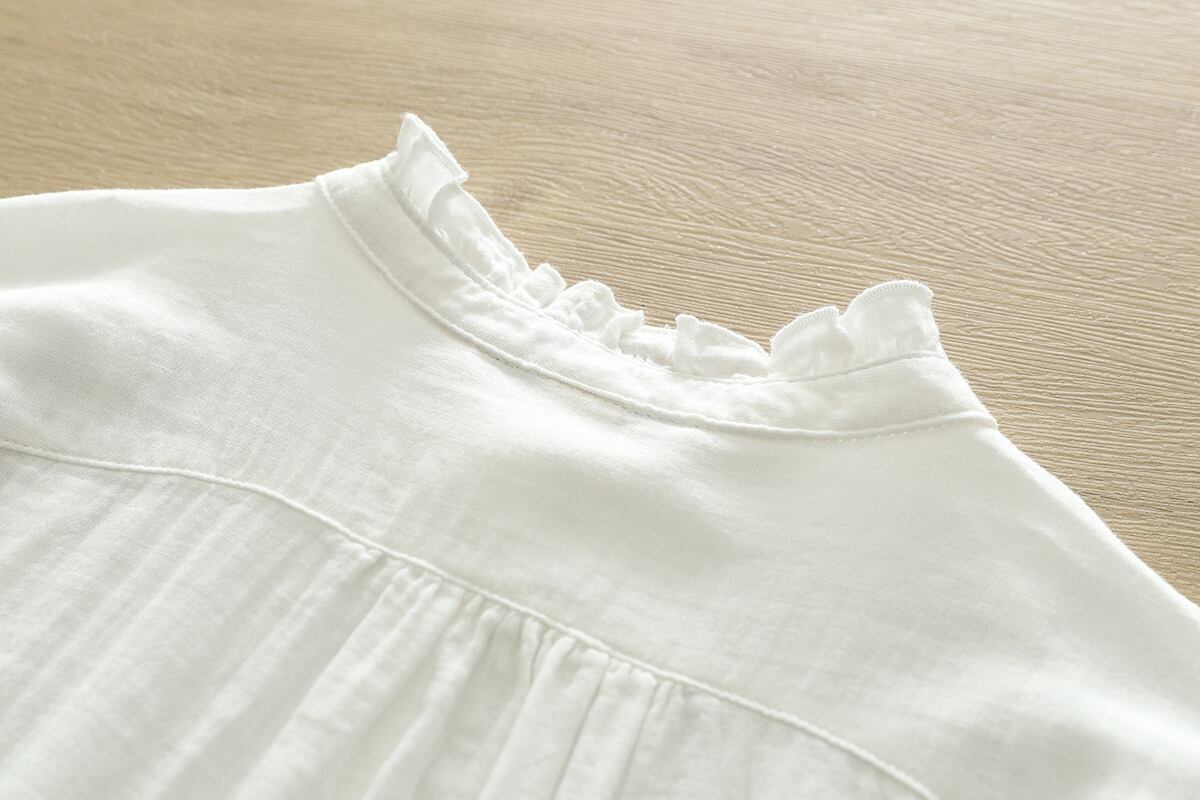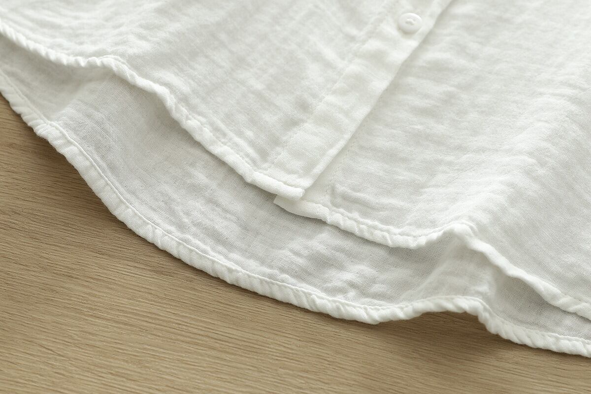 少しハイネックの長袖シャツは、薄手のコットン生地を使用し、軽やかな着心地を実現。