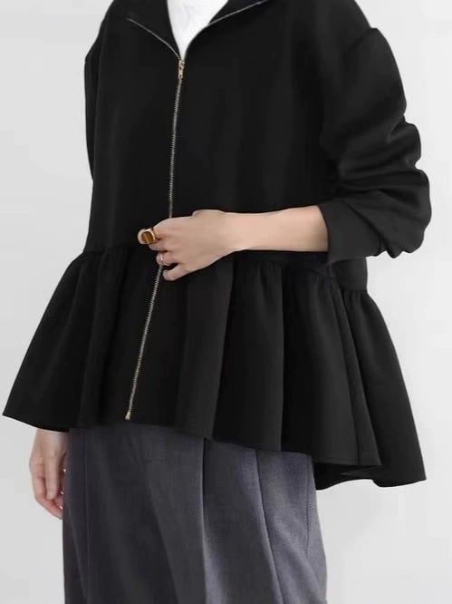 シンプルな前開きデザインながら、フレアペプラムのシルエットは動くたびに優雅さを演出します。